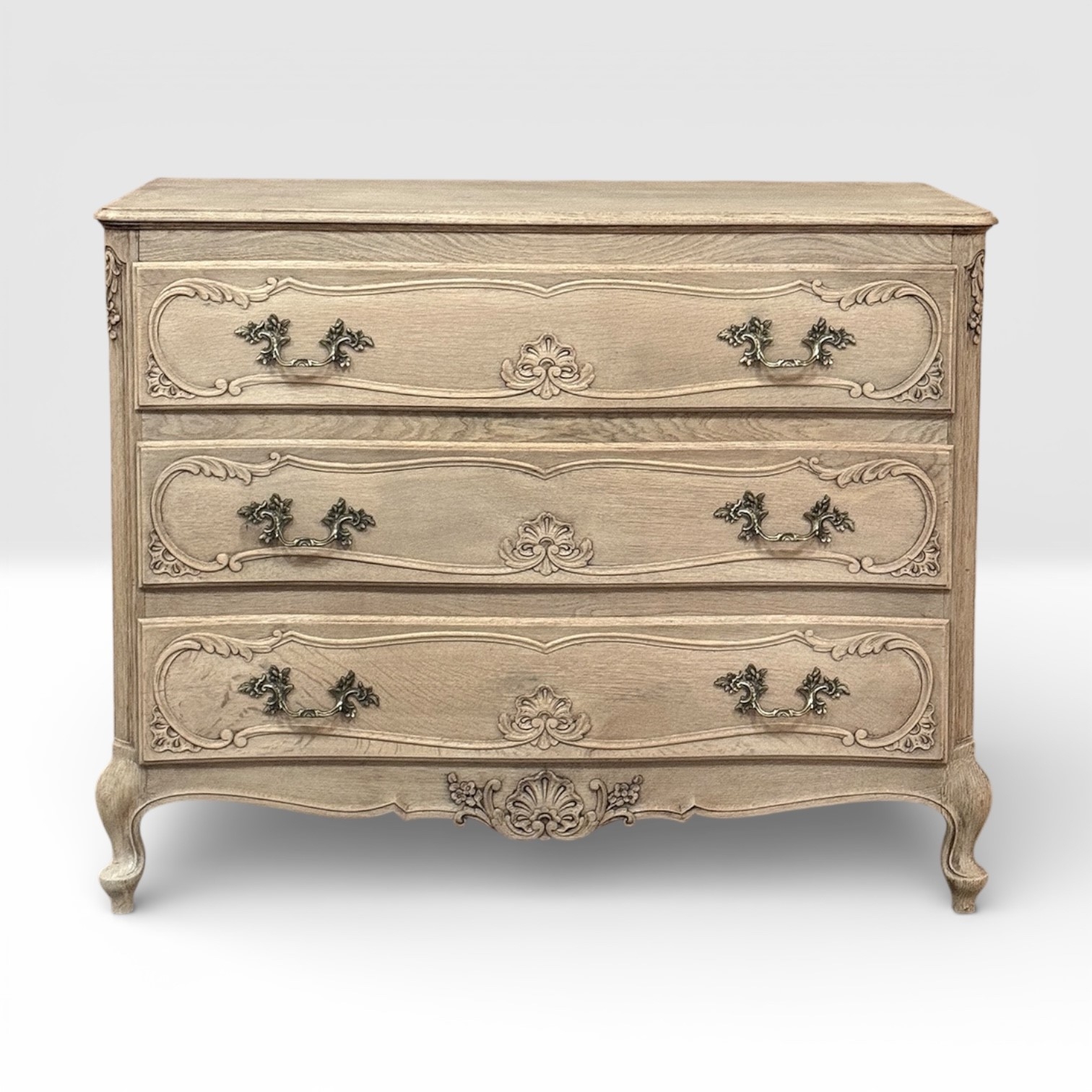 Inspired by the storied cabinetry of Liège, this beautifully crafted oak commode reflects the graceful movement of the Louis XV tradition, interpreted with the slightly simplified strength that defines the Liégeois aesthetic. The façade flows with gentle curves, carved scrollwork, and a shaped apron that lends the piece its unmistakable European character.