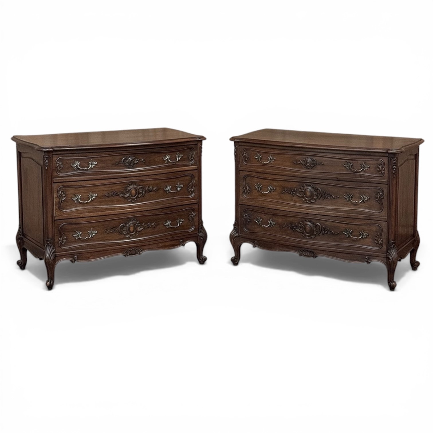 Each commode is fitted with original-style bronze hardware, thoughtfully scaled and placed to complement the carved decoration without overwhelming it. The apron is subtly shaped and finished with carved detailing, rising on elegant cabriole legs adorned with scallop shell motif that lend lightness and poise to the overall form.