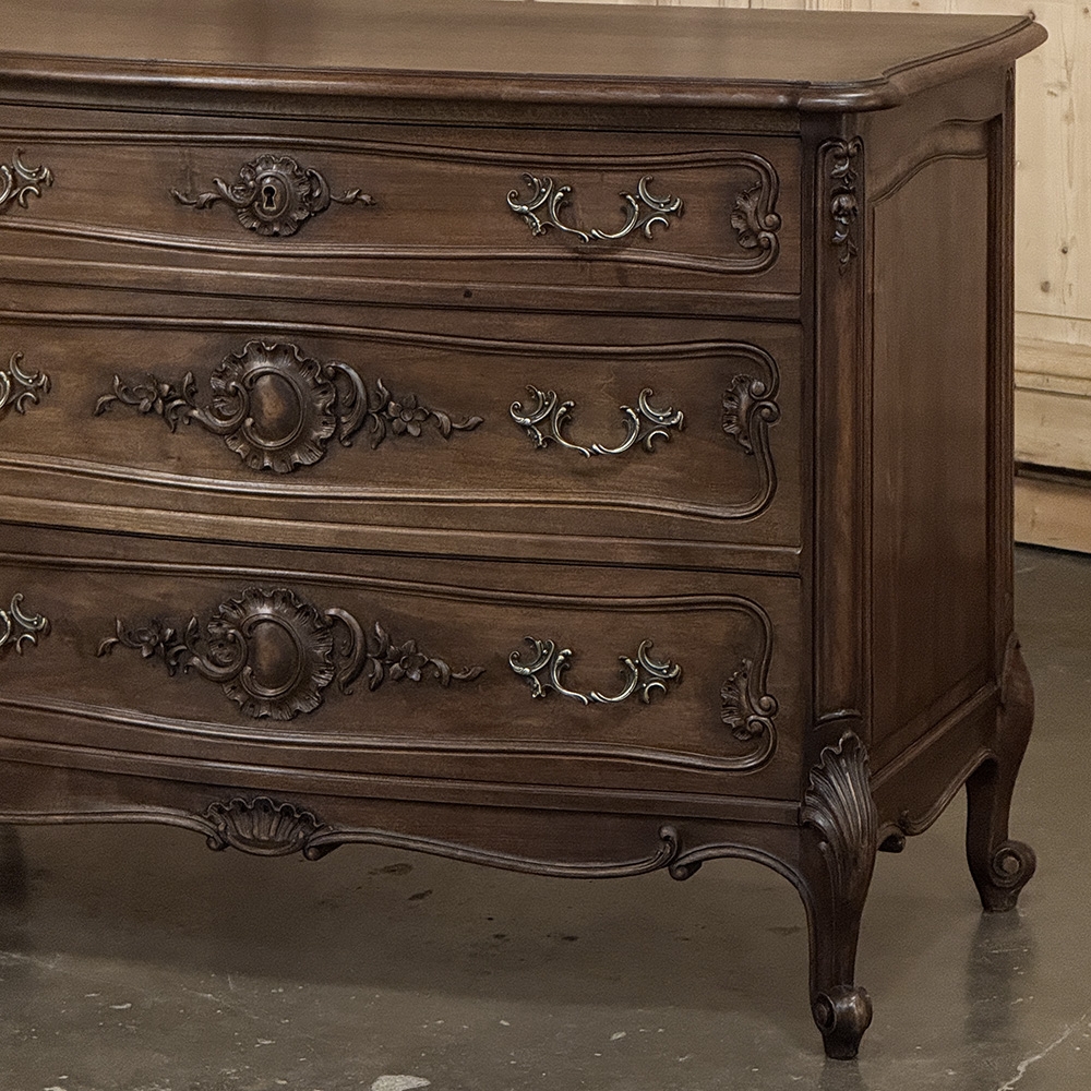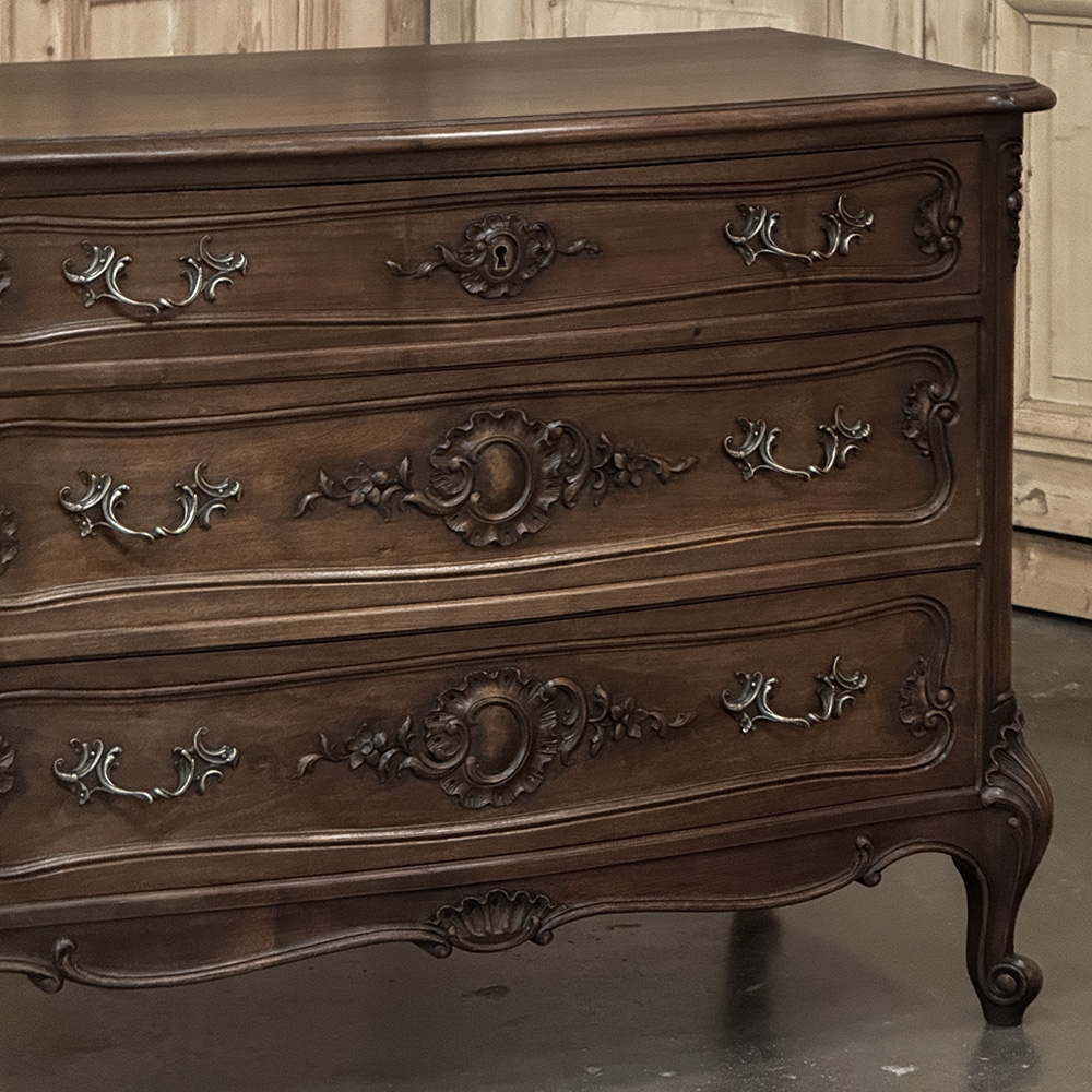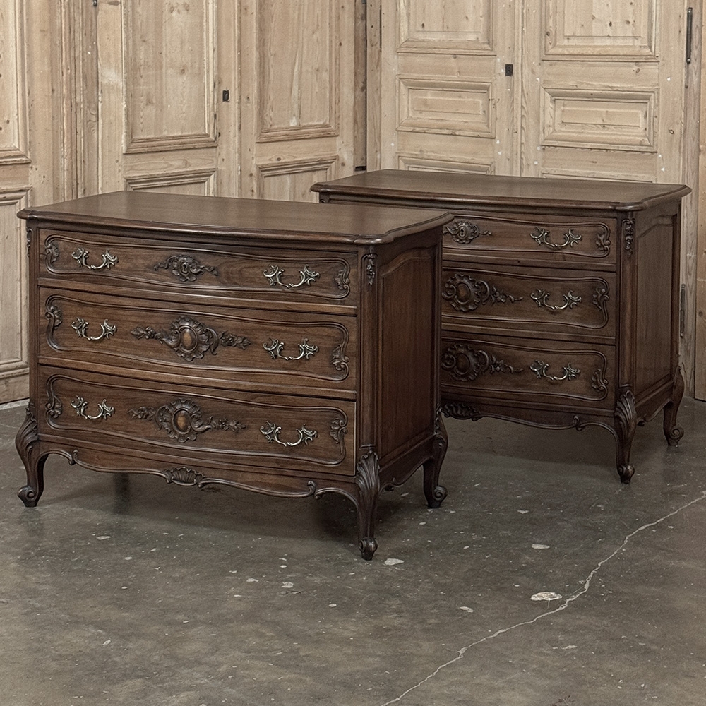 This beautifully matched PAIR of Antique French Louis XV Walnut Commodes ~ Chests of Drawers was meticulously hand-crafted in richly toned walnut and shaped with the graceful movement that defines the period. The subtly bowed fronts and softly rounded corners create a sense of fluidity, while the finely carved drawer fronts are adorned with delicate foliate and stylized shell motifs, centered by sculptural cartouches.