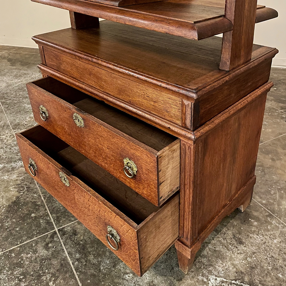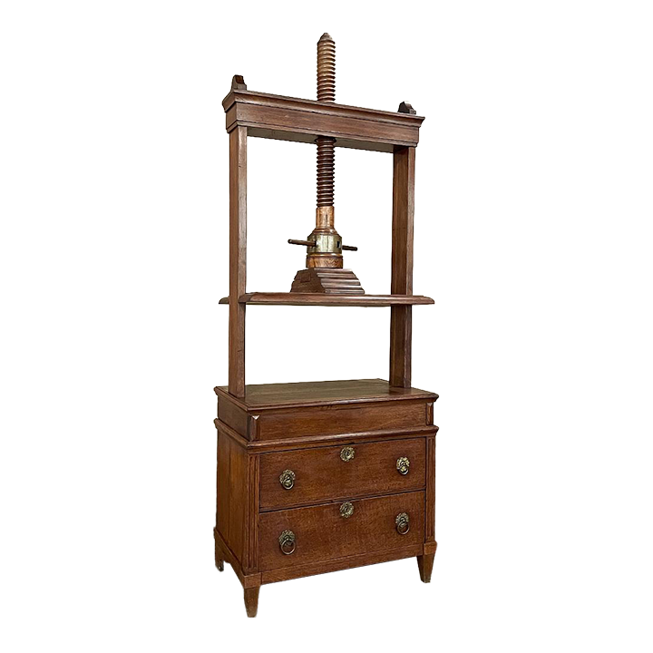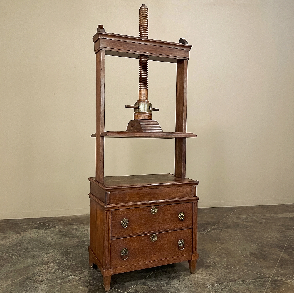 Rare 18th Century Dutch Printer's Paper Press is a superlative artifact from a bygone era, that will provide storage like a chest of drawers, an intriguing table surface, and the start of many interesting conversations! Two centuries ago paper was not as refined as we enjoy today, and once a press imprinted ink on the paper, it would curl and wrinkle up unless it was pressed into a device like this, designed to flatten the paper until the ink fully dried, and keep it tightly pressed indefinitely until ready to be removed. Using the same devices that a grape harvester would recognize, or even a bosun's mate about to raise anchor, the central shaft was carved with spiral screw threads and fitted with a brass-reinforced capstan into which a squared dowel would be inserted allowing leverage to raise or lower the press. Extra paper would be housed in the attractively accented drawers below, each fitted with embossed brass pulls and a key guard. For today's usage, one can easily take advantage of the drawers' storage capabilities, while having an interesting table surface above. The design possibilities are numerous!