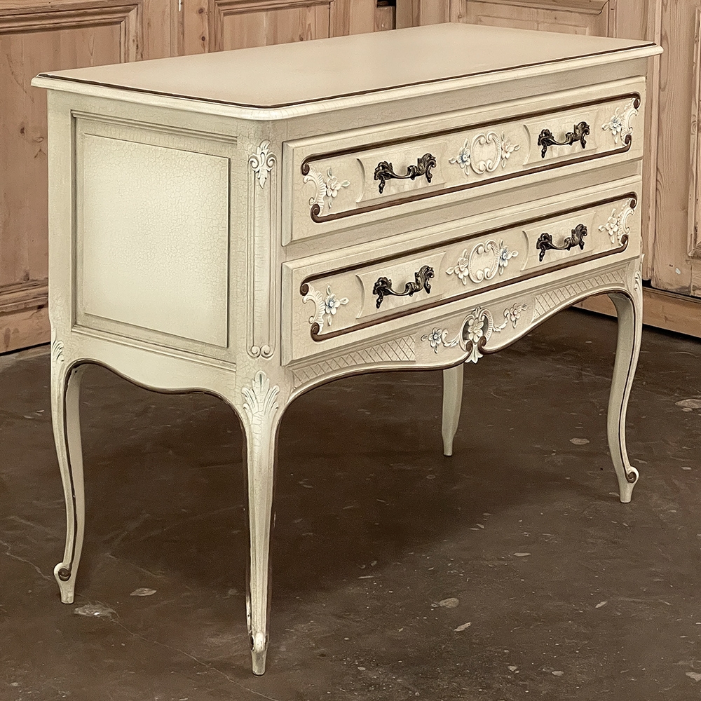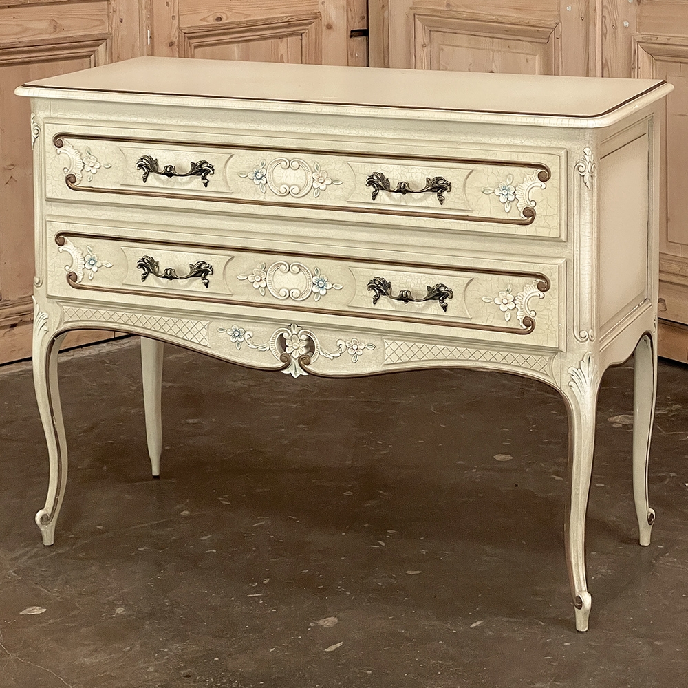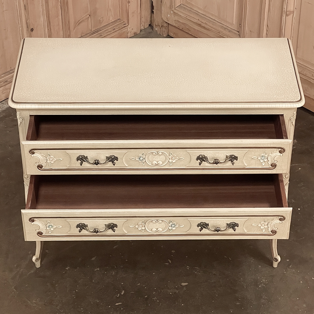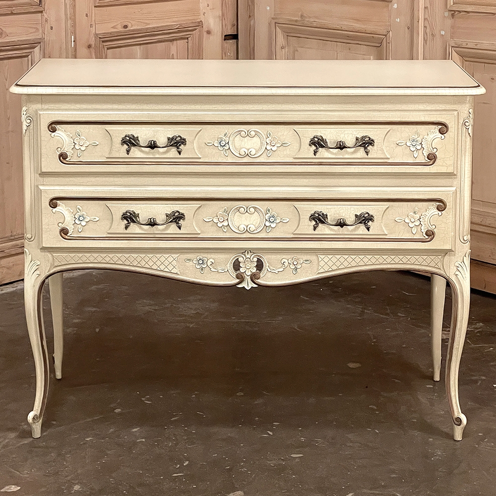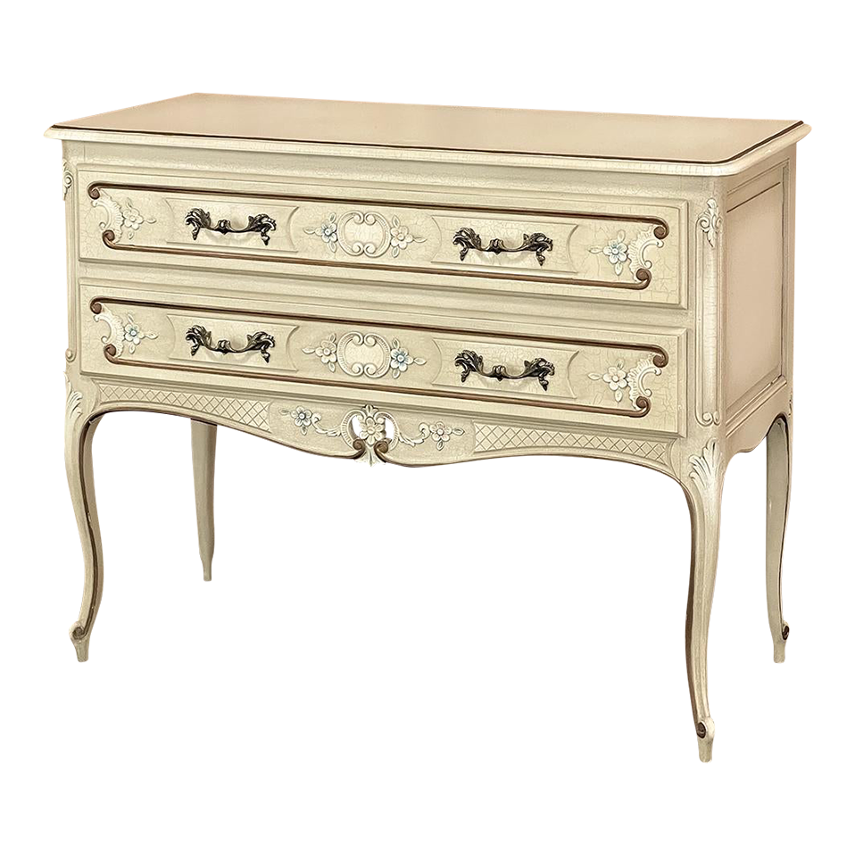 Vintage French Provincial Painted Commode will make a charming addition to any room! The ivory/beige painted finish has achieved a lovely patina, and is highlighted with gold accents on the molded detail which frames the pair of drawers, the apron and around the top rim. Carved shell and floral motifs with subtle painted accents adorn the facade, with cross hatching on the apron flanking the pierce-carved central accent. Even the cornerposts have been embellished with acanthus plumes and are tipped with escargot feet.