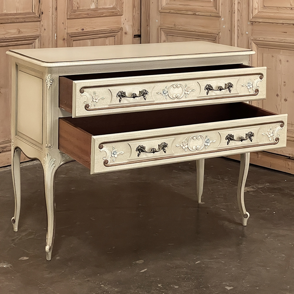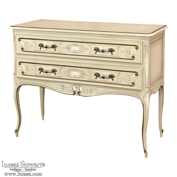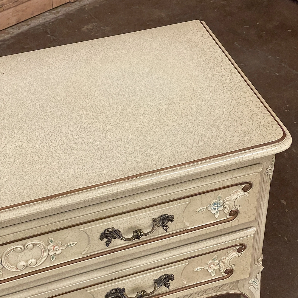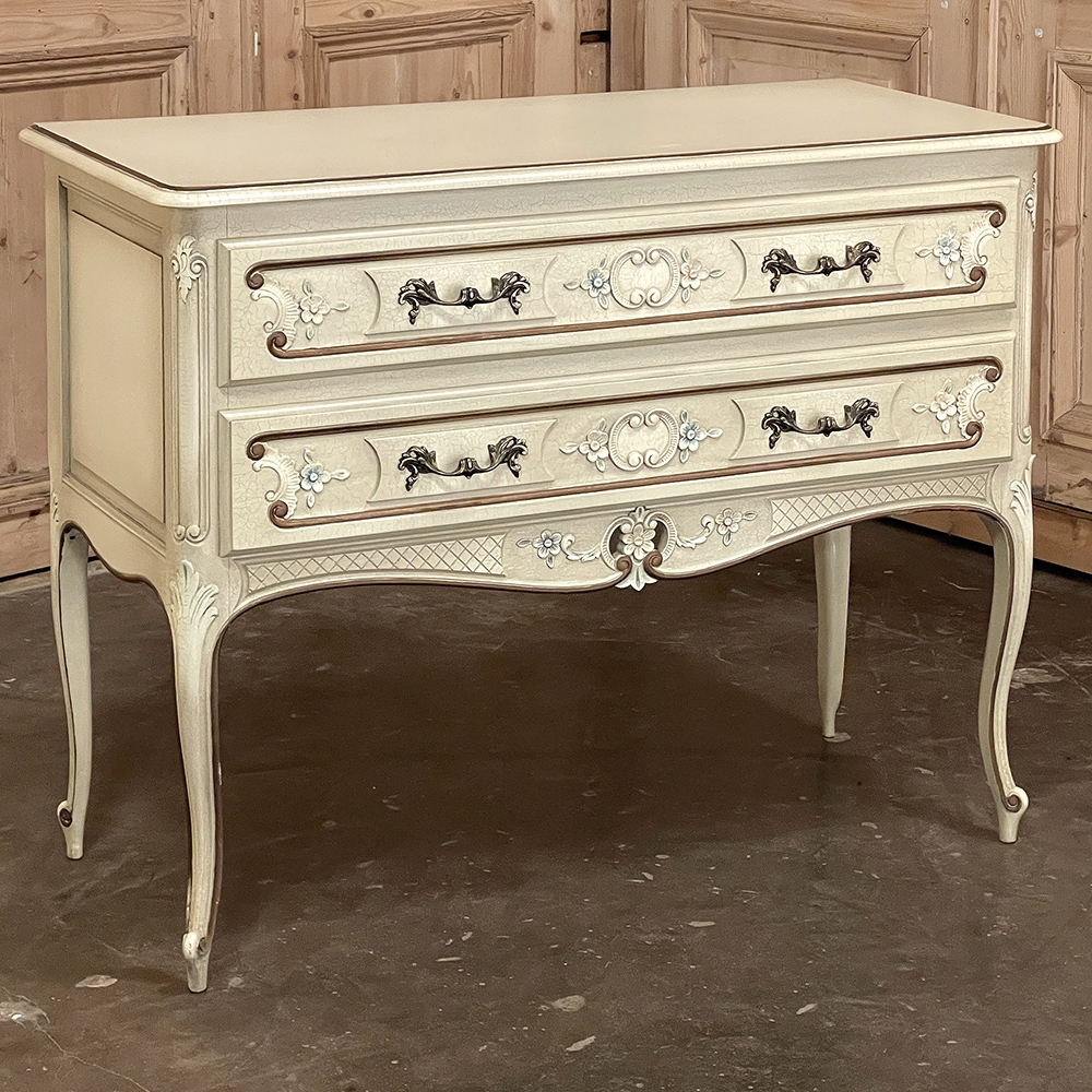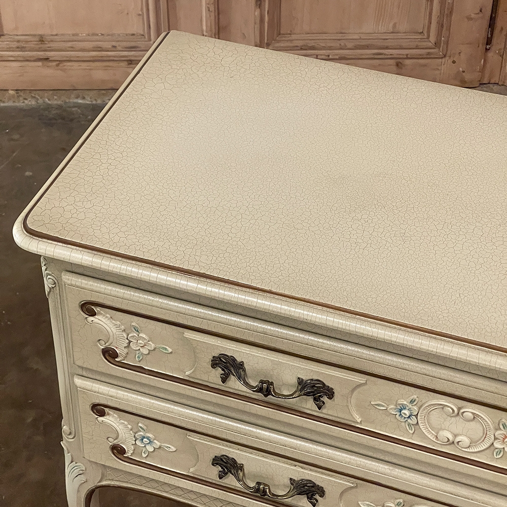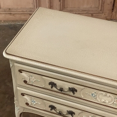 Vintage French Provincial Painted Commode will make a charming addition to any room! The ivory/beige painted finish has achieved a lovely patina, and is highlighted with gold accents on the molded detail which frames the pair of drawers, the apron and around the top rim. Carved shell and floral motifs with subtle painted accents adorn the facade, with cross hatching on the apron flanking the pierce-carved central accent. Even the cornerposts have been embellished with acanthus plumes and are tipped with escargot feet.