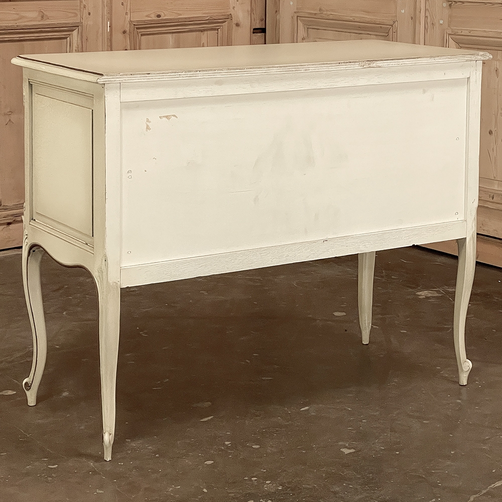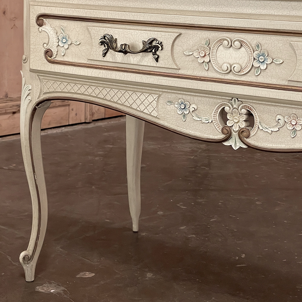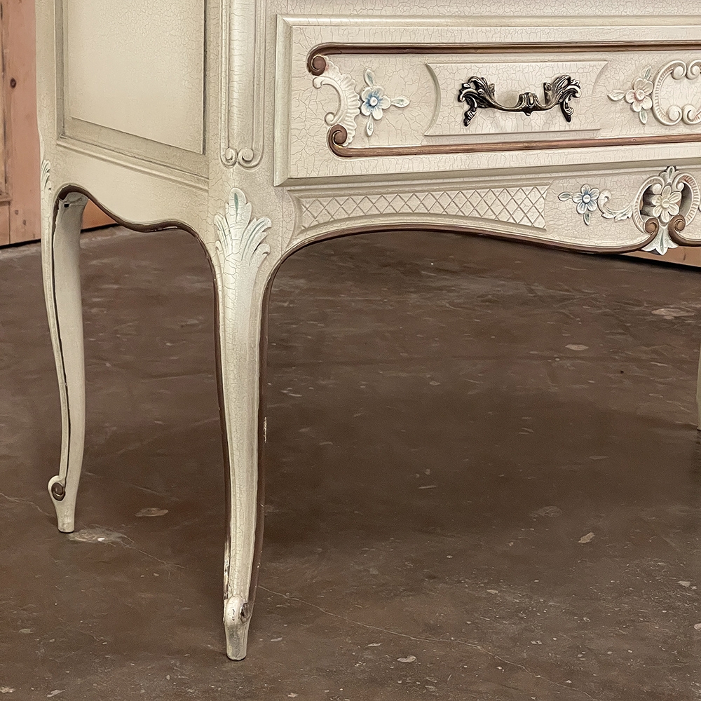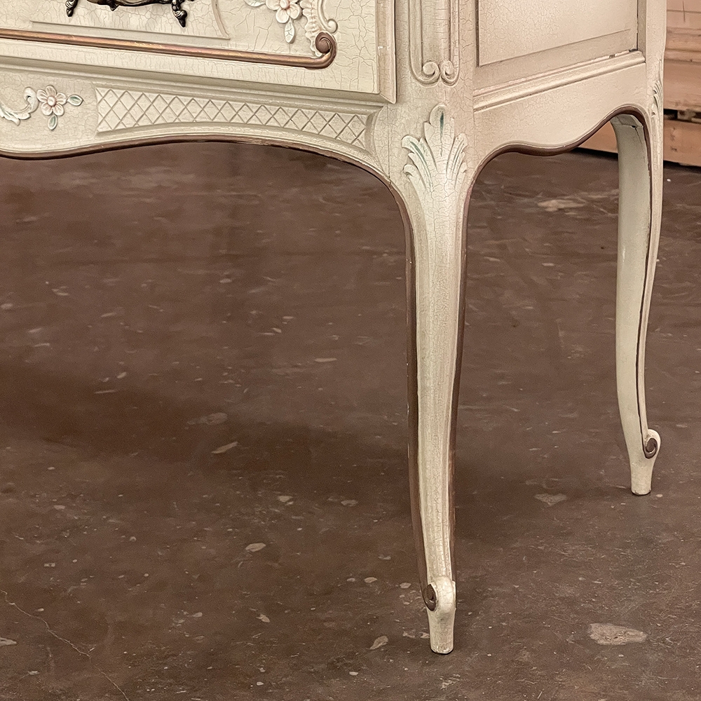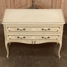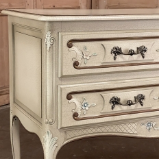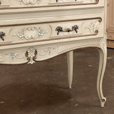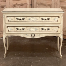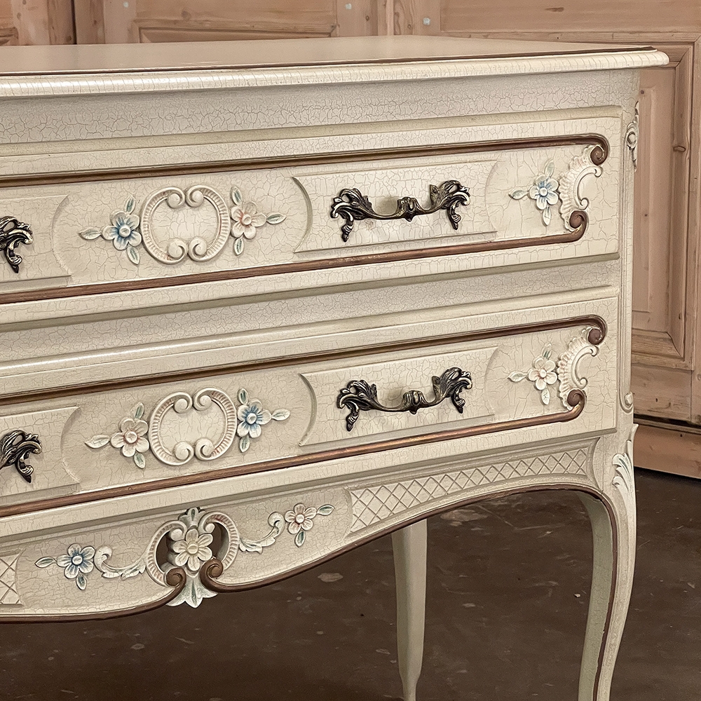 Vintage French Provincial Painted Commode will make a charming addition to any room! The ivory/beige painted finish has achieved a lovely patina, and is highlighted with gold accents on the molded detail which frames the pair of drawers, the apron and around the top rim. Carved shell and floral motifs with subtle painted accents adorn the facade, with cross hatching on the apron flanking the pierce-carved central accent. Even the cornerposts have been embellished with acanthus plumes and are tipped with escargot feet.