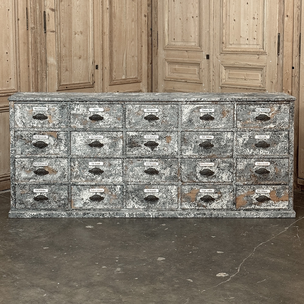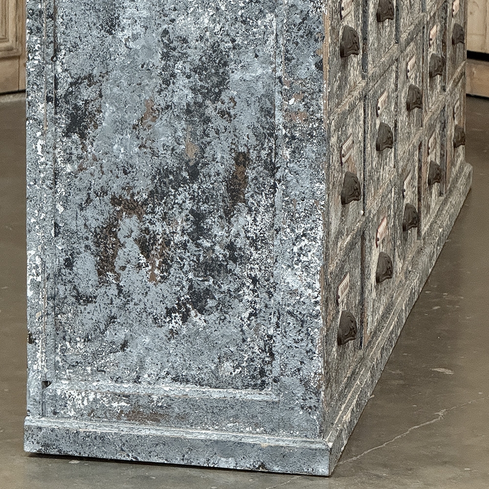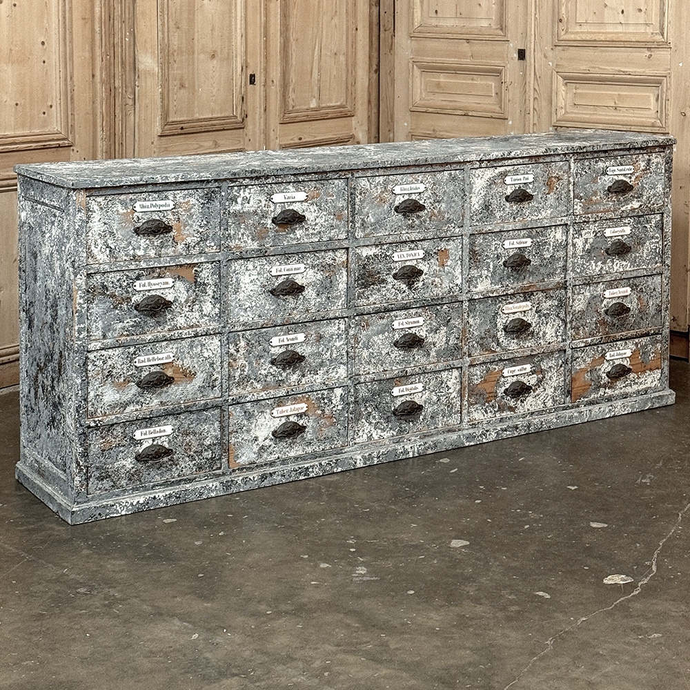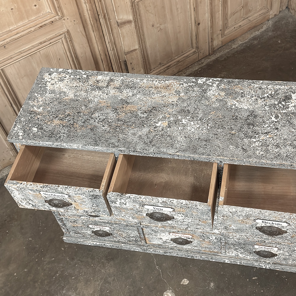Antique Apothecary Cabinet ~ Credenza in Distressed Painted Pine will make a splendid addition to your family room! Constructed out of solid yellow pine known for its durability, it features no less than 20 drawers, each with its own cast iron drawer pull and hand-painted enamel label, signifying in Latin what potion, medicine or compound is within. At some point a distressed painted finish was applied, adding even more visual charm. The height is perfect to serve as a centerpiece in the room, perhaps with a giant flat panel TV on top. An ideal storage cabinet, one can keep everything tidy and organized. The depth is very shallow as well, providing a minimal impact on the traffic flow of the room.
