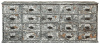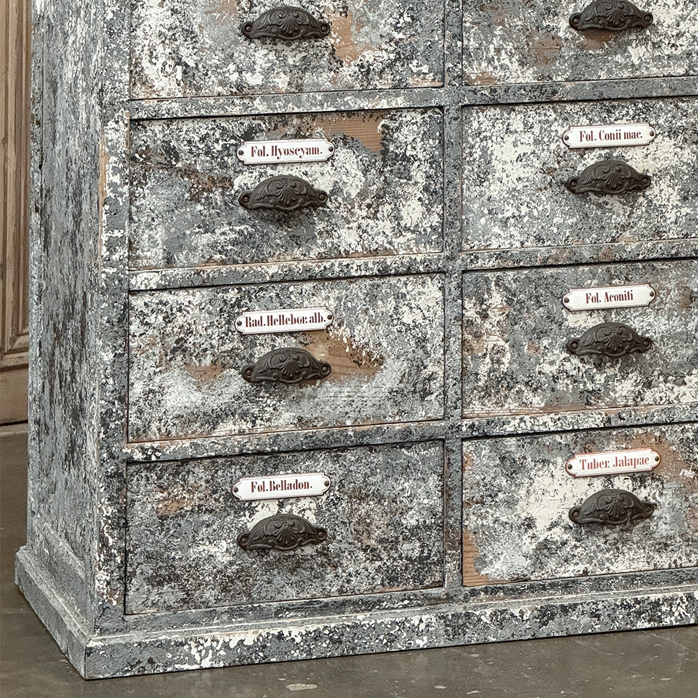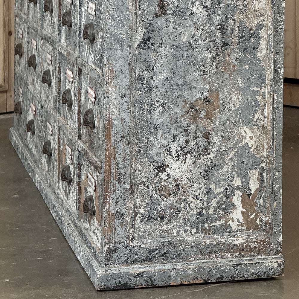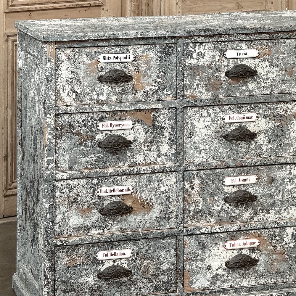 Antique Apothecary Cabinet ~ Credenza in Distressed Painted Pine will make a splendid addition to your family room! Constructed out of solid yellow pine known for its durability, it features no less than 20 drawers, each with its own cast iron drawer pull and hand-painted enamel label, signifying in Latin what potion, medicine or compound is within. At some point a distressed painted finish was applied, adding even more visual charm. The height is perfect to serve as a centerpiece in the room, perhaps with a giant flat panel TV on top. An ideal storage cabinet, one can keep everything tidy and organized. The depth is very shallow as well, providing a minimal impact on the traffic flow of the room.