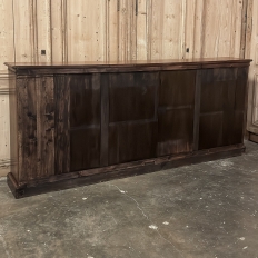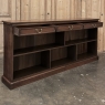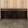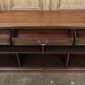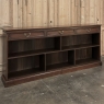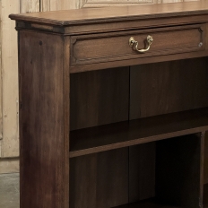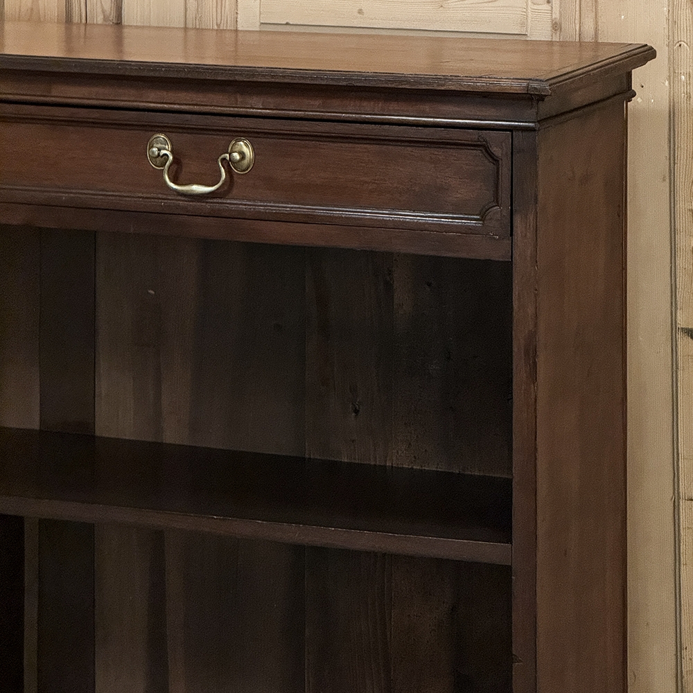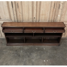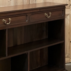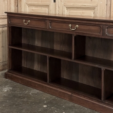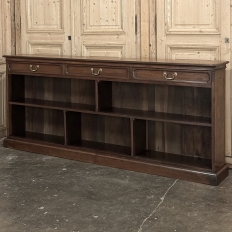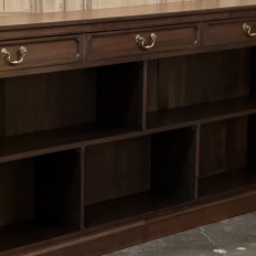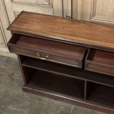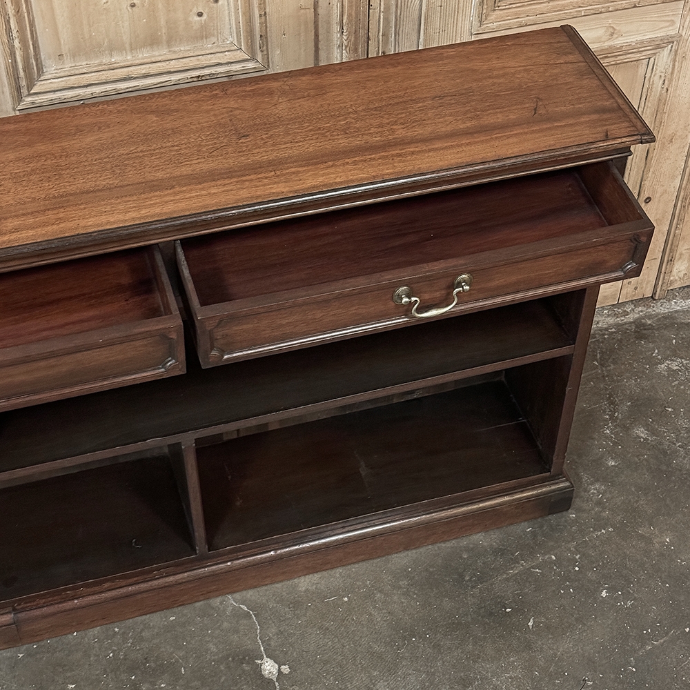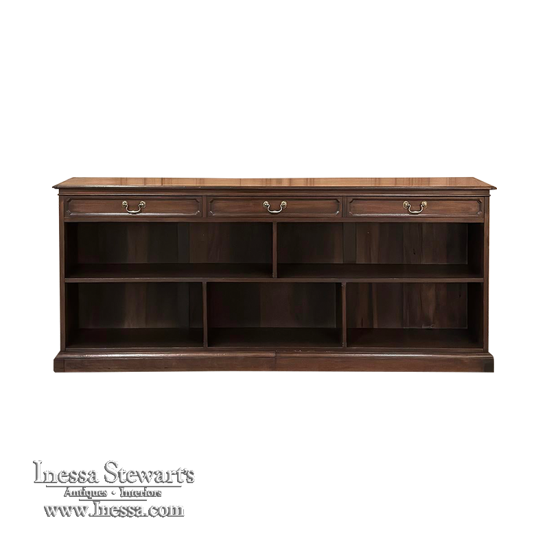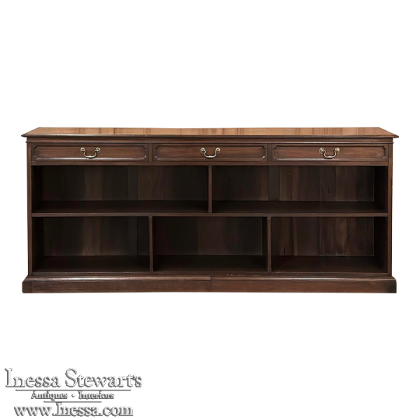 Antique English Credenza ~ Barrister's Bookcase exudes a stately elegance that will enhance any room, hallway, stairwell landing, or even behind a large sofa! The tailored lines include a rectilinear architecture enhanced with fine molding detail, and the design incorporates three spacious drawers across the top over a large segmented display space perfect for books or collectibles. Drawers are accessed with brass bale pulls. The shallow design is just over a foot deep meaning it will have a minimal impact on traffic patterns, while still providing a spacious surface for display, party treats, lamps, or anything else one can conjure. The richness of the mahogany only adds to the allure, making this a great choice for just about any style flair.