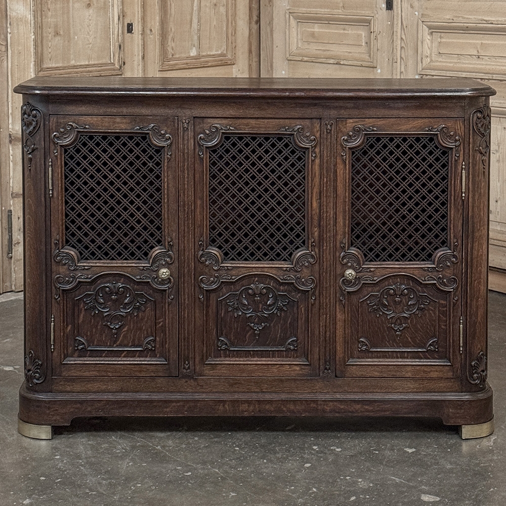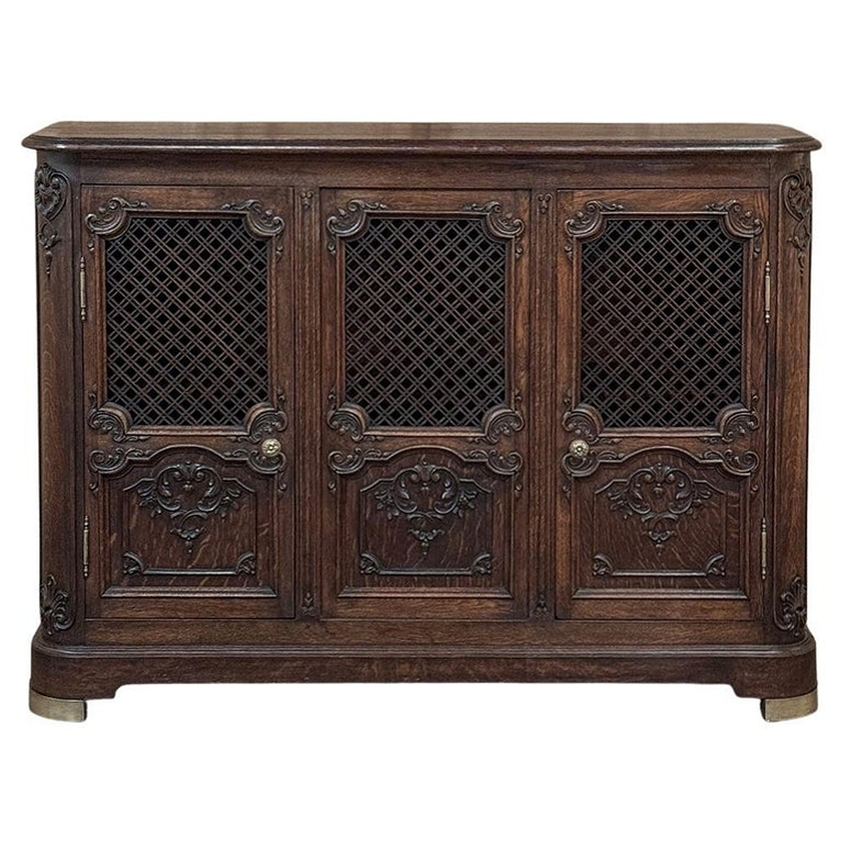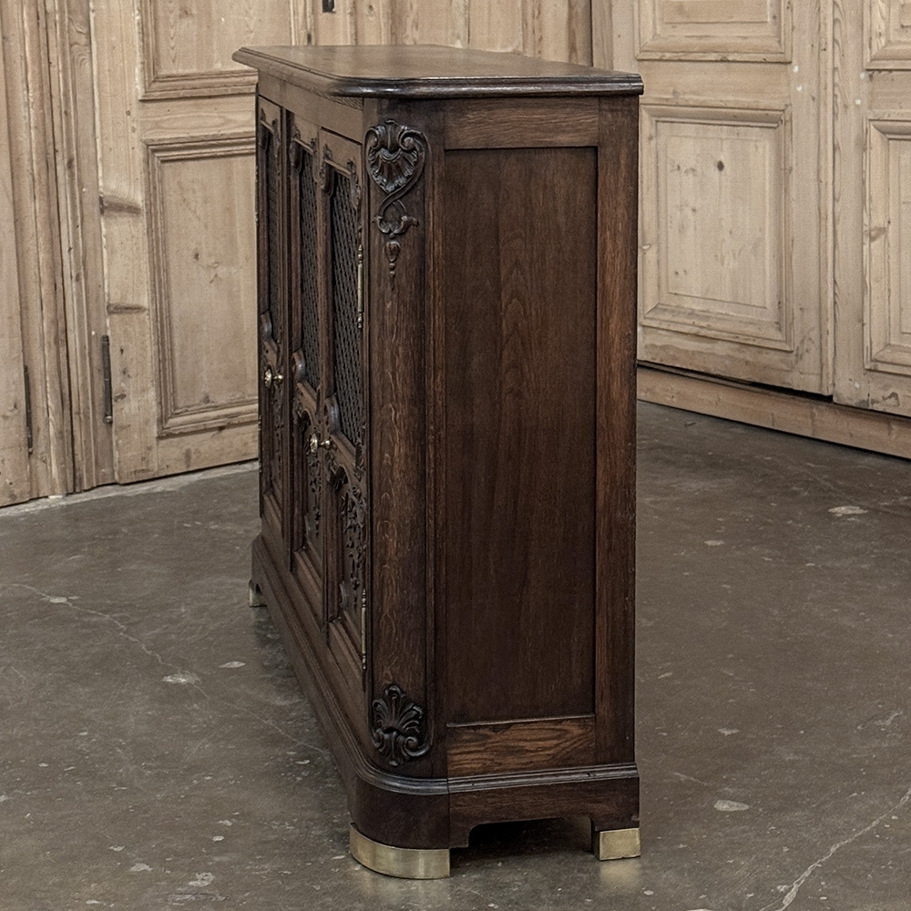 Antique Liegoise Louis XIV Credenza with Lattice Doors is a remarkably well preserved example of the fine craftsmanship produced in the region for centuries! Hand-crafted from indigenous old-growth oak, it features a classical architecture embellished by carved detail inspired by the Baroque period of which the Sun King was so fond. The design is exceptionally shallow, making it ideal for placement in a hall, entryway, or even behind a tall sofa. Rounded corners enhance its traffic friendly characteristic. The rounded corners are carved to complement the three lower door panels, with the upper doors fitted with brass lattice for a distinctive look, with brass foot guards below as a nice accent. Doors open on brass barrel hinges via cast brass knobs to reveal two tiers of display and storage space within.