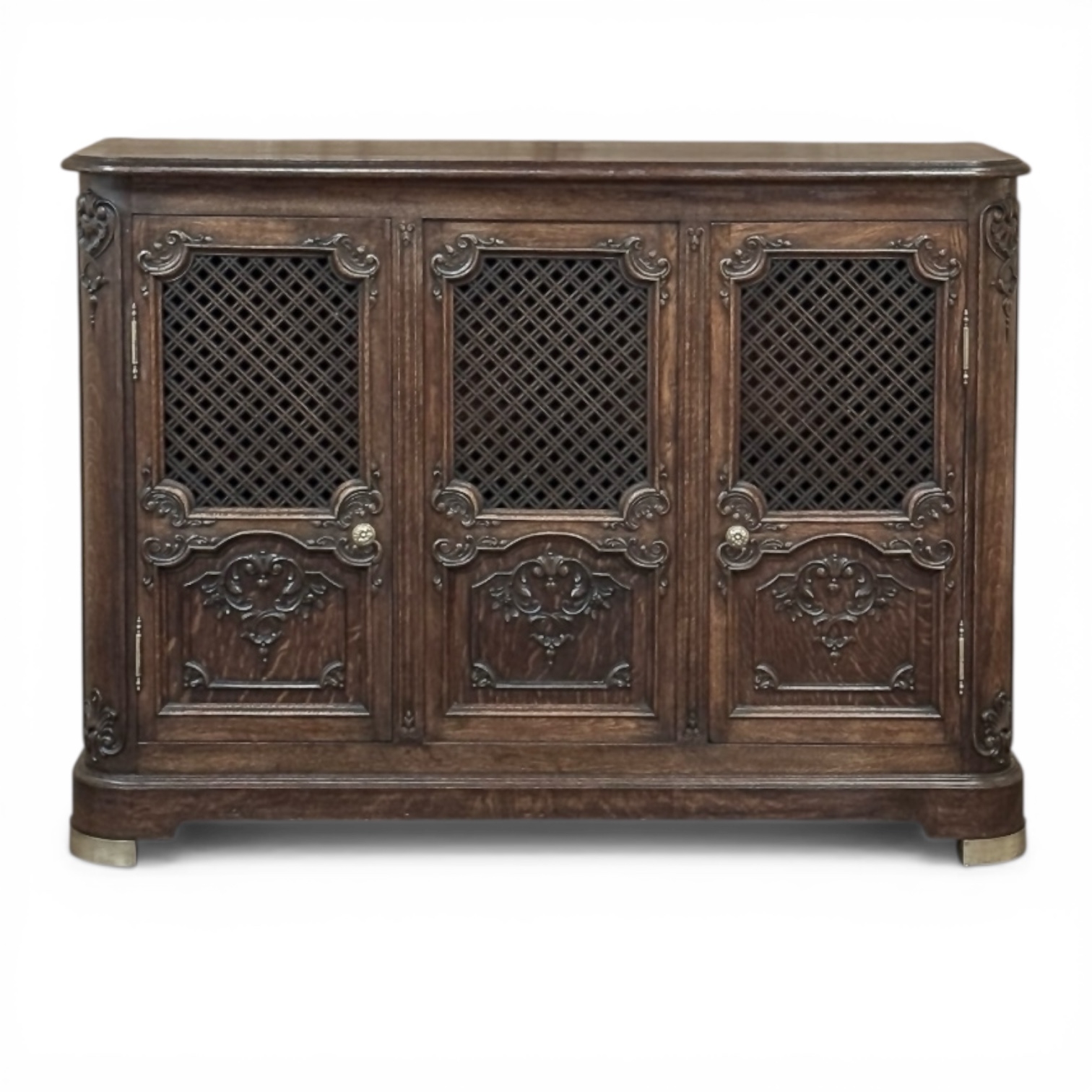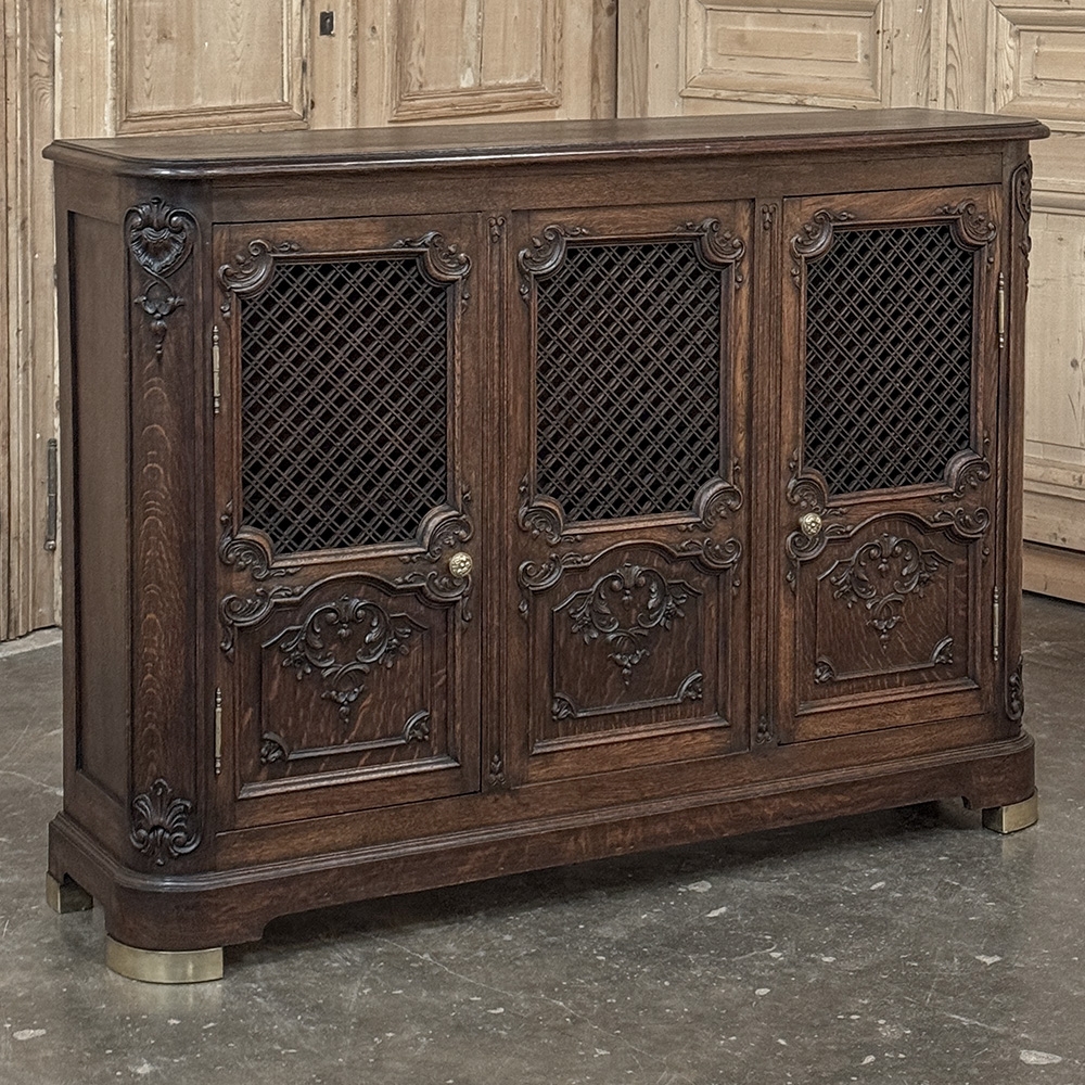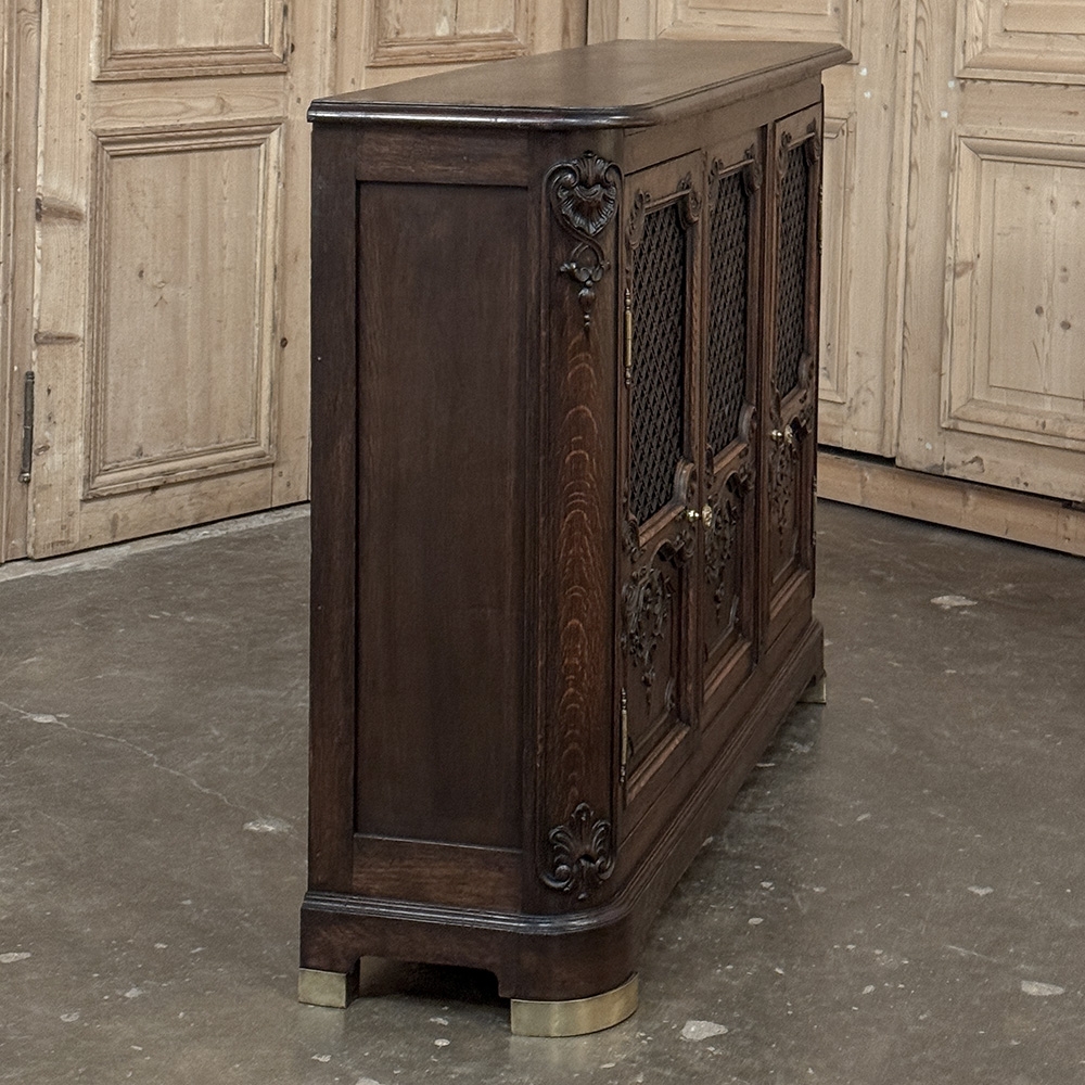 Antique Liegoise Louis XIV Credenza with Lattice Doors is a remarkably well preserved example of the fine craftsmanship produced in the region for centuries! Hand-crafted from indigenous old-growth oak, it features a classical architecture embellished by carved detail inspired by the Baroque period of which the Sun King was so fond. The design is exceptionally shallow, making it ideal for placement in a hall, entryway, or even behind a tall sofa. Rounded corners enhance its traffic friendly characteristic. The rounded corners are carved to complement the three lower door panels, with the upper doors fitted with brass lattice for a distinctive look, with brass foot guards below as a nice accent. Doors open on brass barrel hinges via cast brass knobs to reveal two tiers of display and storage space within.