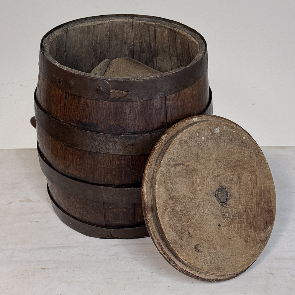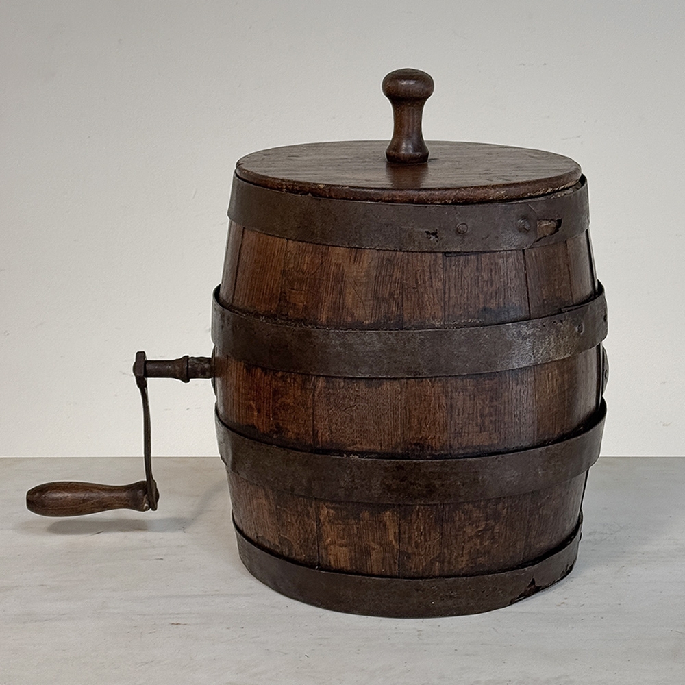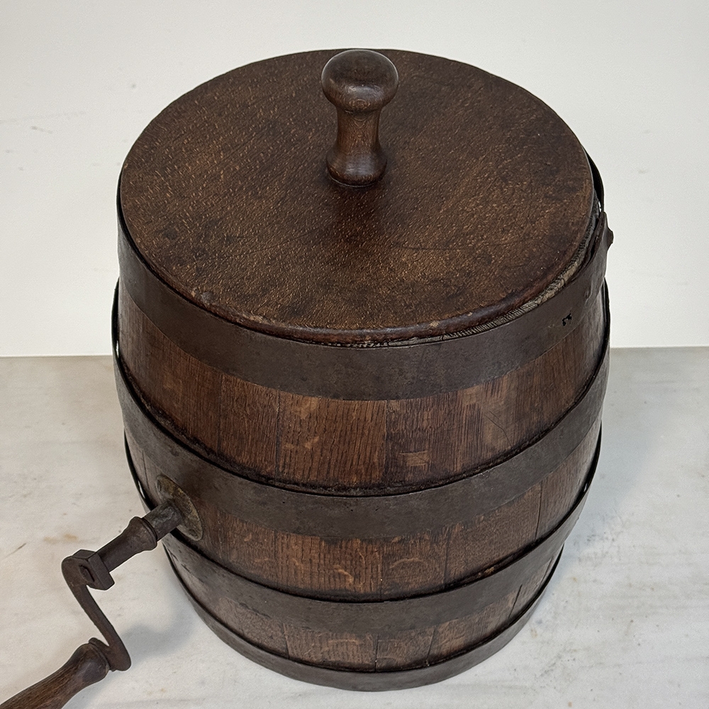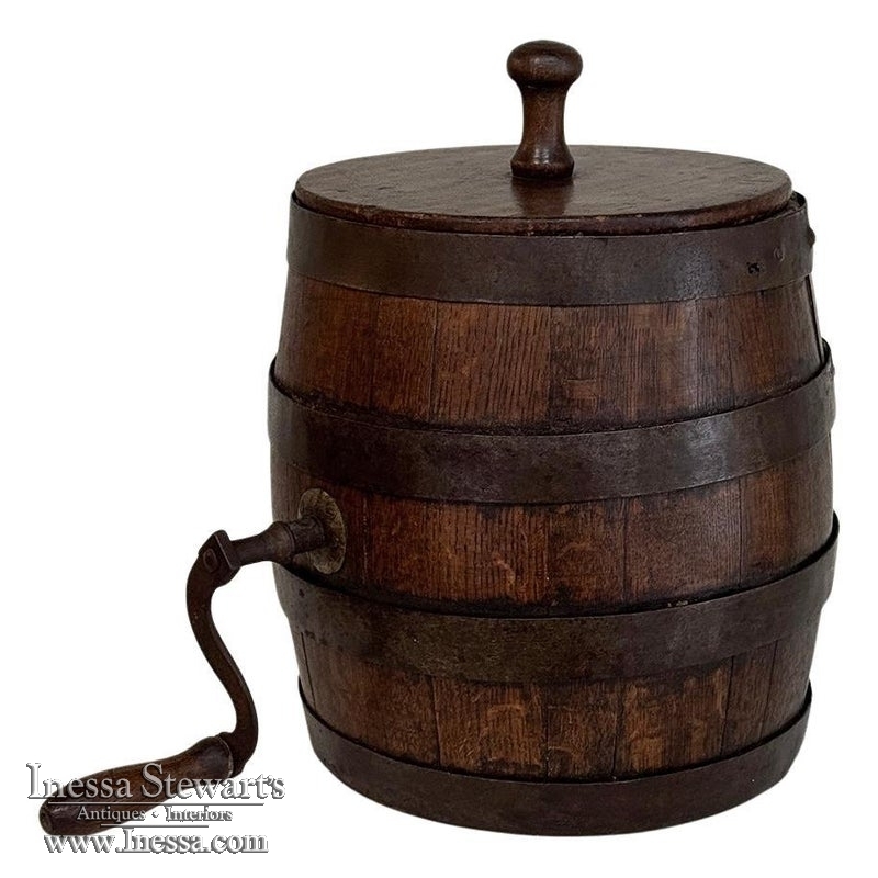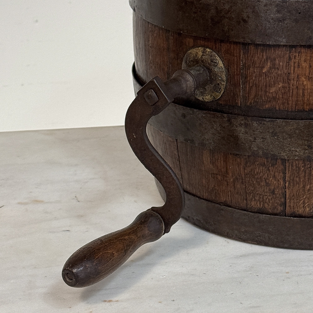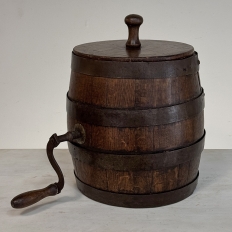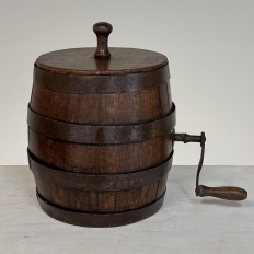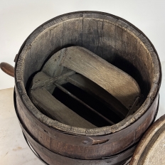 18th Century Hand-Made Oak Stave Butter Churn was lovingly crafted by the town's barrel cooper in the same general manner which he produced barrels for food and wine storage. Oak staves were steamed and bowed, then held in place by hand-welded iron straps. The churn was created with a slotted paddle connected to a hand-crank, also fashioned from iron and oak, and a lid was supplied with turned handle for easy access. Back before the days of mega marts and grocery stores, such devices kept a family or two in fresh butter for weeks at a time!