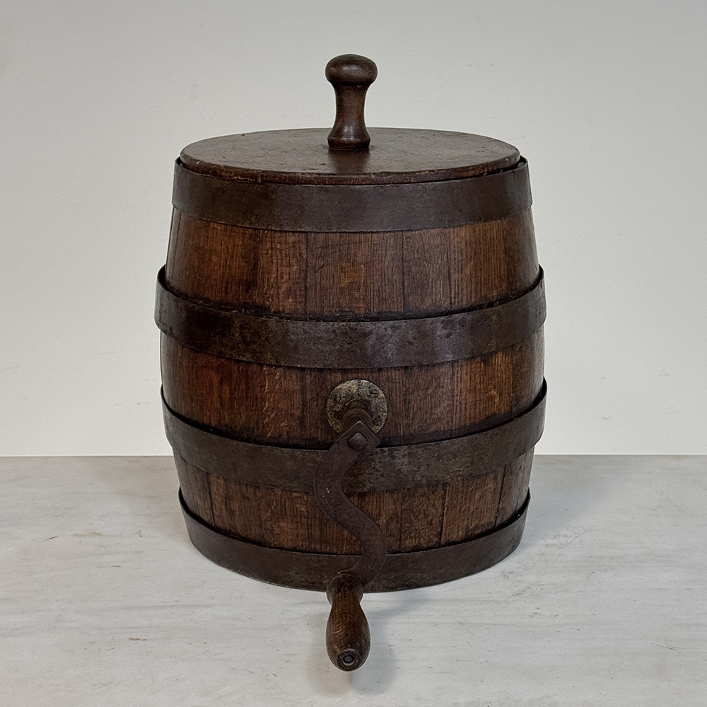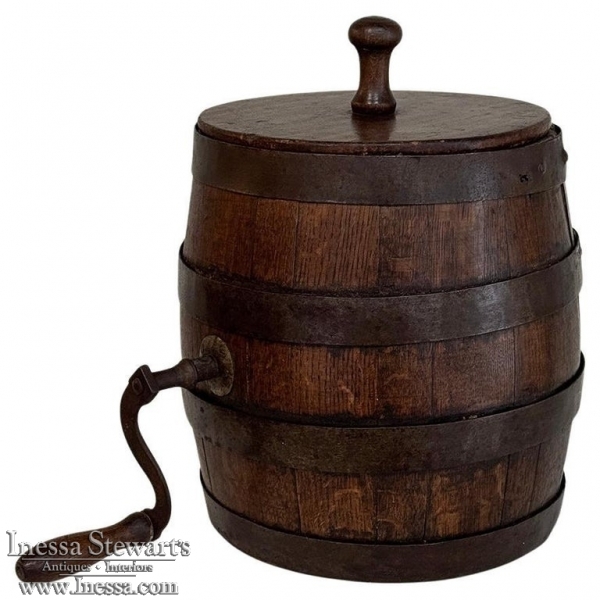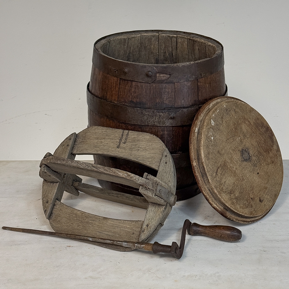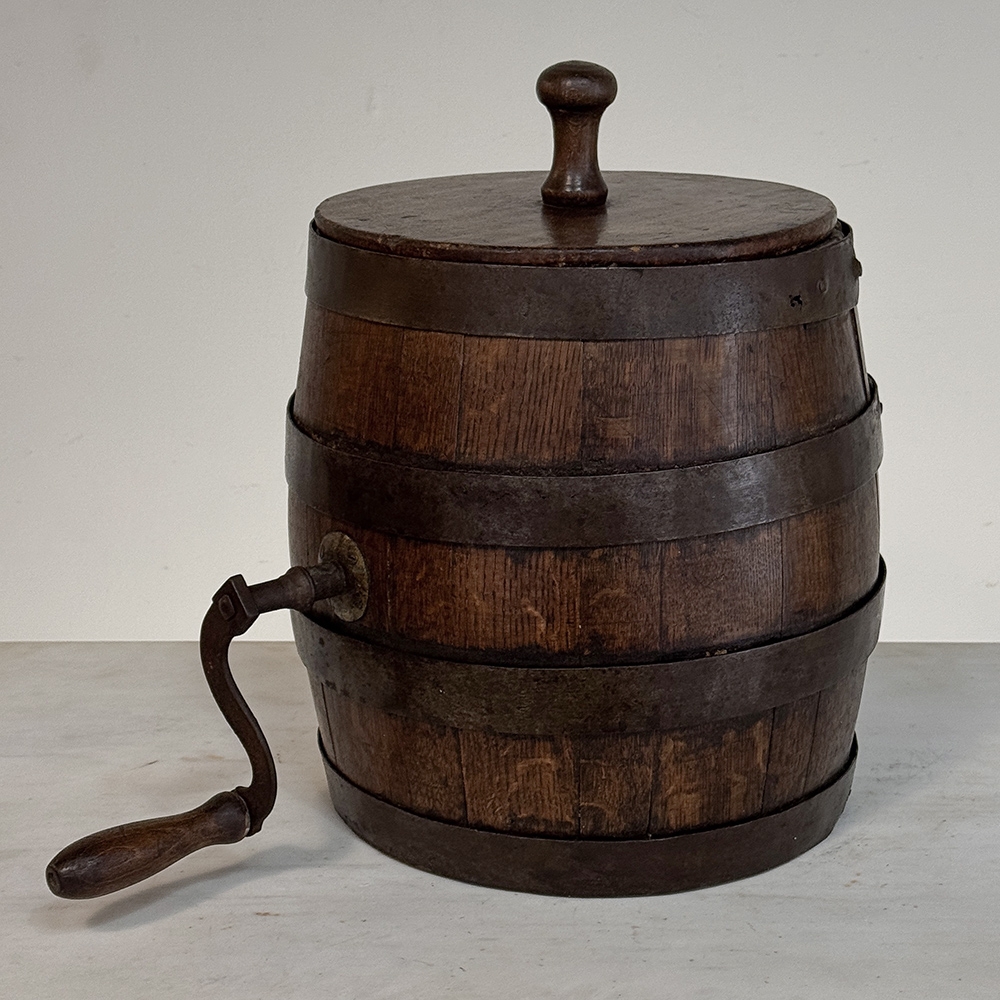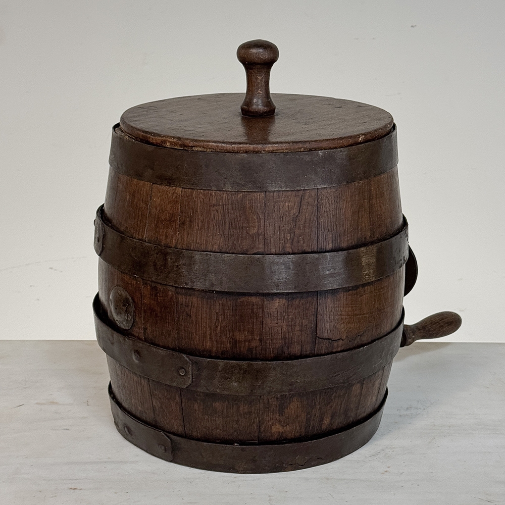 18th Century Hand-Made Oak Stave Butter Churn was lovingly crafted by the town's barrel cooper in the same general manner which he produced barrels for food and wine storage. Oak staves were steamed and bowed, then held in place by hand-welded iron straps. The churn was created with a slotted paddle connected to a hand-crank, also fashioned from iron and oak, and a lid was supplied with turned handle for easy access. Back before the days of mega marts and grocery stores, such devices kept a family or two in fresh butter for weeks at a time!