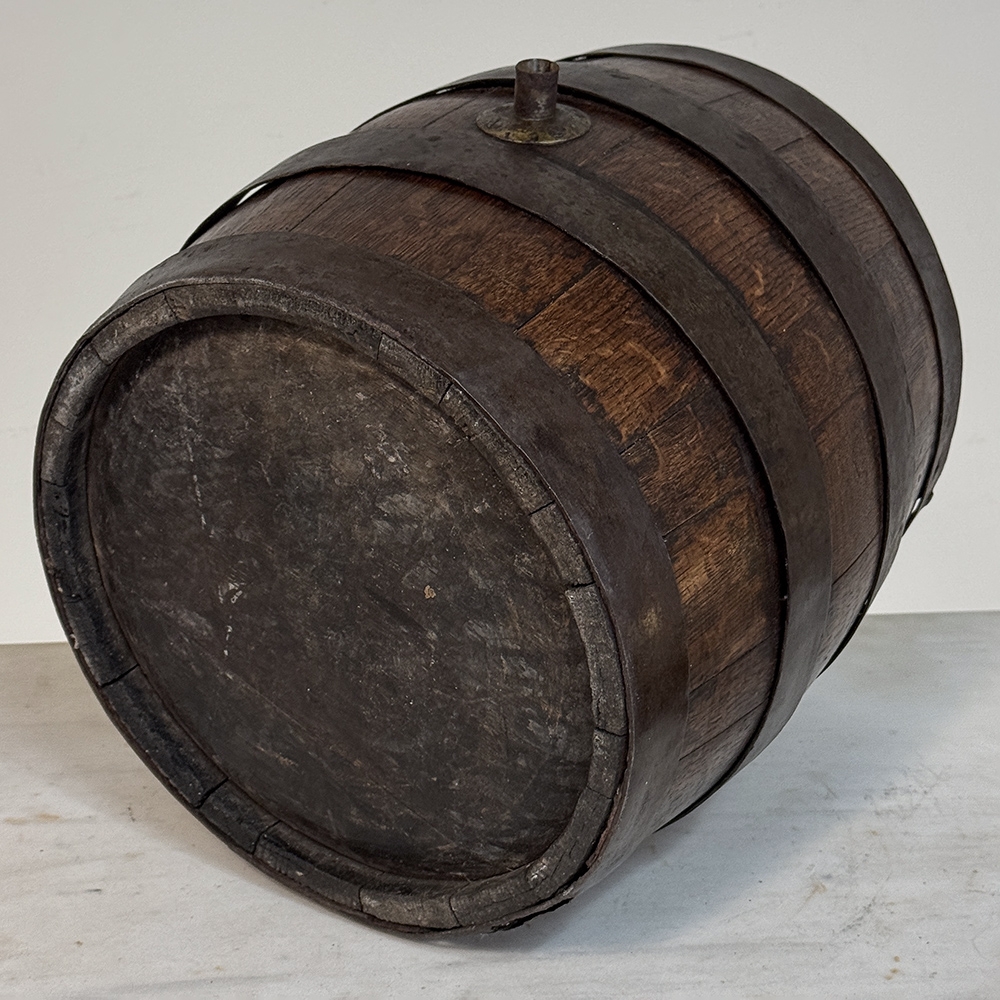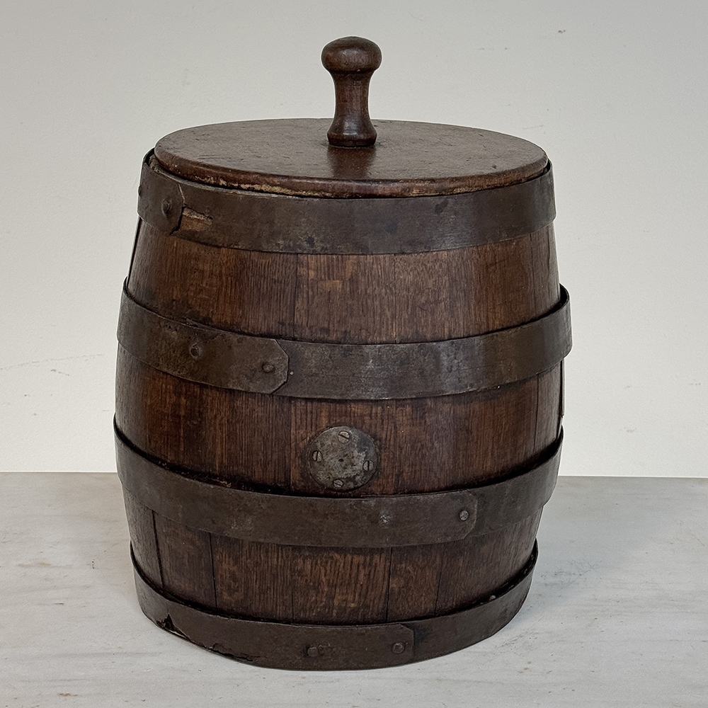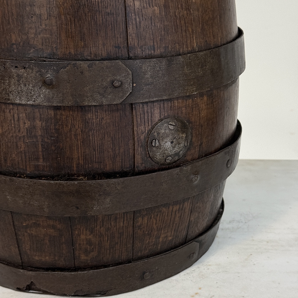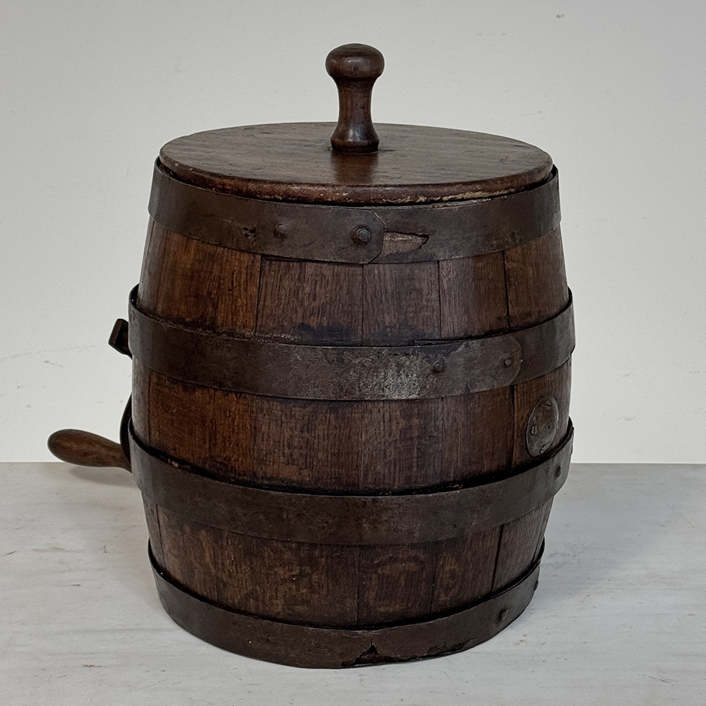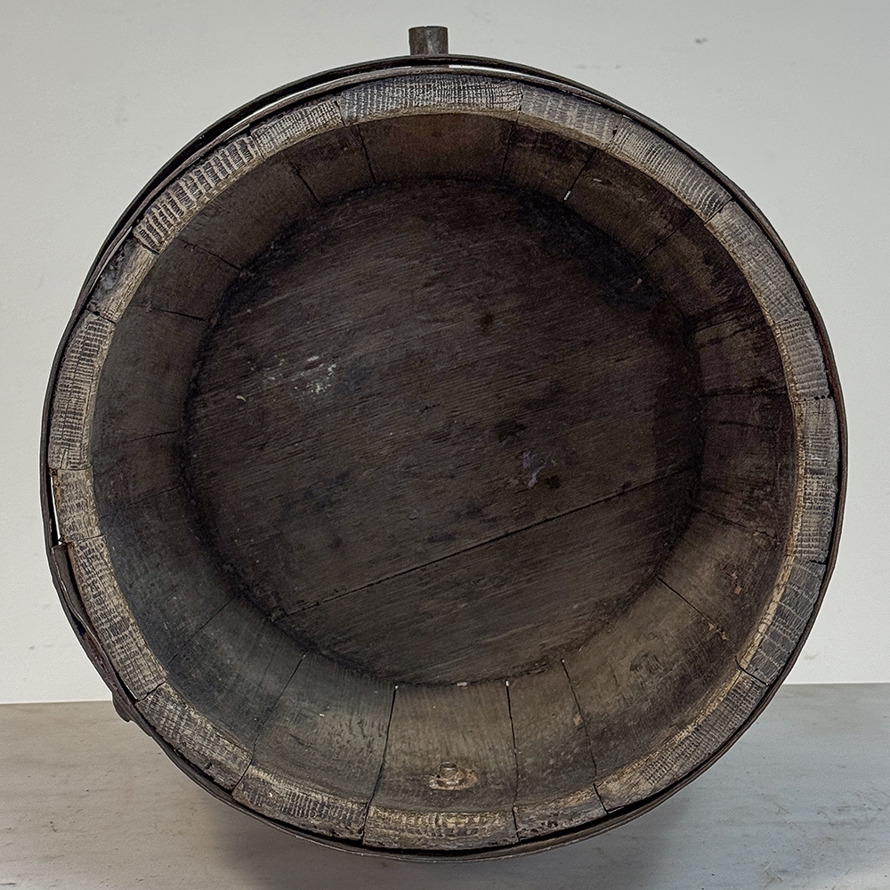 18th Century Hand-Made Oak Stave Butter Churn was lovingly crafted by the town's barrel cooper in the same general manner which he produced barrels for food and wine storage. Oak staves were steamed and bowed, then held in place by hand-welded iron straps. The churn was created with a slotted paddle connected to a hand-crank, also fashioned from iron and oak, and a lid was supplied with turned handle for easy access. Back before the days of mega marts and grocery stores, such devices kept a family or two in fresh butter for weeks at a time!