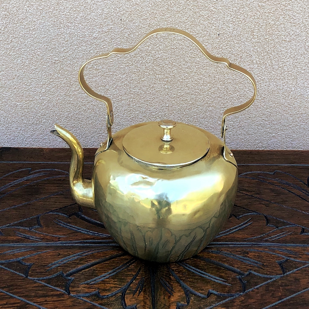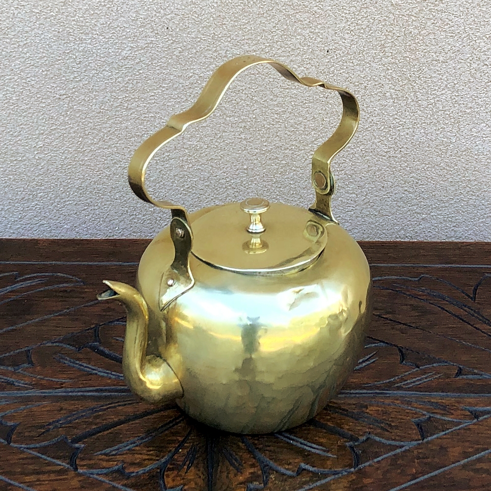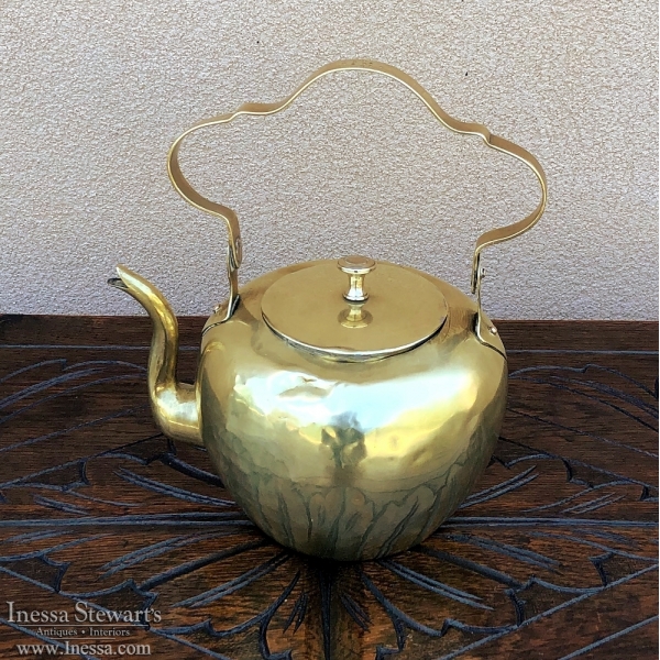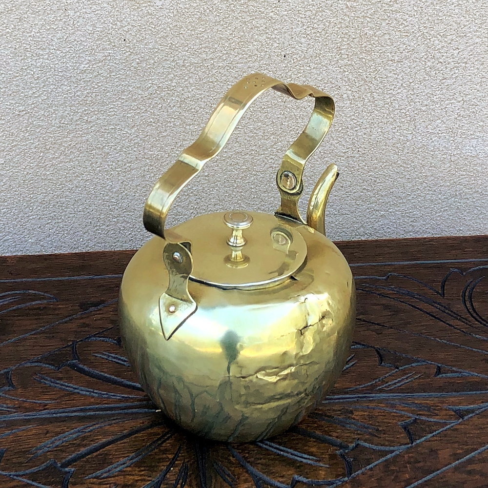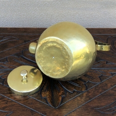 19th Century Brass Tea Kettle is a charming reminder of a bygone era, when vessels such as this were hand-made by metal smiths trained in their skills by their forefathers. Note the hand-soldered seams and hand-hammered rivets. An intriguing onion dome shape has been hammered into the handle designed to isolate the user's hands from the hot vessel when filled with aromatic tea.