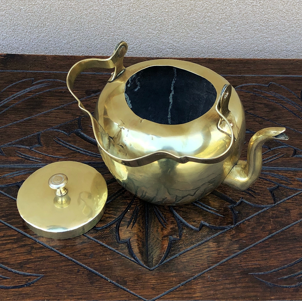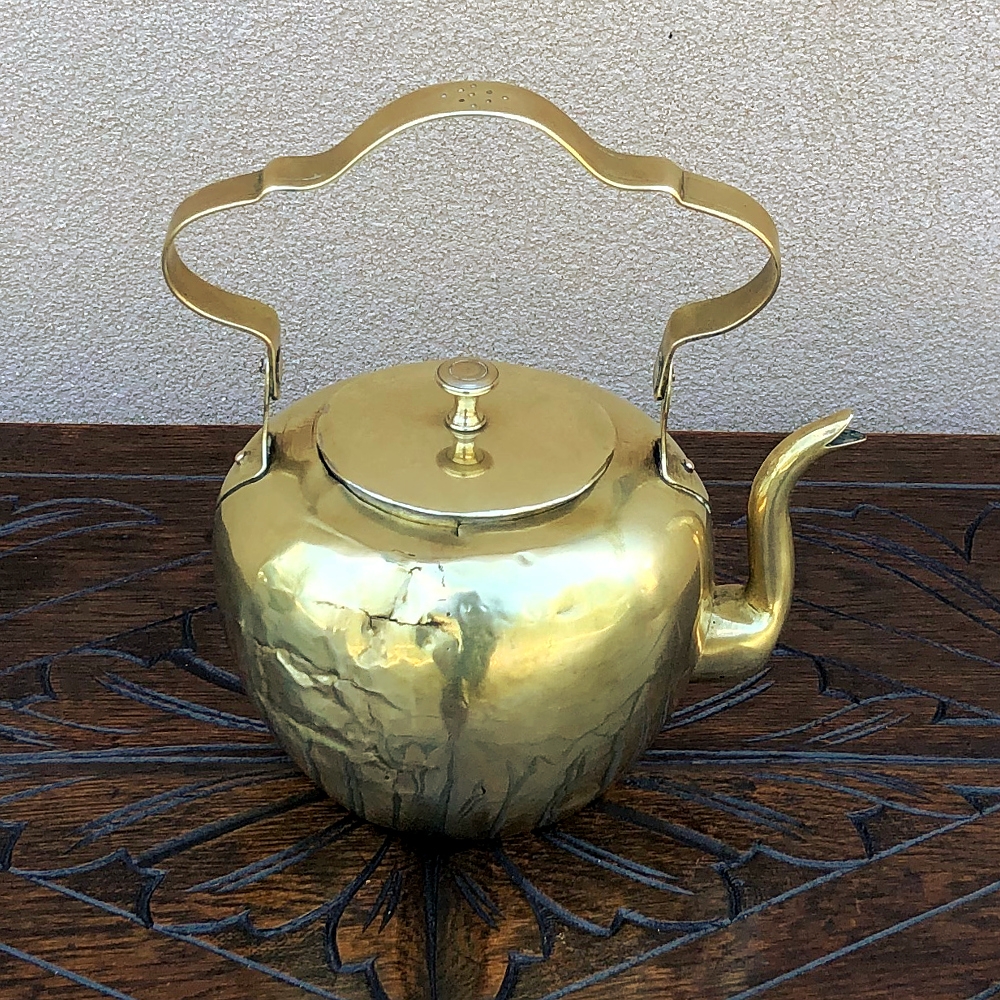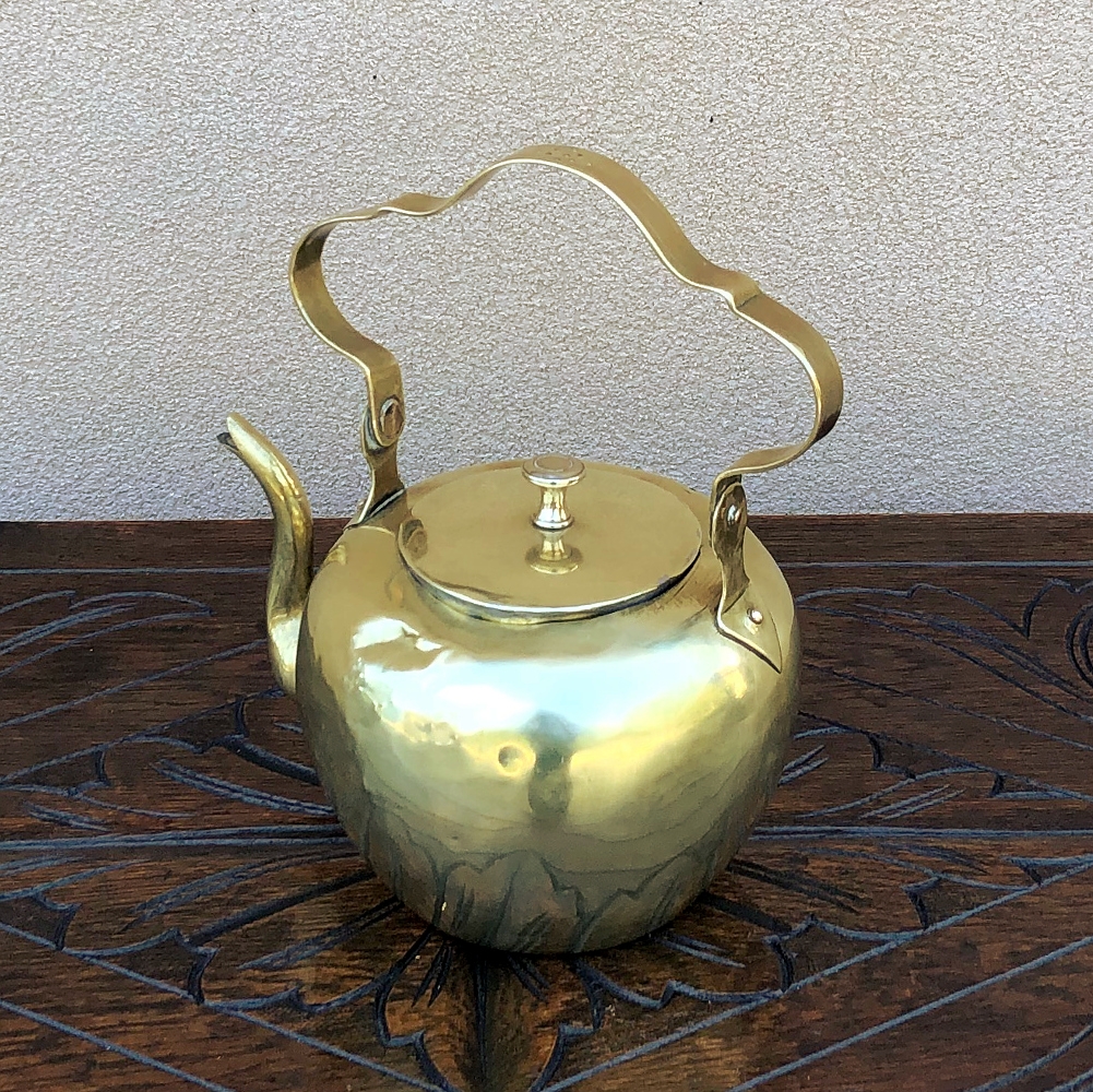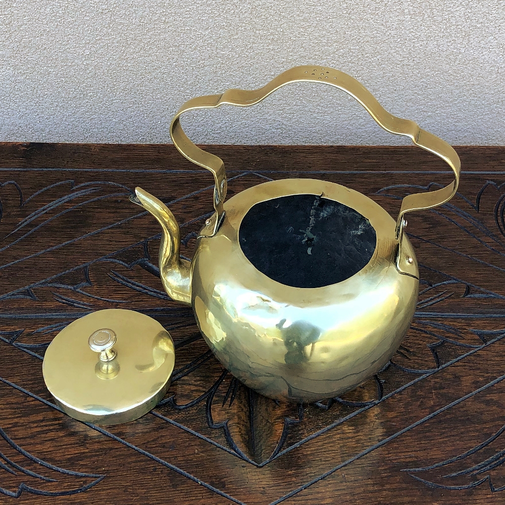 19th Century Brass Tea Kettle is a charming reminder of a bygone era, when vessels such as this were hand-made by metal smiths trained in their skills by their forefathers. Note the hand-soldered seams and hand-hammered rivets. An intriguing onion dome shape has been hammered into the handle designed to isolate the user's hands from the hot vessel when filled with aromatic tea.