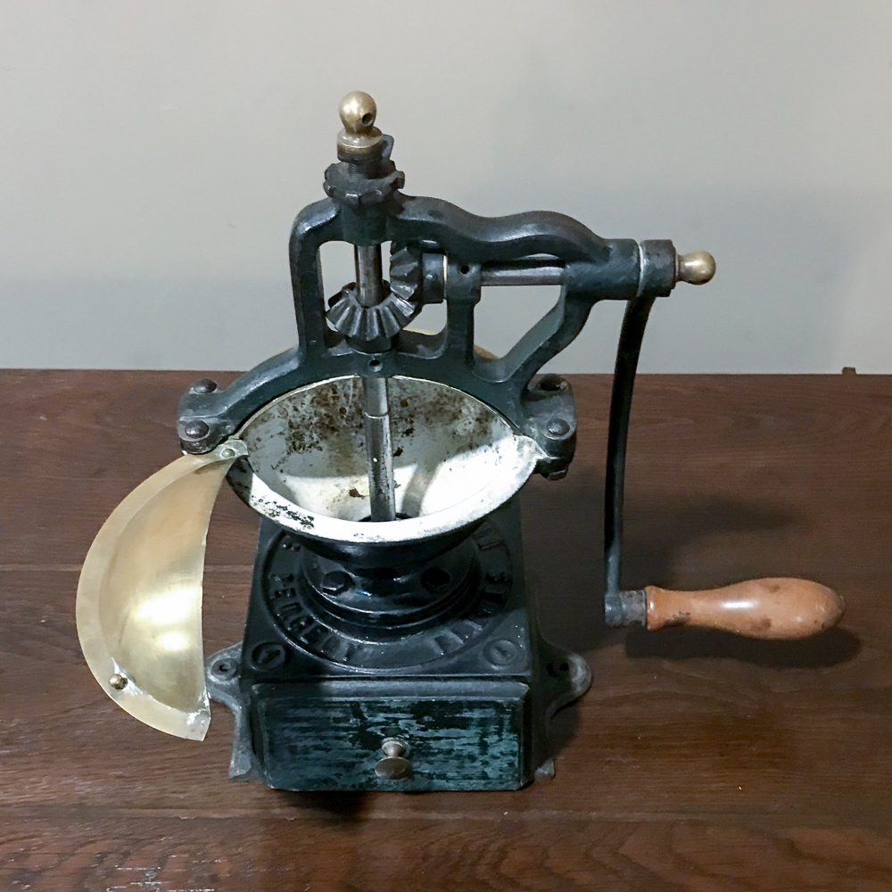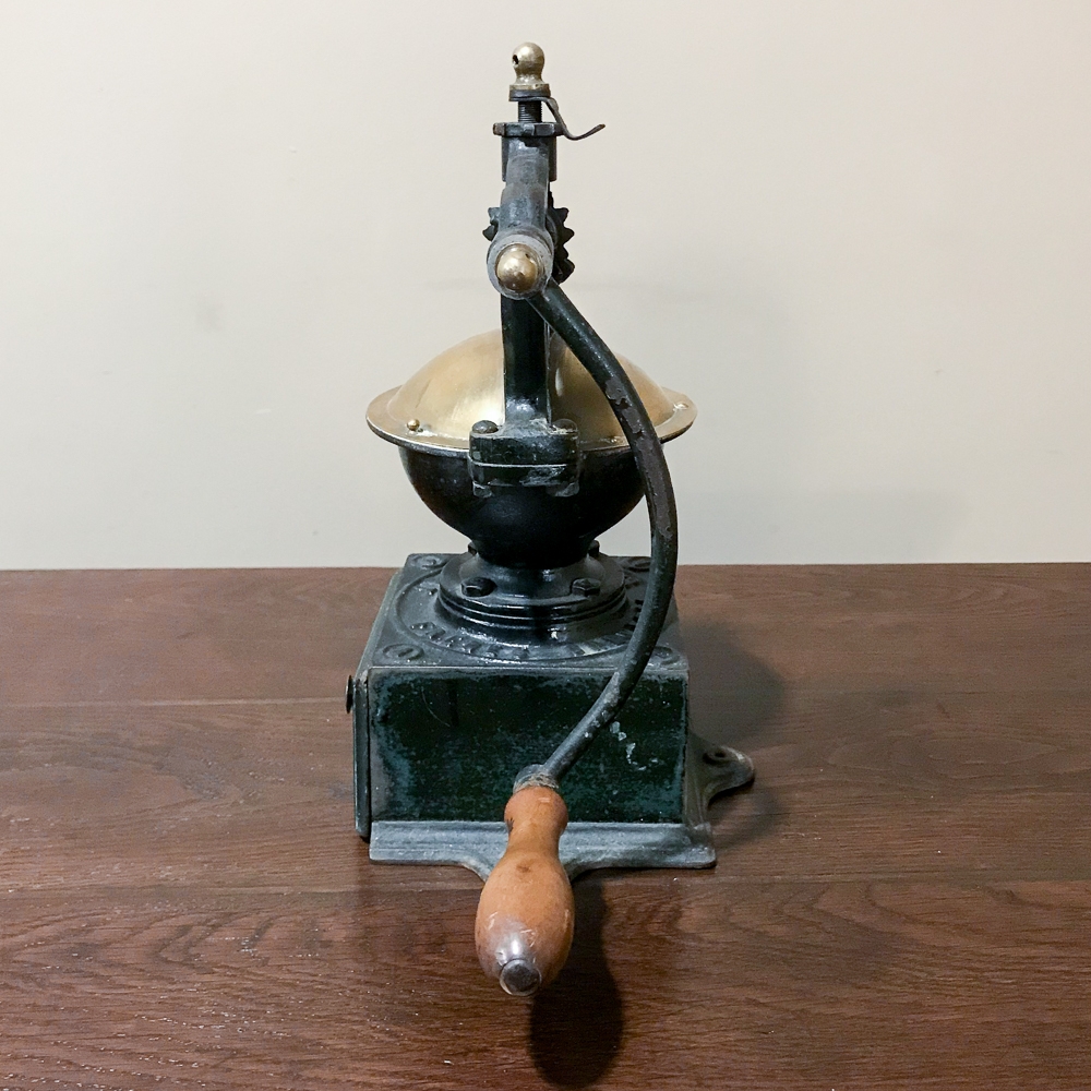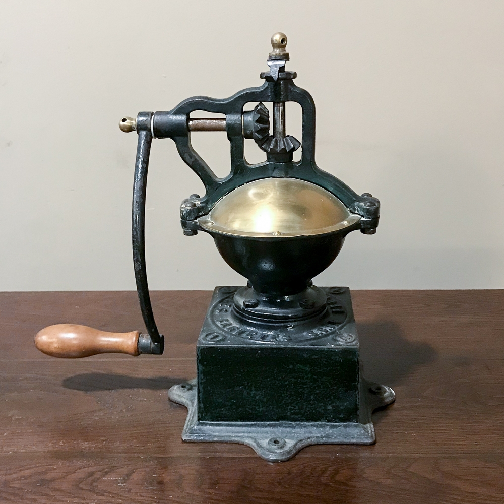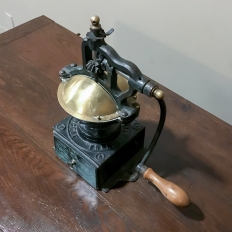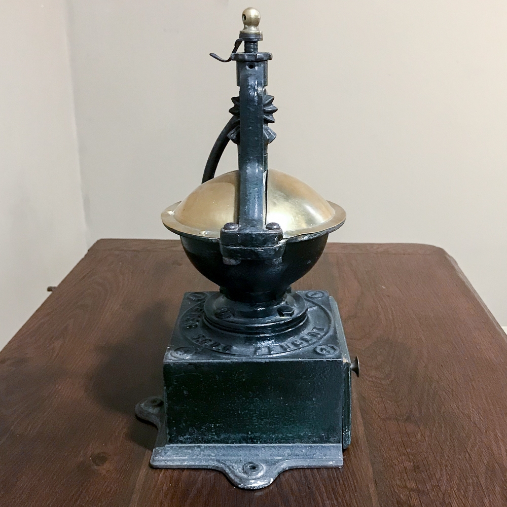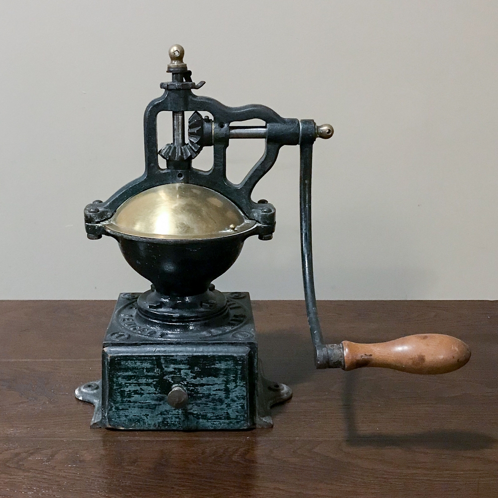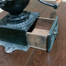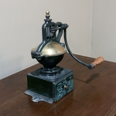Sale19th Century Coffee Mill was sturdily made for a commercial establishment such as a tavern, but equally desirable to a coffee enthusiast! Note the wonderful gearing mechanism and pivoting blade guard that allowed one to put in a portion of beans.