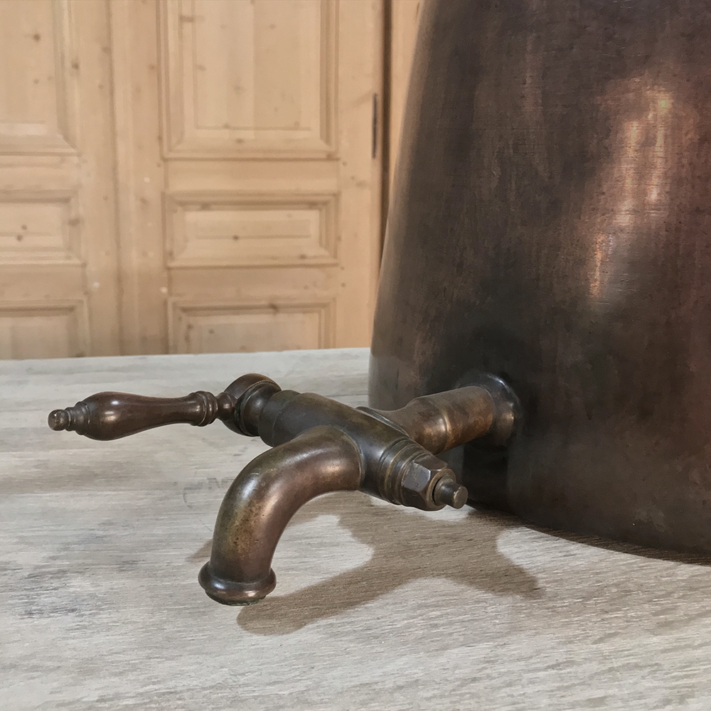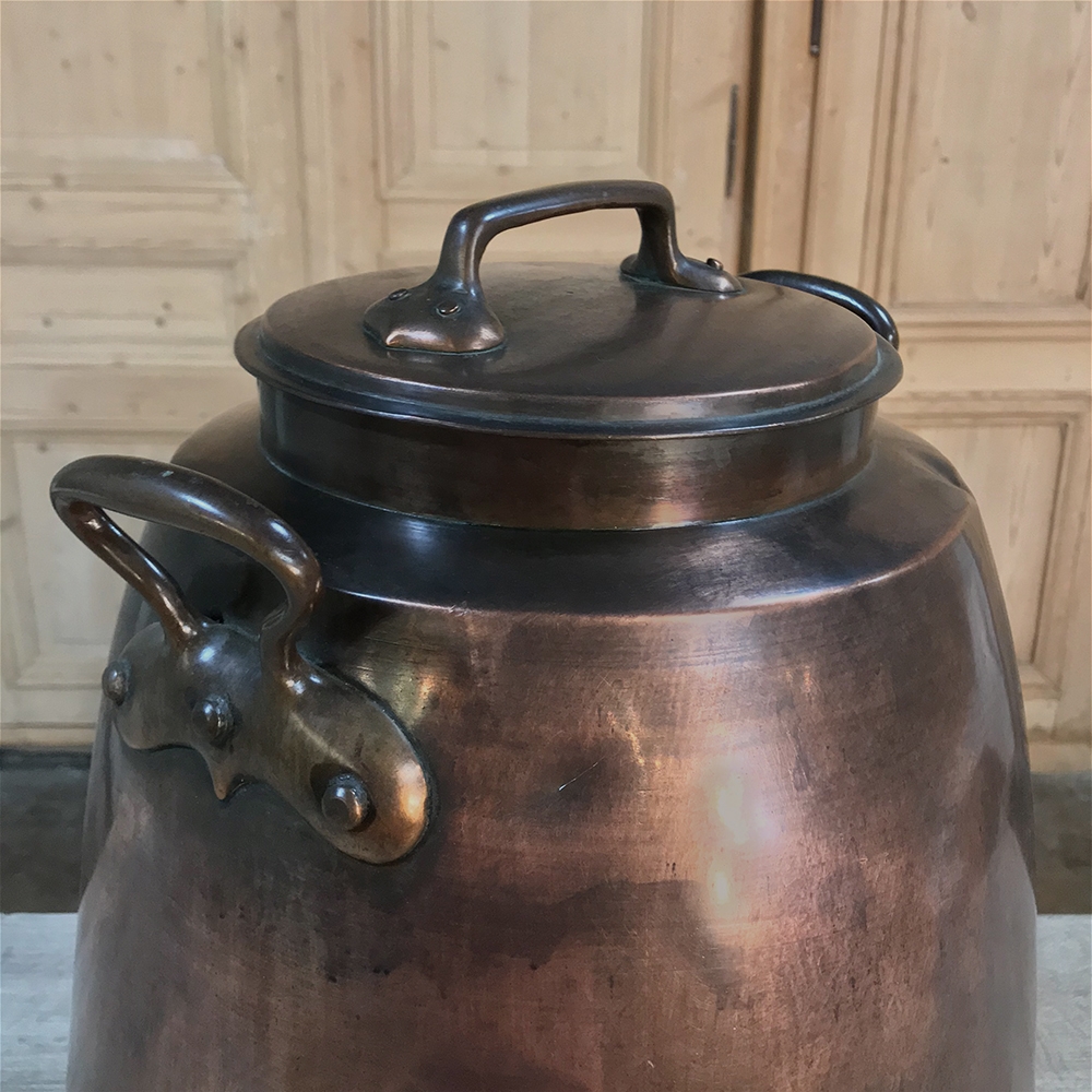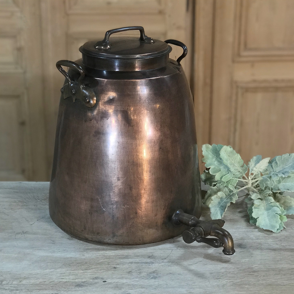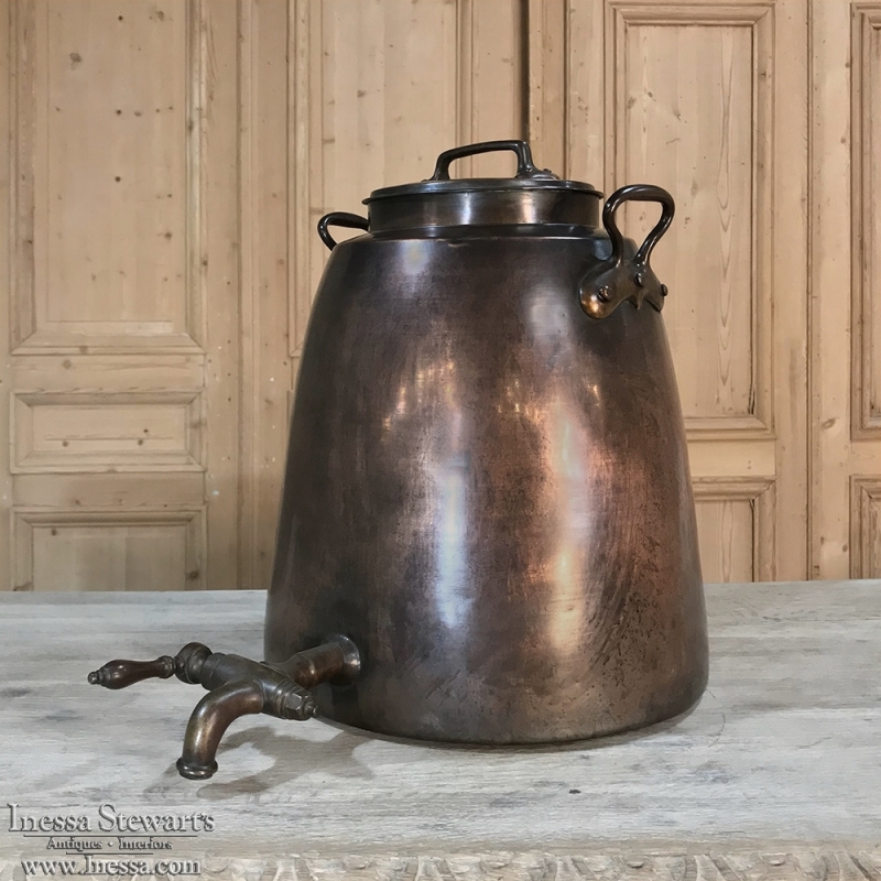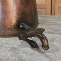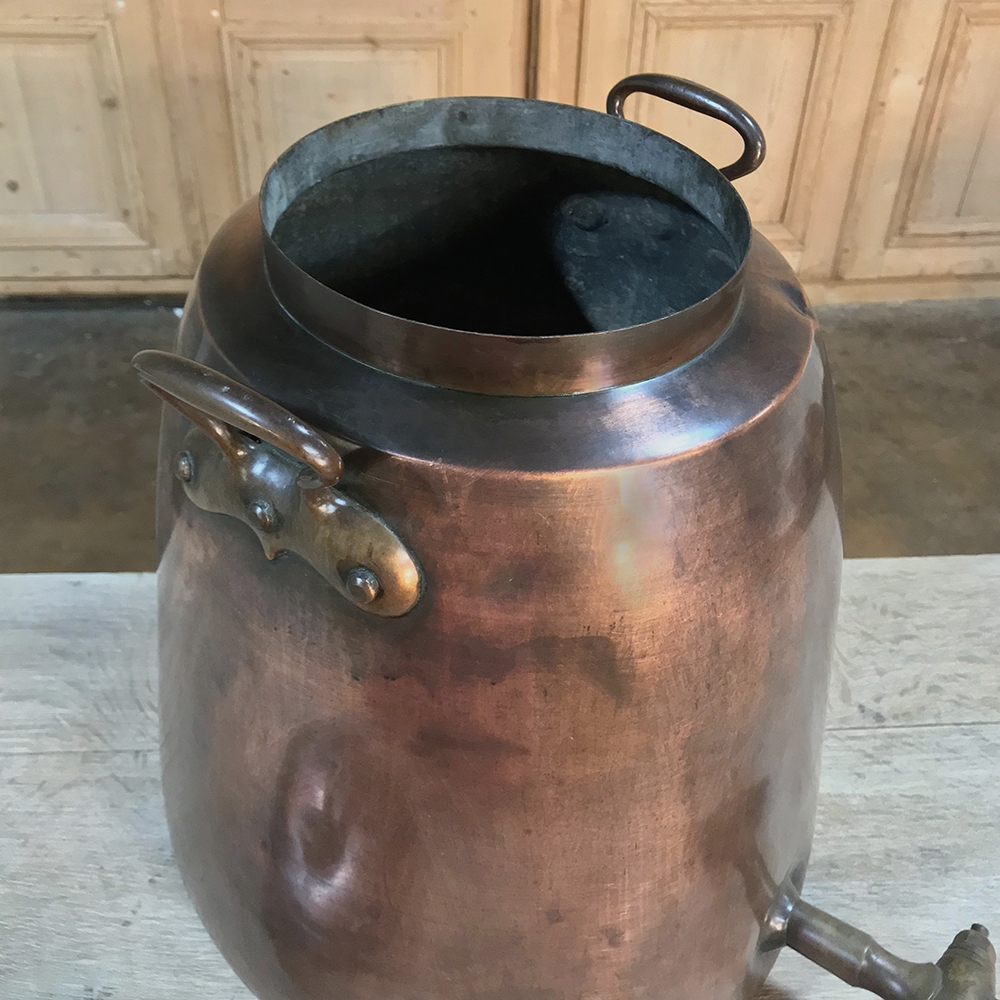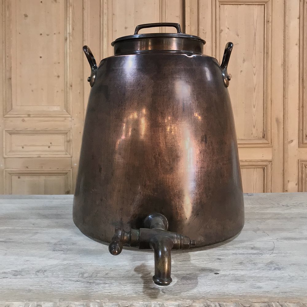 Sale19th Century Solid Copper Banquet Coffee Server was designed for commercial level service. Copper exterior and tin lining ensured decades if not century of durability. A large handled lid on top makes it easy to fill, and the over-engineered valve and spout with extension ensures the ability to tap the contents with ease and rapidity. Destined for a fine hotel or a busy restaurant, such contrivances were hand-made and include riveted construction and sturdy appointments. Note the strong, large handles allowing it to be removed for cleaning on a daily basis. Even the handle to the lid is riveted in place, showing clearly the heavy duty nature of this artifact from a bygone era.