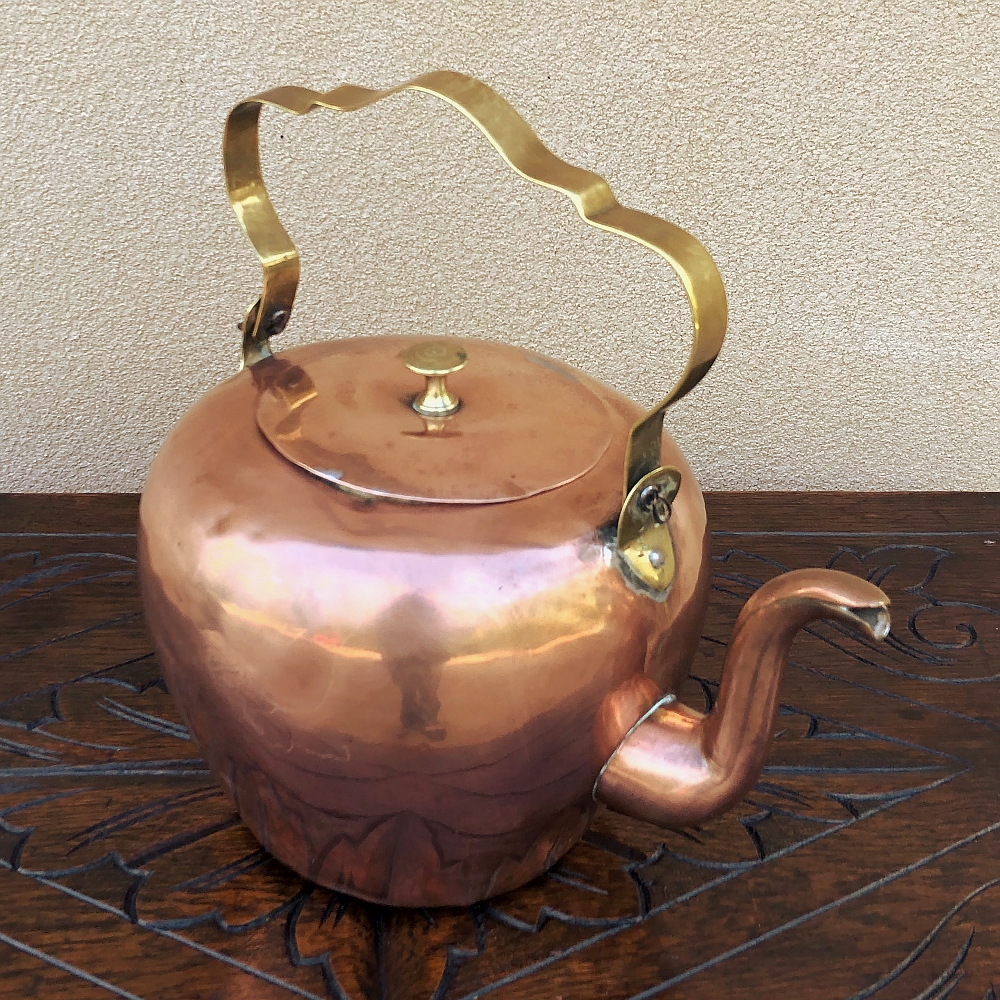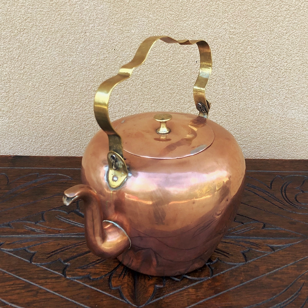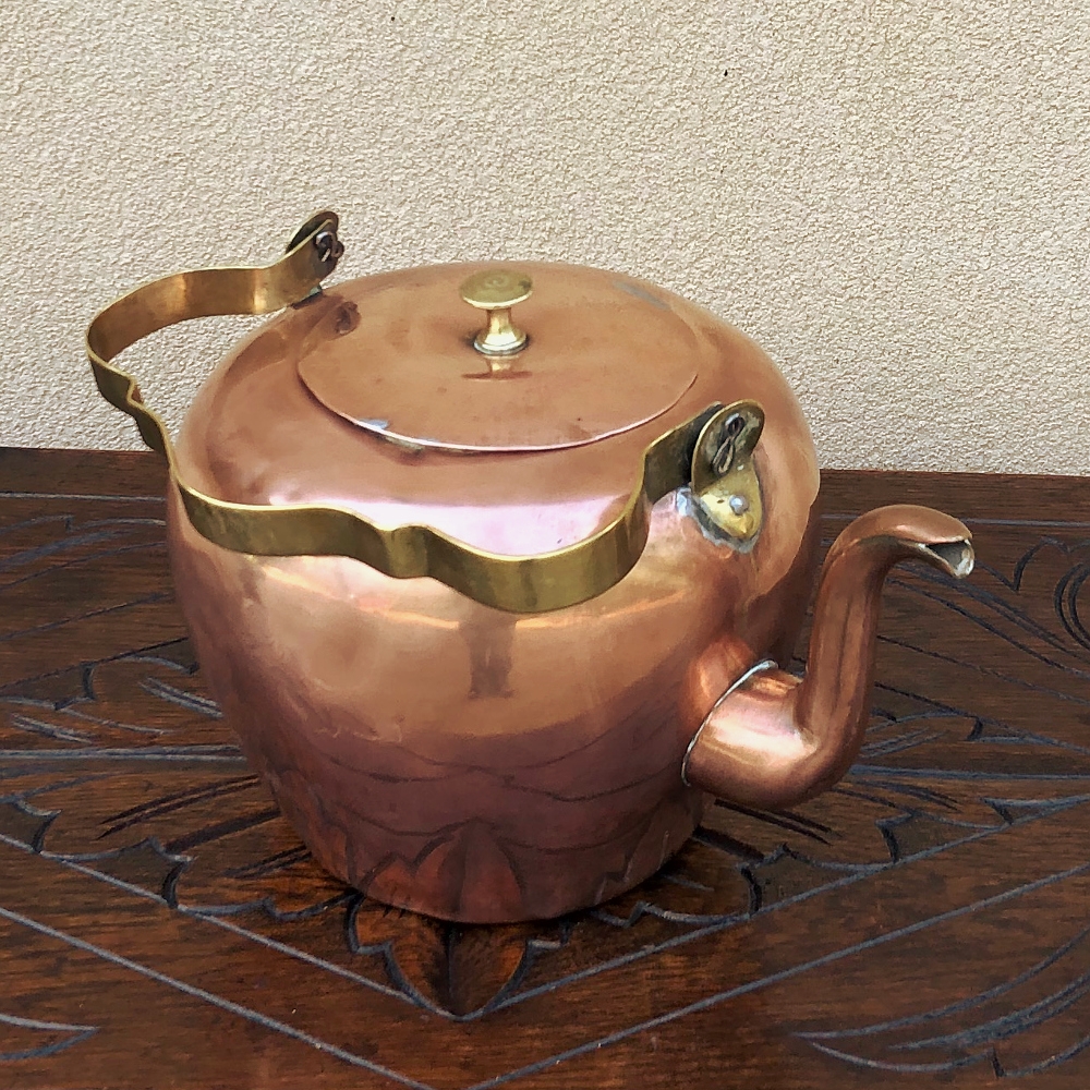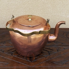 19th Century Copper & Brass Teapot was hand-made to last for decade after decade, and built so it could be periodically refurbished and repaired, good for another decade or two each time! The combination of brass lid knob and swiveling handle contrasts nicely with the copper body, which was hand-dovetailed and soldered for generations of usage!