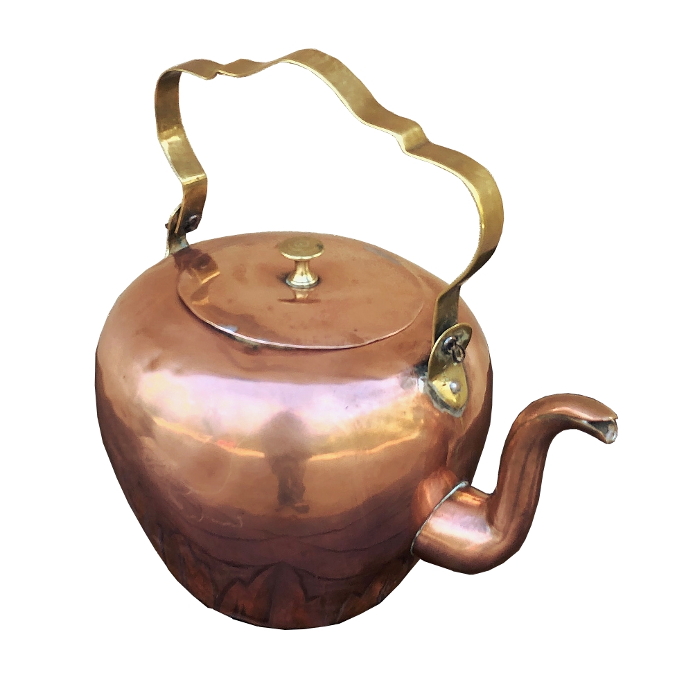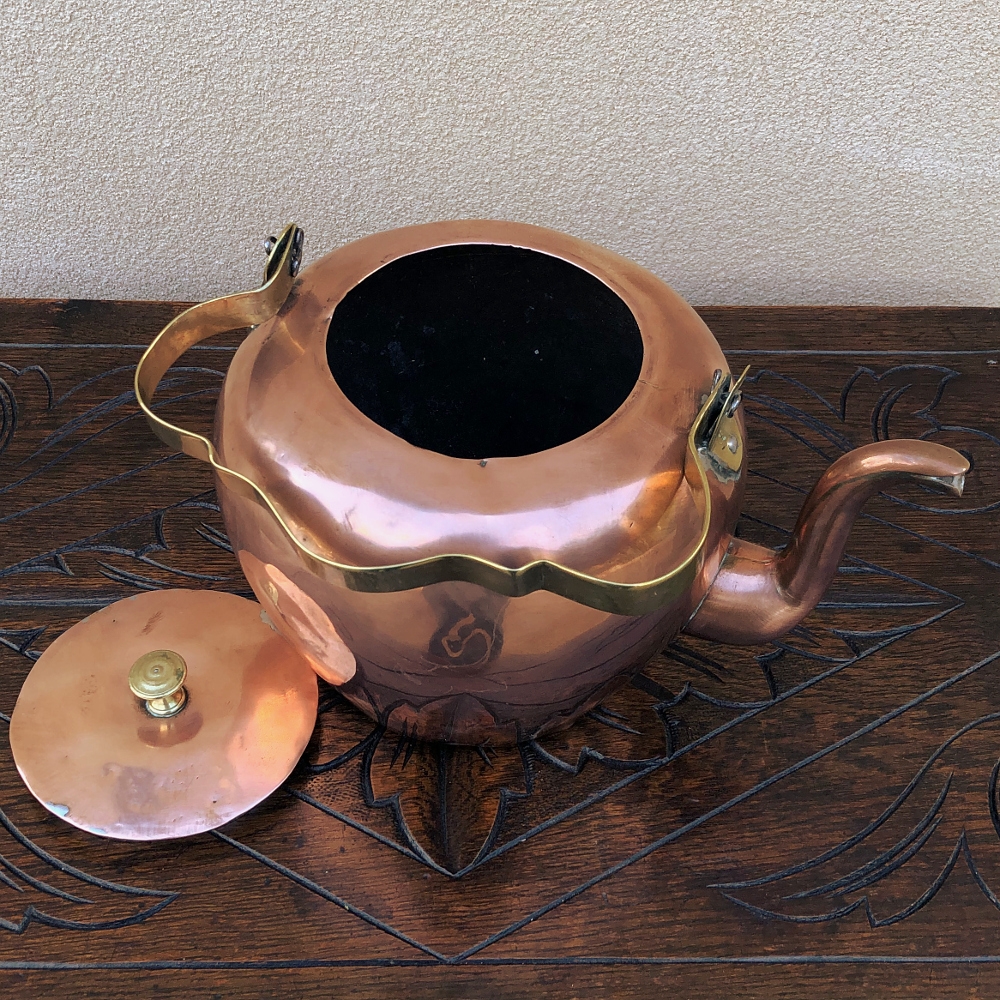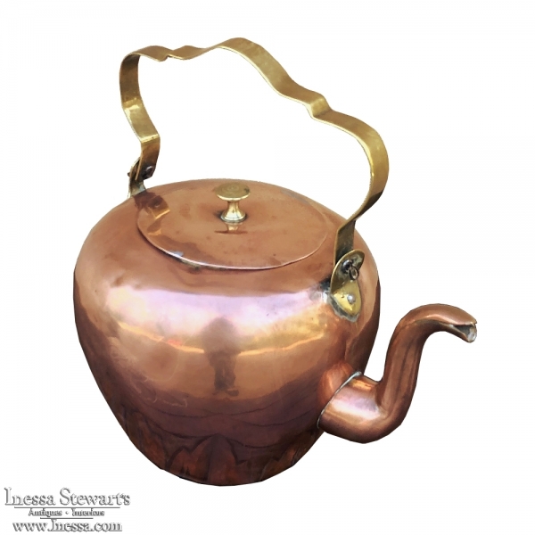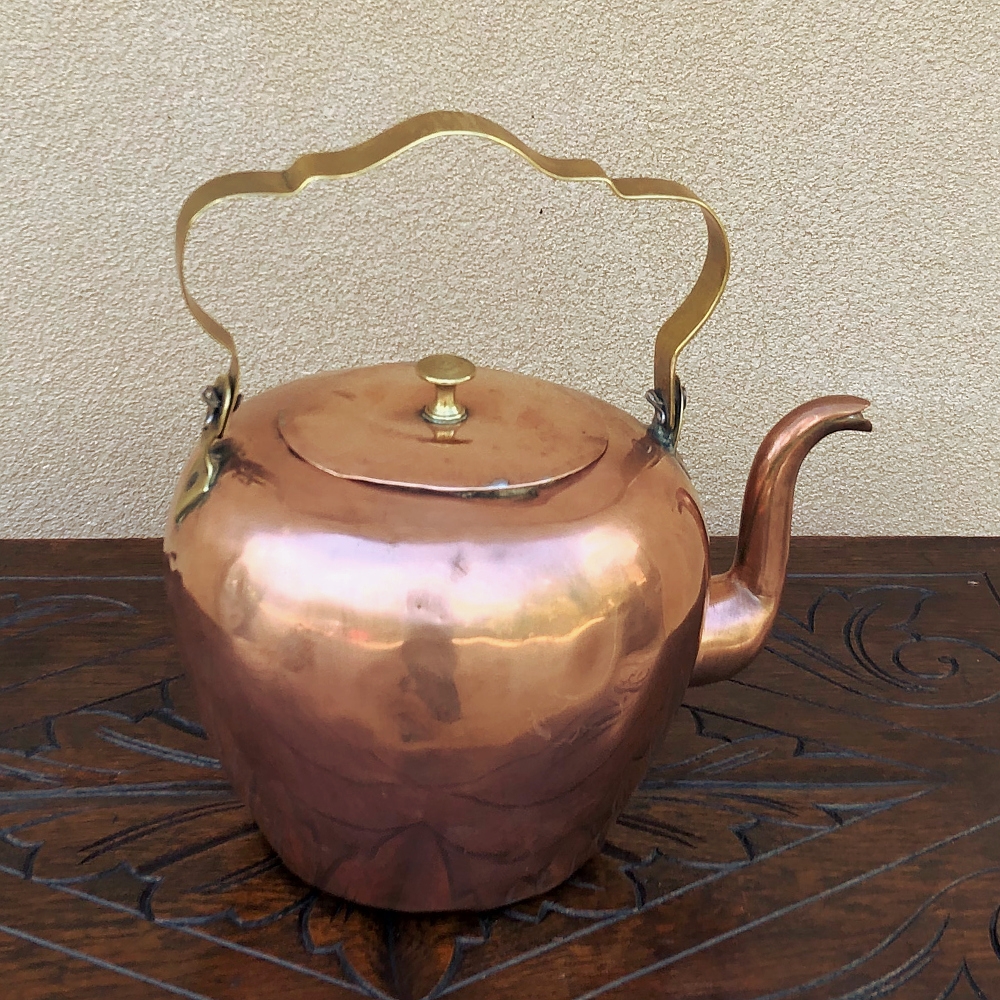 19th Century Copper & Brass Teapot was hand-made to last for decade after decade, and built so it could be periodically refurbished and repaired, good for another decade or two each time! The combination of brass lid knob and swiveling handle contrasts nicely with the copper body, which was hand-dovetailed and soldered for generations of usage!