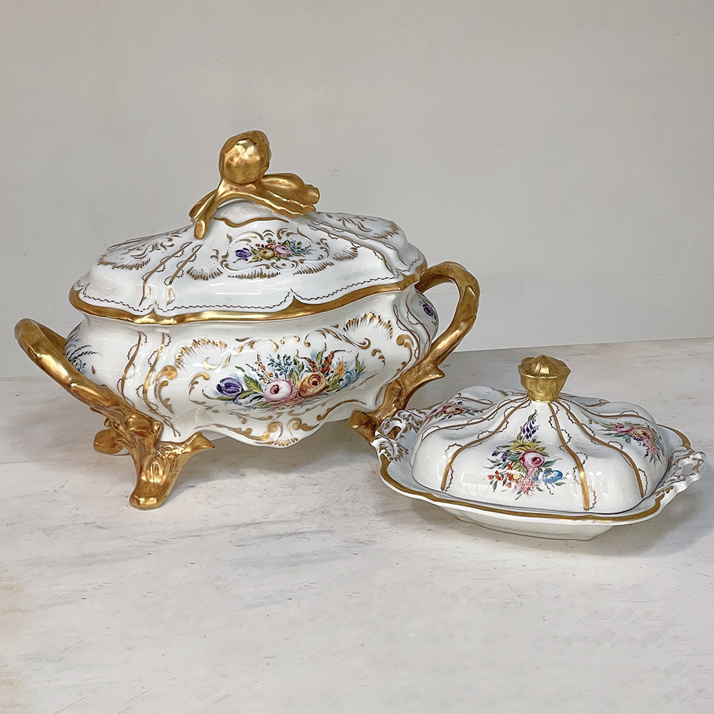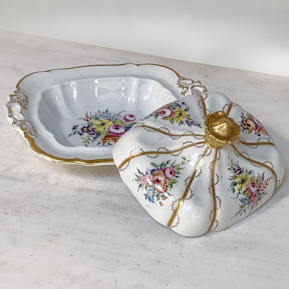 19th Century French Limoges Hand-Painted Covered Serving Dish is a stunning example of the exquisite porcelains that were produced during the period by master ceramicists. The bold Baroque form of the tureen is enhanced by the painted detailing, primarily in gold, but also featuring floral bouquets on all four faces of the lid. The handle on top is designed to resemble a cabbage. Remove the lid, and discover that even the inside of the piece has been hand-painted with a splendid floral bouquet! Such works are considered so decorative that they can be used as centerpieces by themselves, or for serving the chef's masterpiece in style!