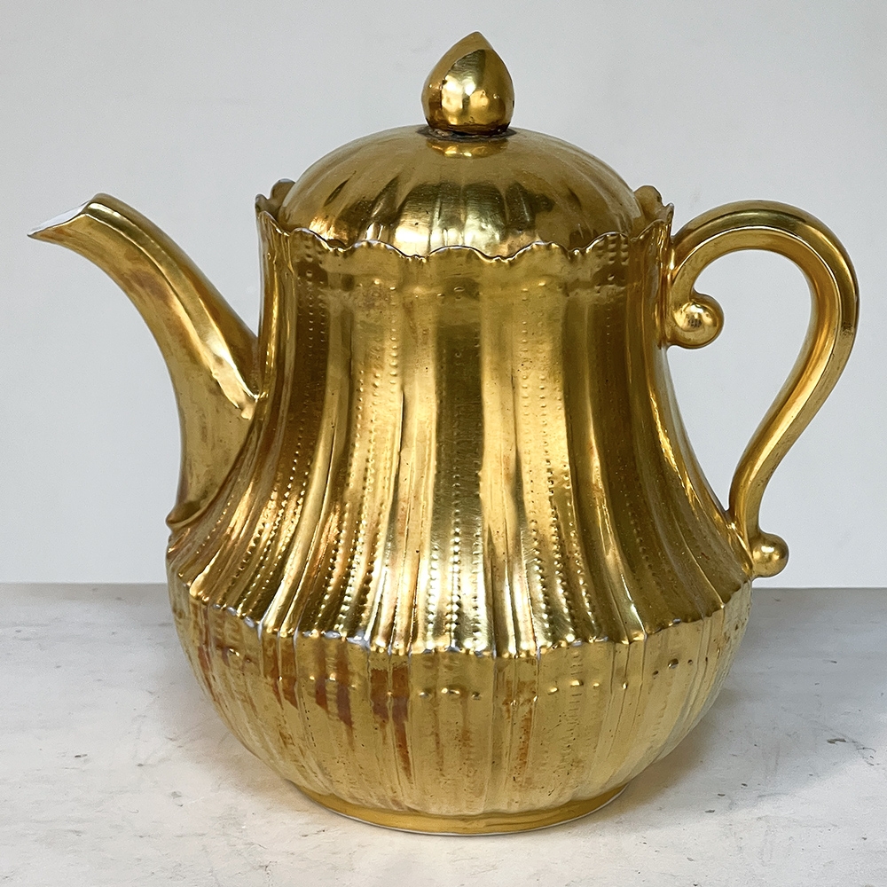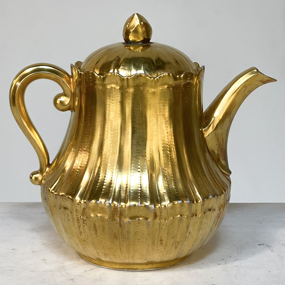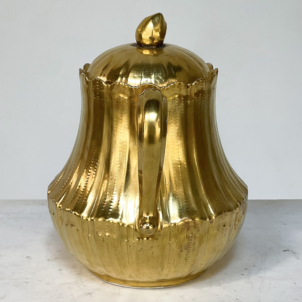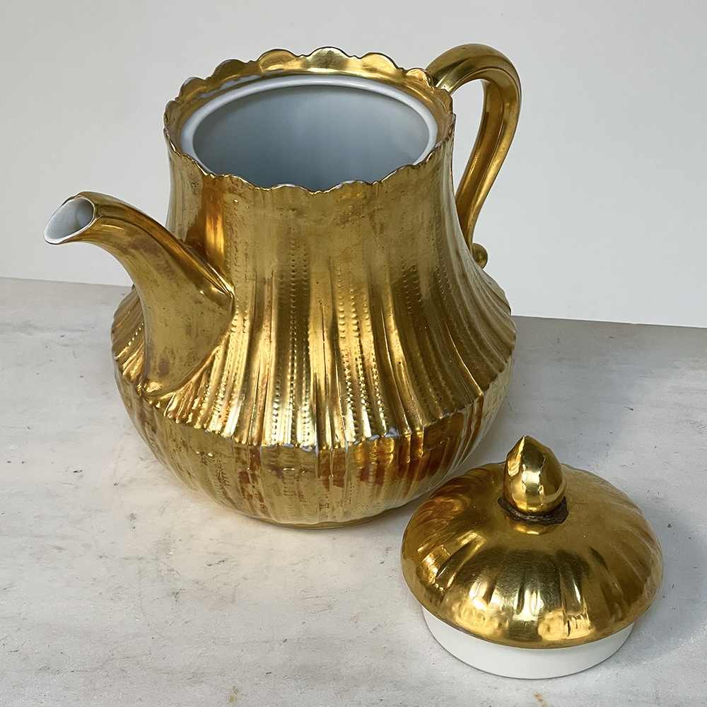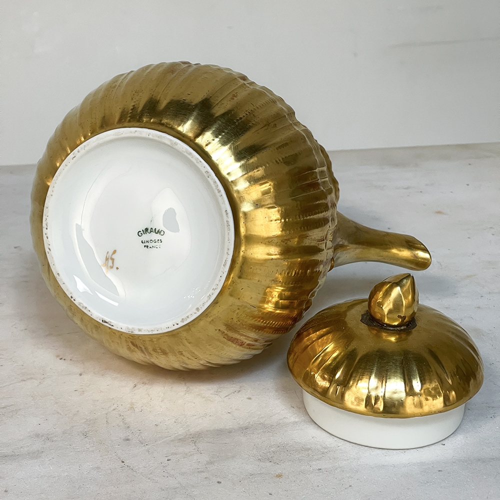 Antique Gilded Limoges Teapot by Giraud is a classic example of the extraordinary and luxurious porcelains created by the maker in the Limoges region of France where the traditions of the ceramic crafts go back to the late 1700s. This example features a pleated surface like gathered fabric, with a lid fitted with a knob that depicts a rose bud. The bright white porcelain can be seen inside and even when peering into the spout. Such works were completely hand-painted, and in this instance the painter signed the work A.S. on the bottom next to the stamp of the painter's employer, Giraud, a family that had its origins in the regional porcelain industry in the 1920s.