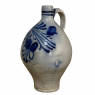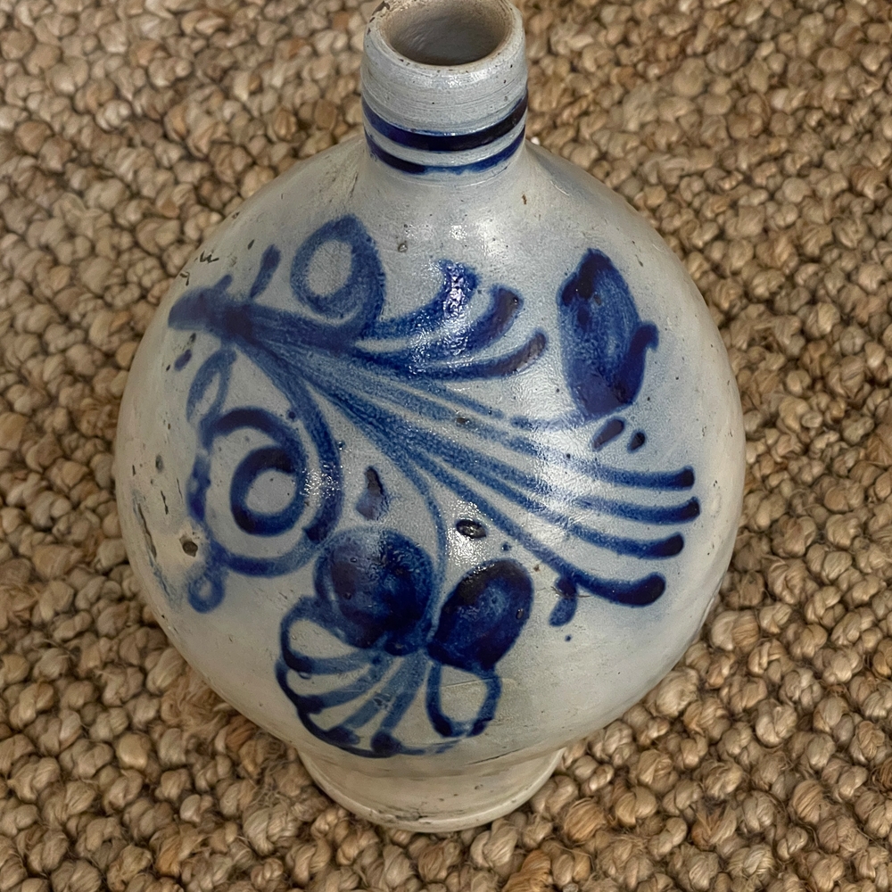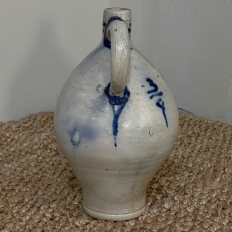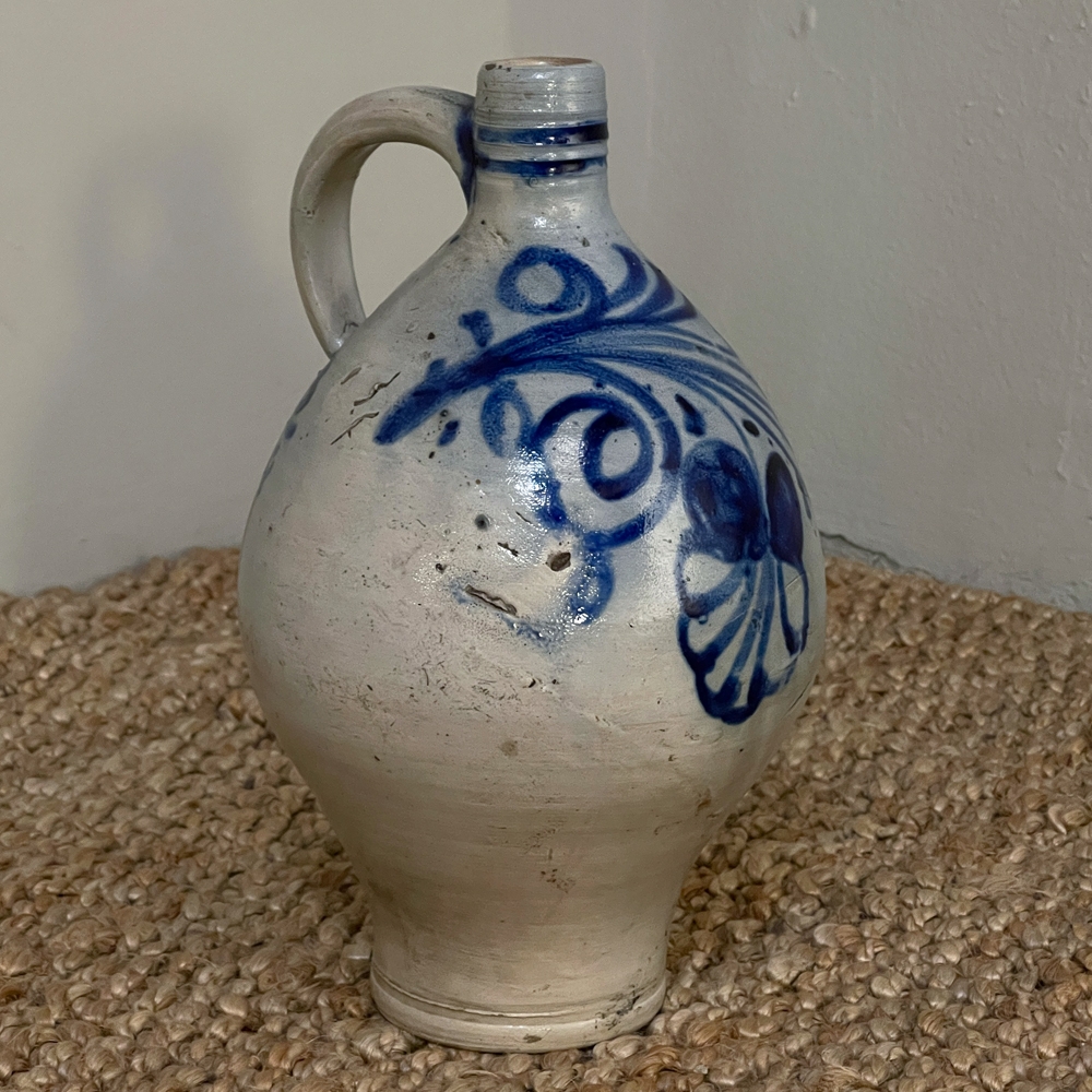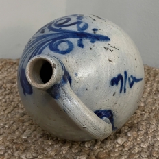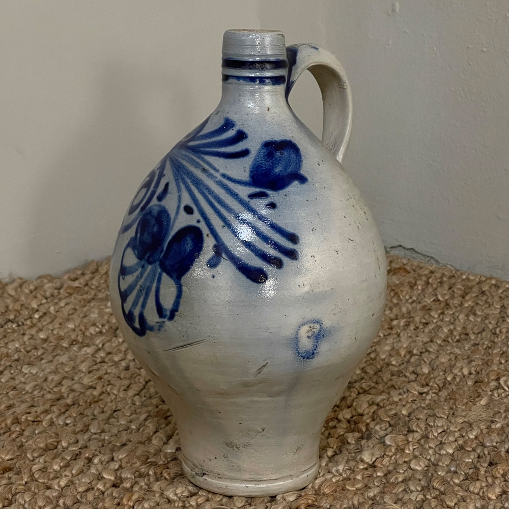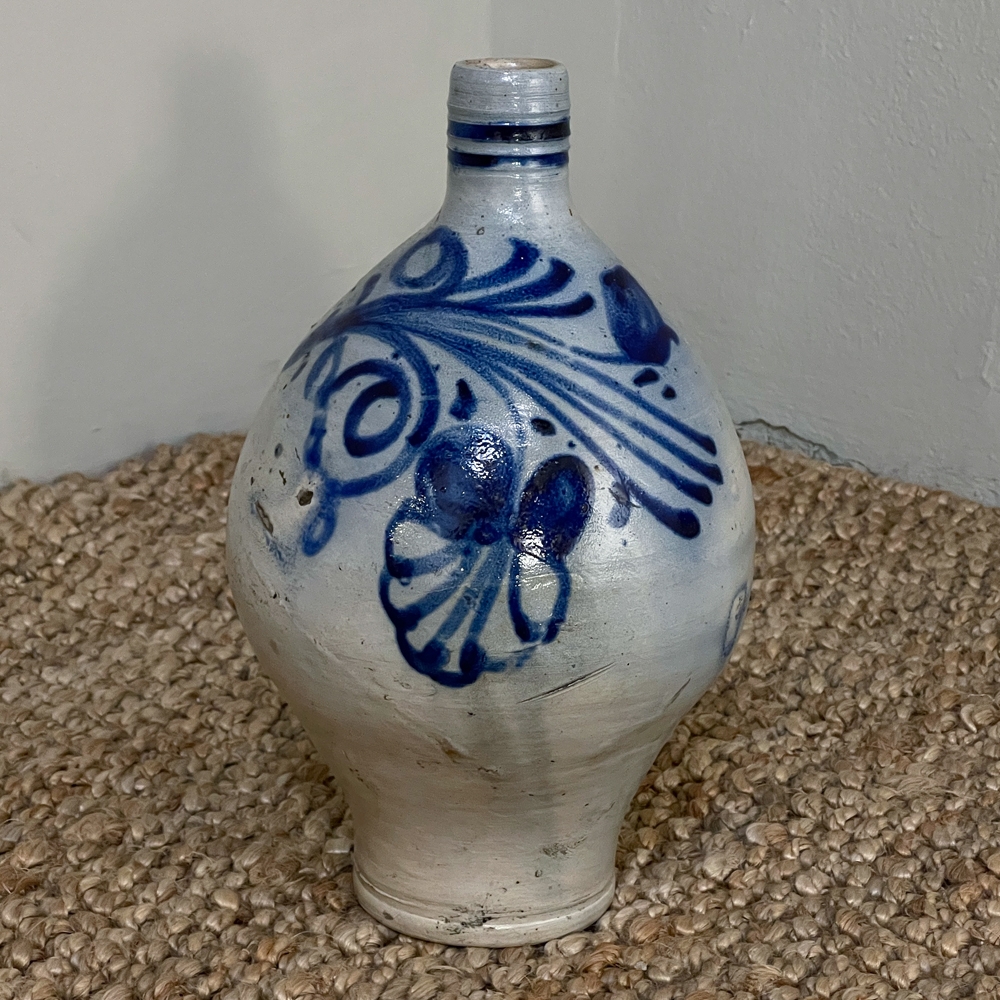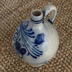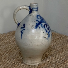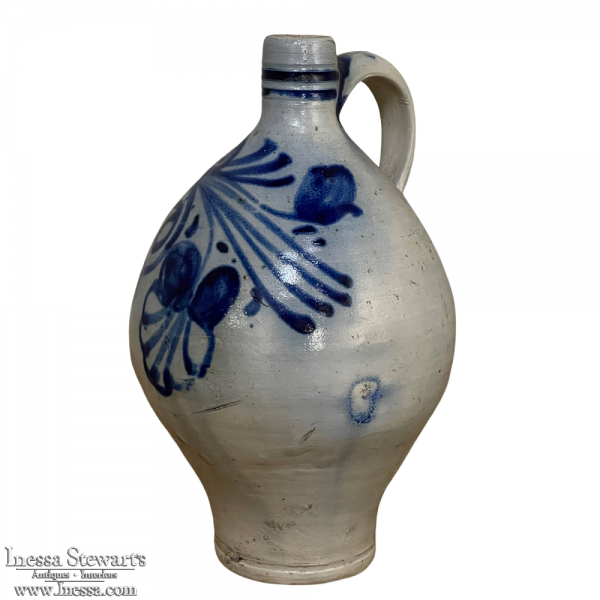 Antique Hand-Painted Earthenware Jug was hand-thrown from local clays then given a glaze on top of which cobalt blue was deftly hand-painted to create a stylized naturalistic theme. Natural corks were used as stoppers, and such vessels were used to contain a wide variety of comestibles.