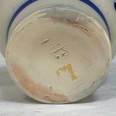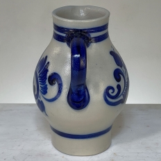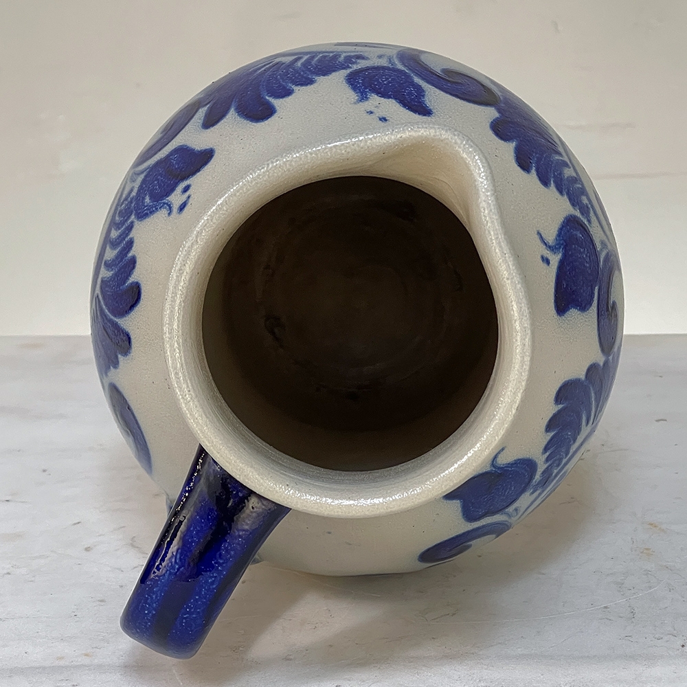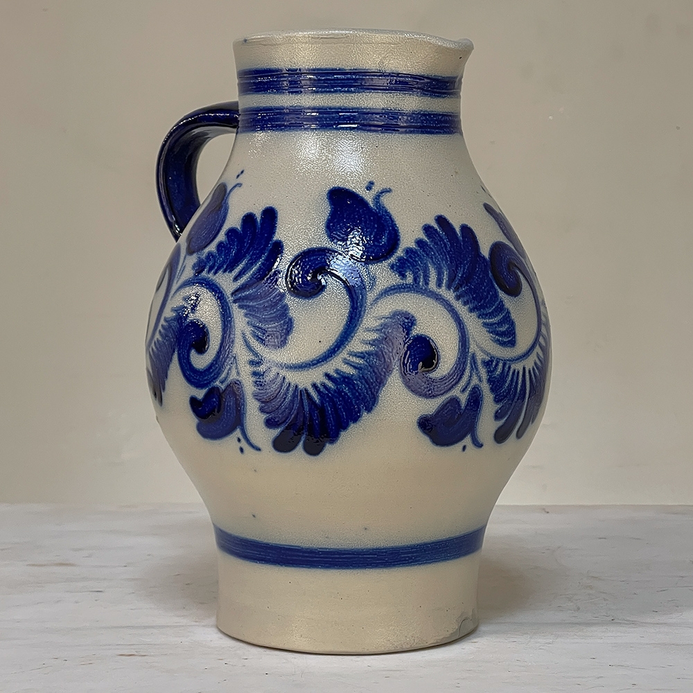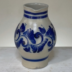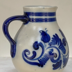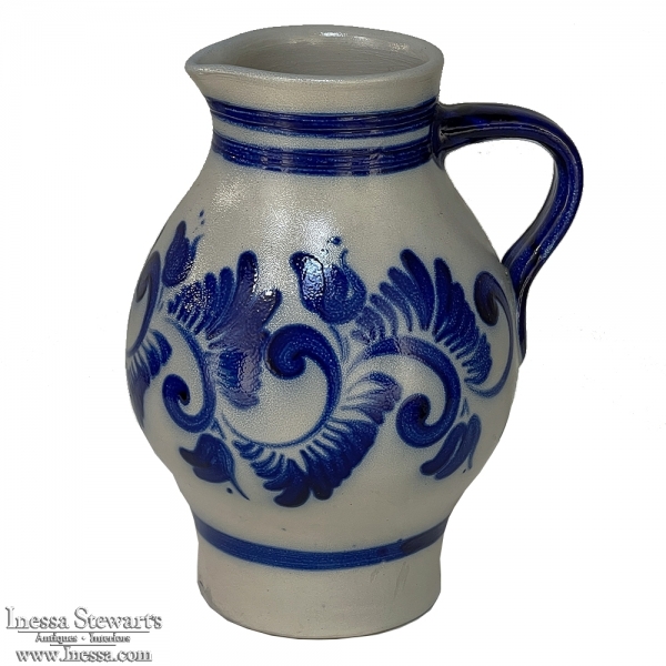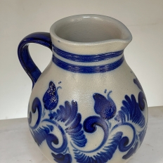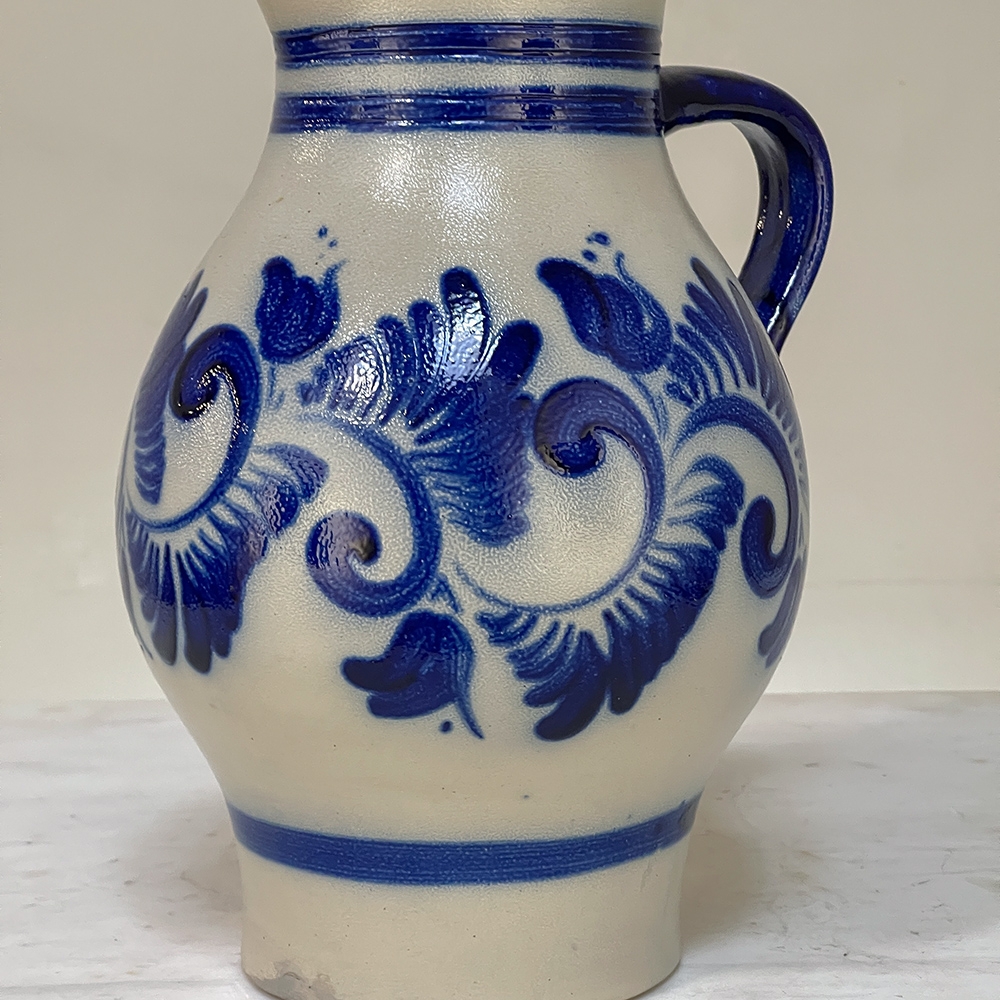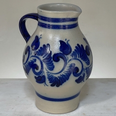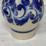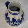 Antique Hand-Painted Earthenware Jug was hand-thrown from local clays then given a glaze on top of which cobalt blue was deftly hand-painted to create a stylized naturalistic theme. Natural corks were used as stoppers, and such vessels were used to contain a wide variety of comestibles.