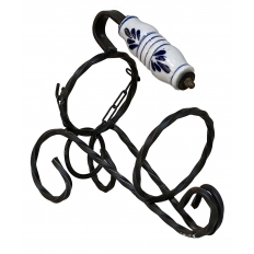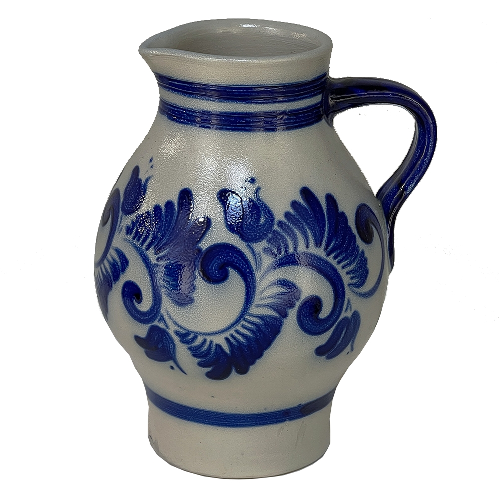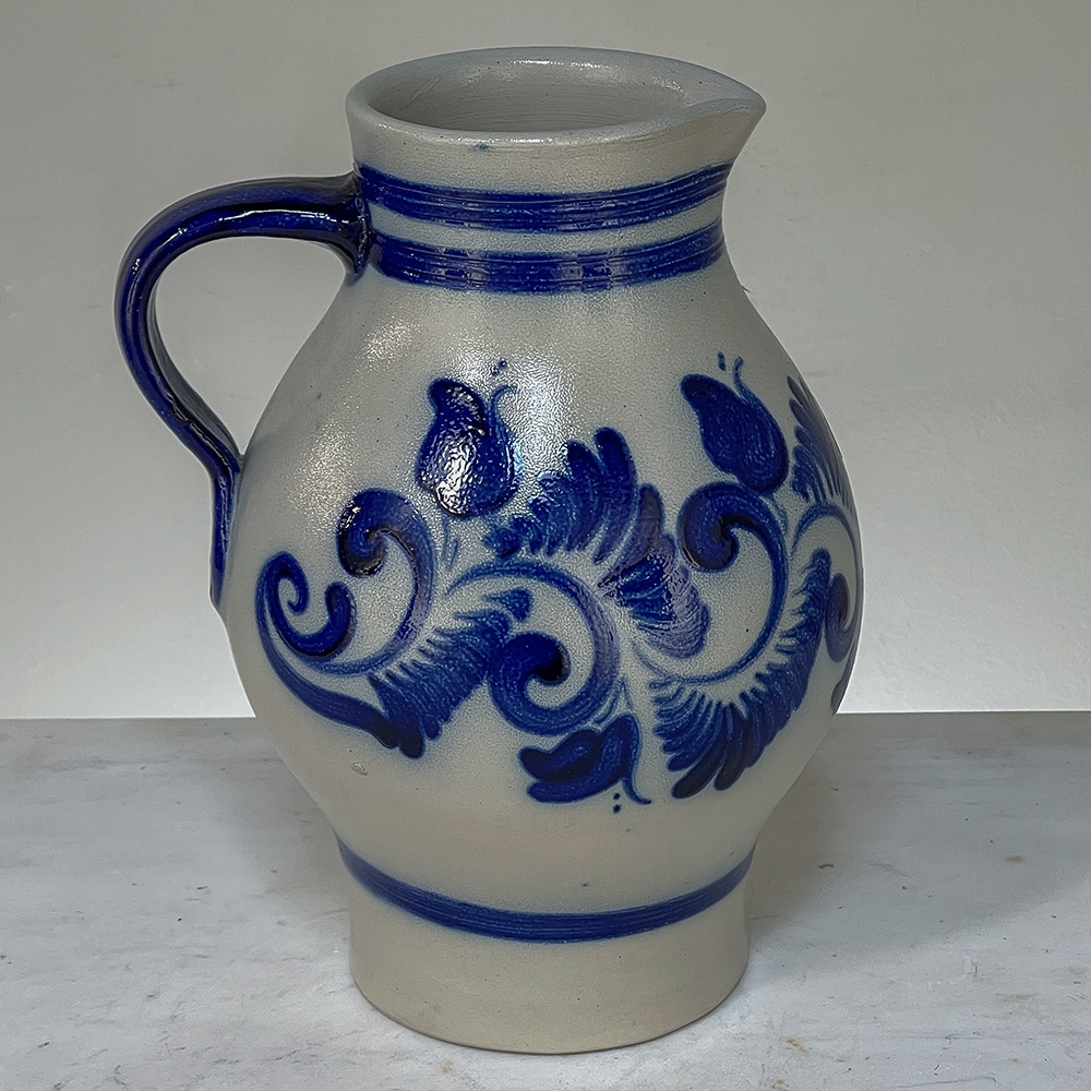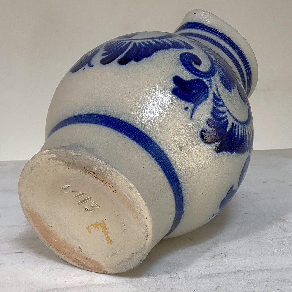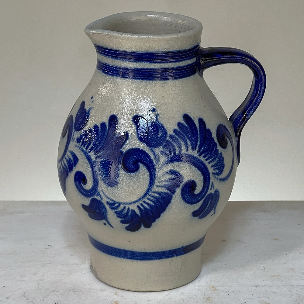 Antique Hand-Painted Earthenware Jug was hand-thrown from local clays then given a glaze on top of which cobalt blue was deftly hand-painted to create a stylized naturalistic theme. Natural corks were used as stoppers, and such vessels were used to contain a wide variety of comestibles.
