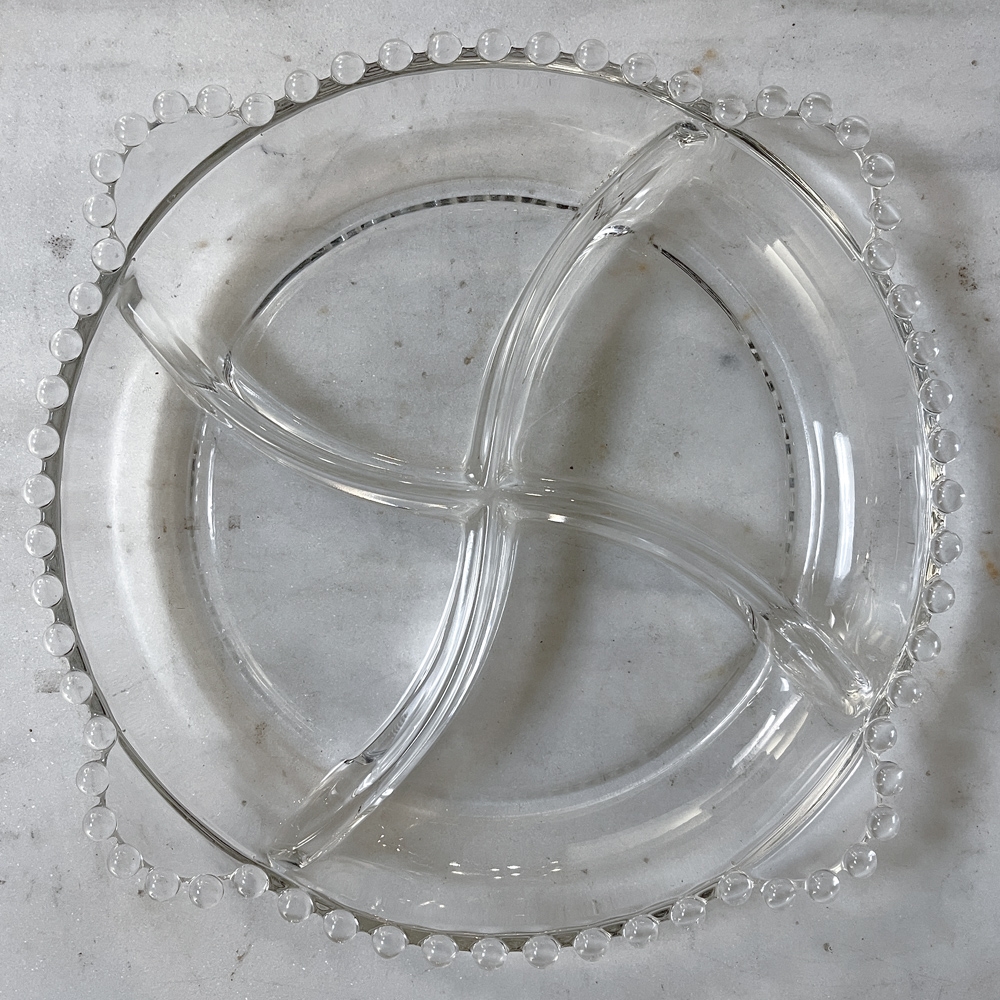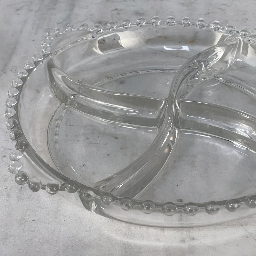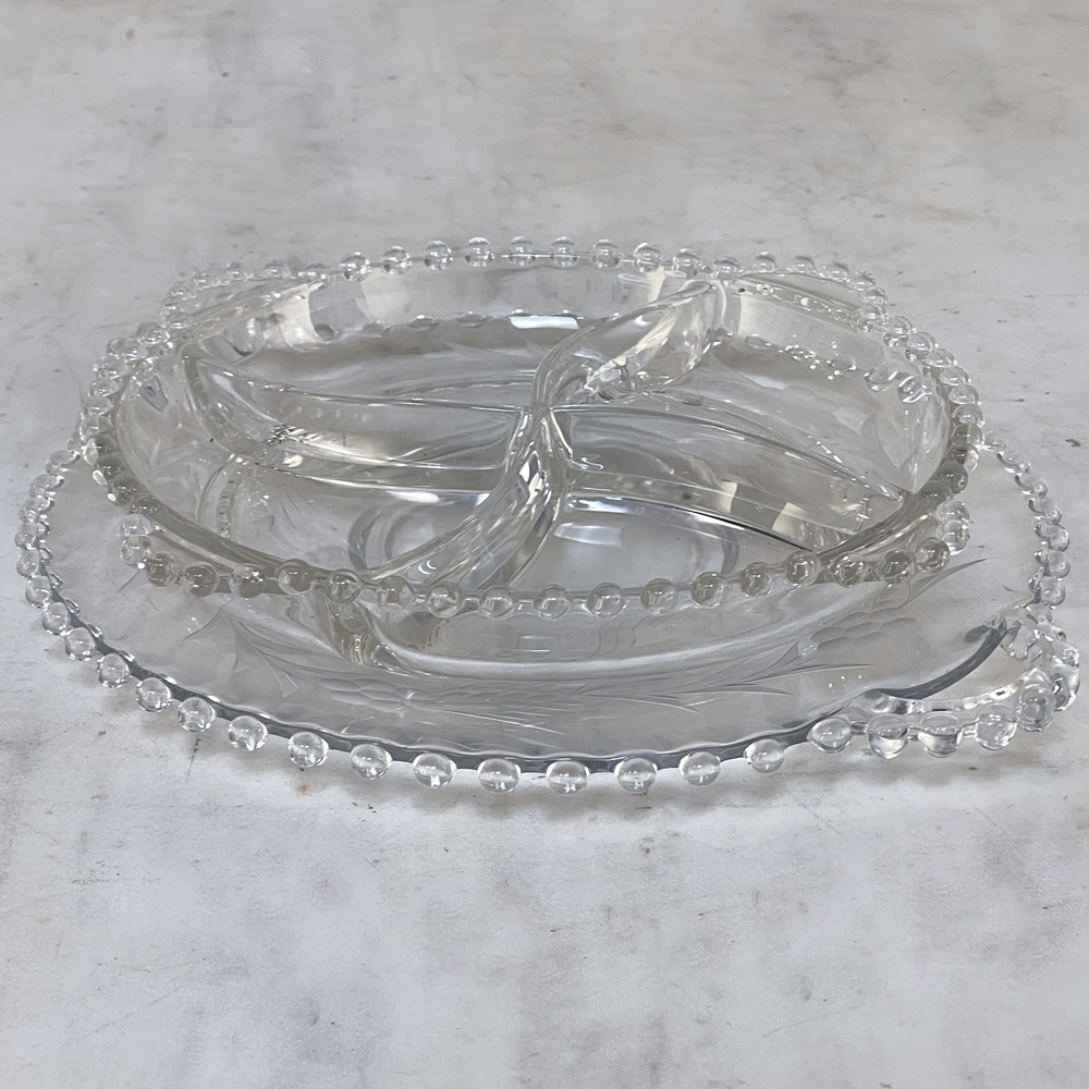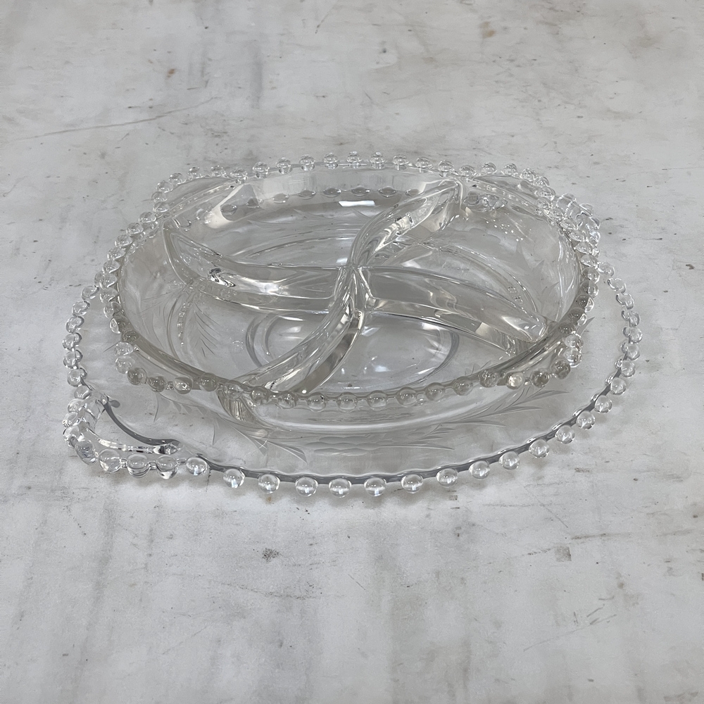 Antique Pressed Glass Crudite Server with Matching Platter can also be used to serve candy with curved dividers allowing you to put four different items on one plate. The matching serving platter has handles for ease in use.