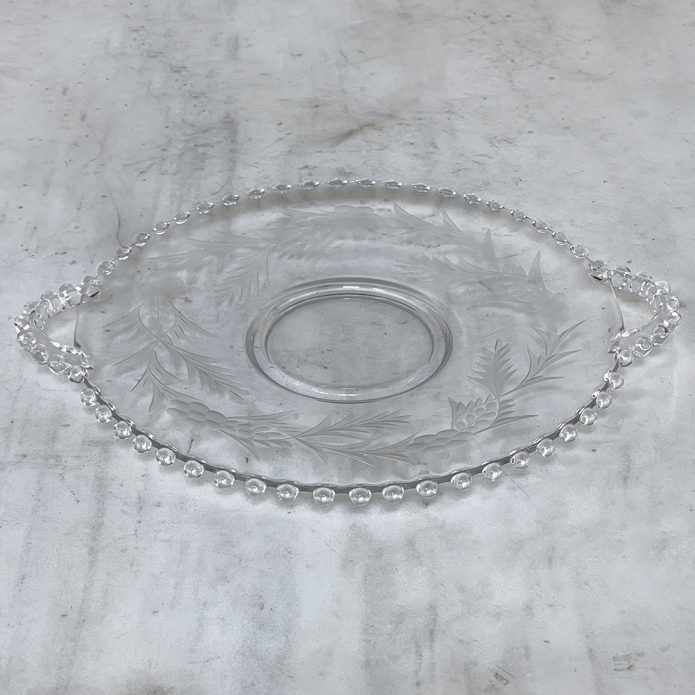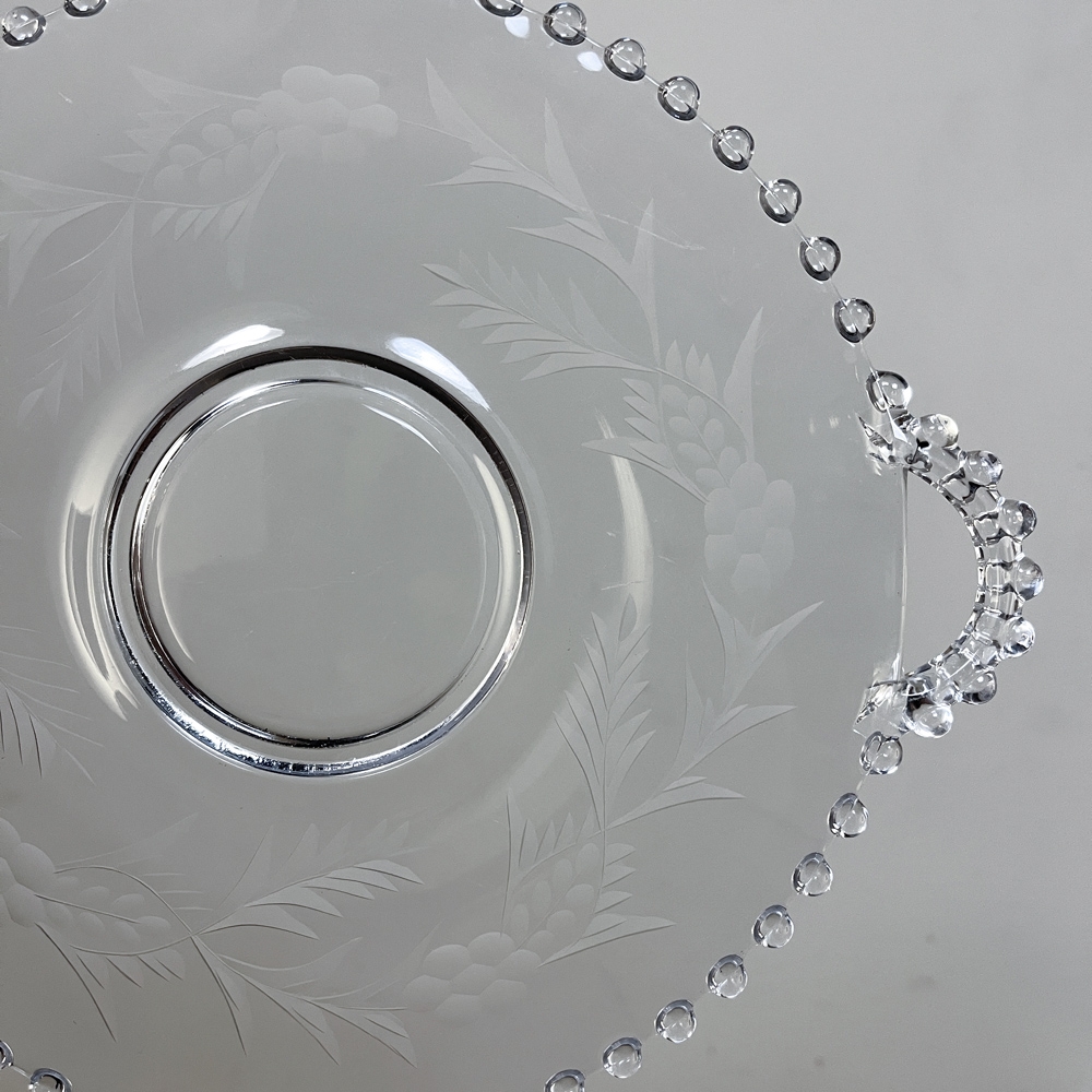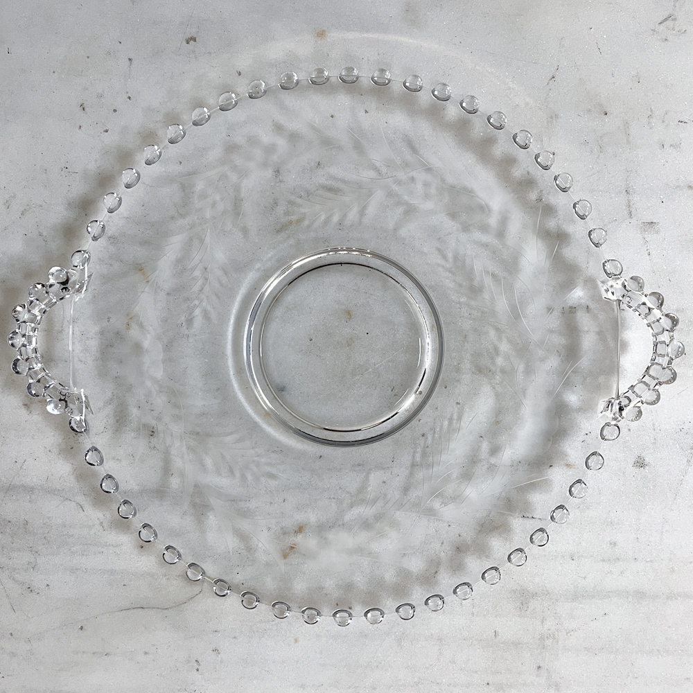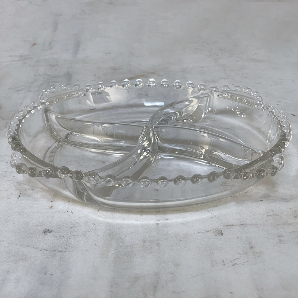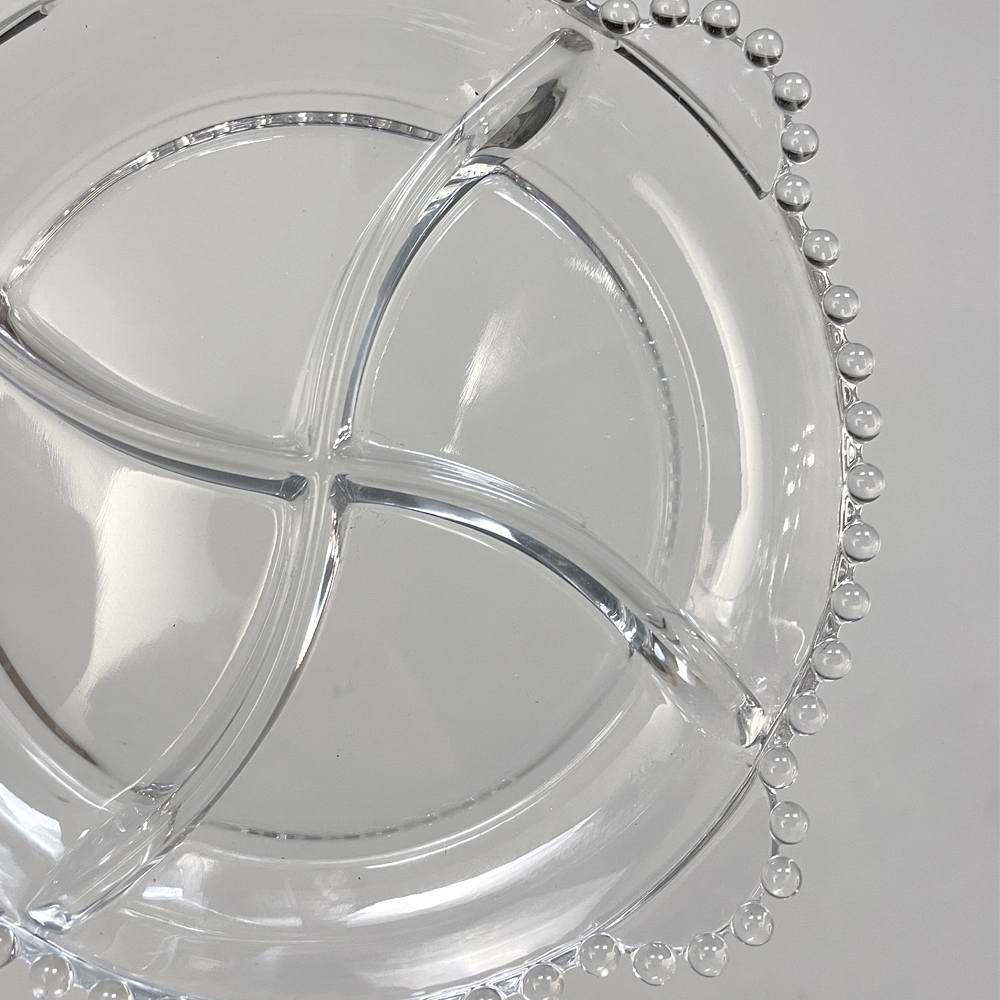 Antique Pressed Glass Crudite Server with Matching Platter can also be used to serve candy with curved dividers allowing you to put four different items on one plate. The matching serving platter has handles for ease in use.