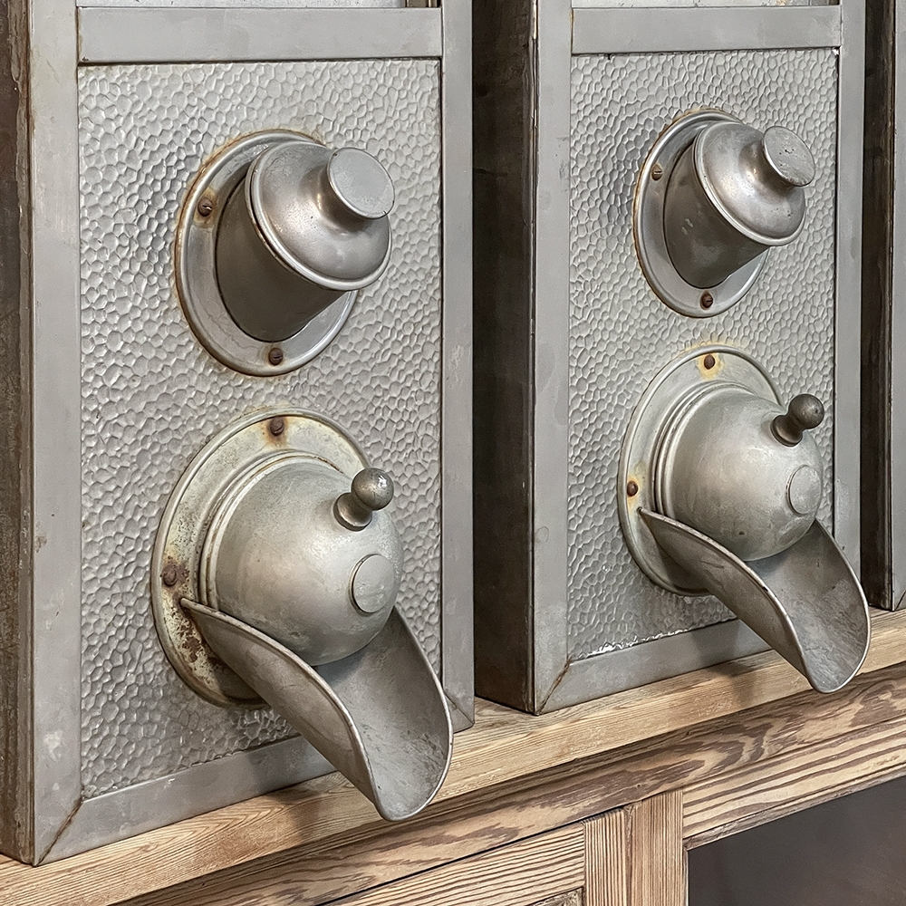 Commercial Coffee Bean Dispenser (4 available- Sold EACH), is a testament to the ingenuity of our ancestors, with an interesting dispenser with integral funnel that allows one to dispense measured portions of beans, or to use the handy scoop that resides in a custom-fitted mount just above that for larger purchases. In more recent years these dispensers have also been employed for nuts and candy, as well! A nostalgic homage to a bygone era when customer service was the norm, with everyone entering a store being greeted and served personally, as opposed to encountering today's rows of plastic-encased pre-packaged commodities.
