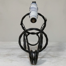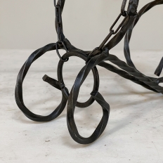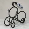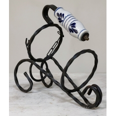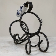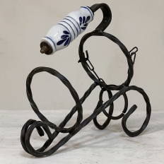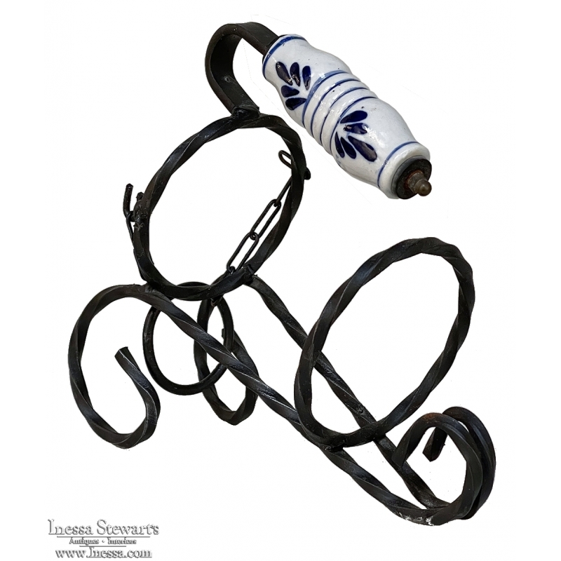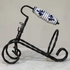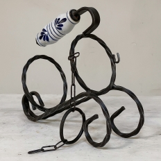 Vintage Wrought Iron Wine Cradle with Blue & White Porcelain Handle is an unusual example of culinary devices that will make the perfect gift for the wine connoisseur in your family! Meticulously forged from twisted rods that hold the bottle slightly upright via the scrolled stand, it has a chain and hoop that drapes over the neck of the bottle to hold it in place. Intriguingly, the handle is a piece of hand-painted Delft porcelain for a colorful and ergonomic user "interface" that sets this wonderful instant family keepsake apart!