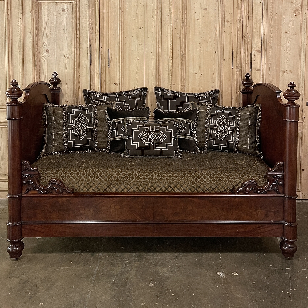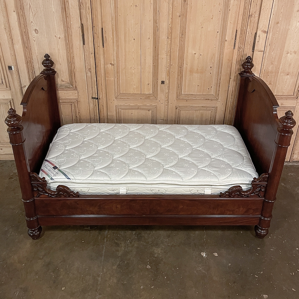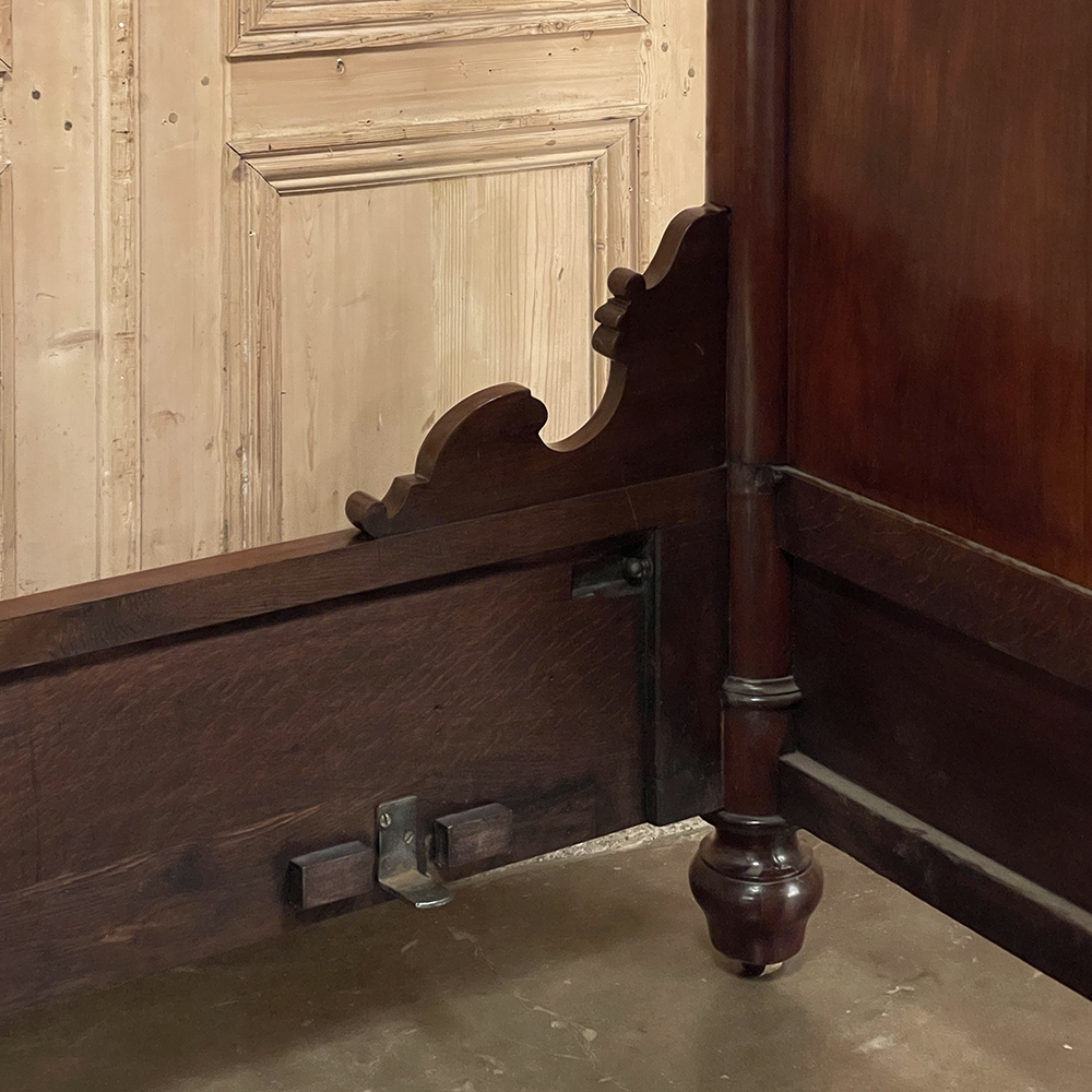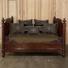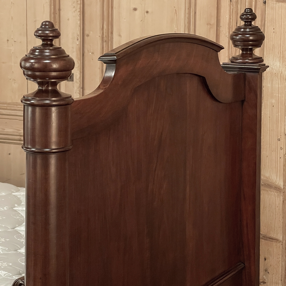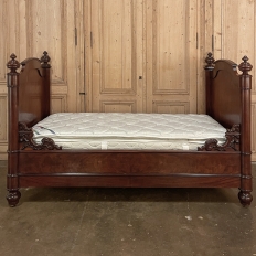 19th Century Napoleon III Period Mahogany Wall Bed is a superbly well-preserved example of French style and ingenuity from the Second Empire! Hand-crafted from exotic imported mahogany, it features a symmetrical design, with mirror image side boards connected with a substantial front rail fitted with carved corbels on top, and finely molded into the design creating an extraordinarily stylish look that is also amazingly sturdy. Turned legs below mirror the turned finials on top of the corner posts, with the finials at the back halved to make it easy to place the bed against the wall. Even the wheels built into the bottom of the legs are unidirectional, allowing one person to easily roll the bed away from the wall for cleaning, then roll it back into place. Such beds were very desirable as a sofa during the day ~ a great place to lounge during leisure time, but at night become a bed suitable for one making it as versatile as it is gorgeous to behold. The tailored yet classic lines remain as popular and in vogue today as they were when originally conceived centuries ago.