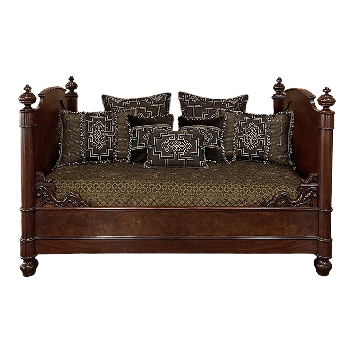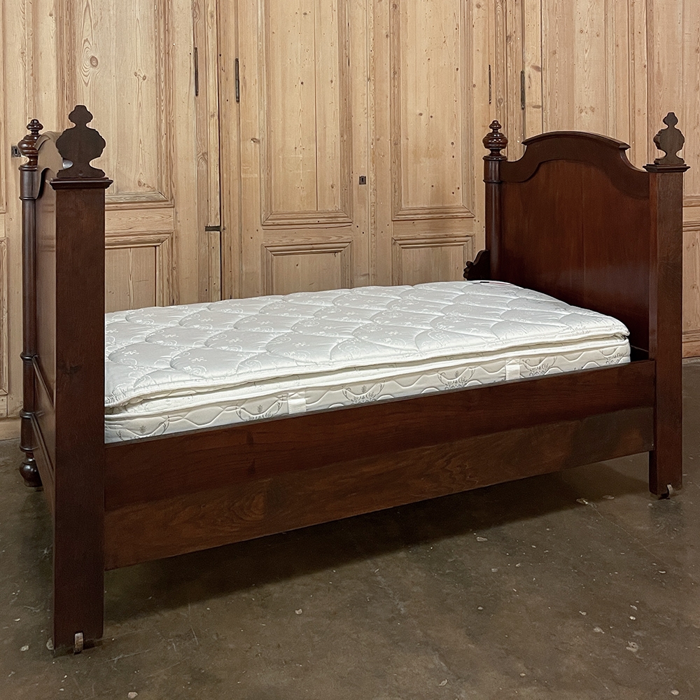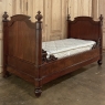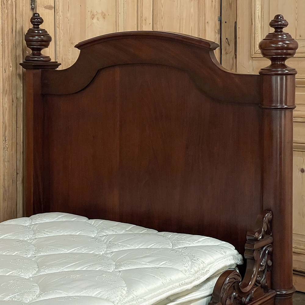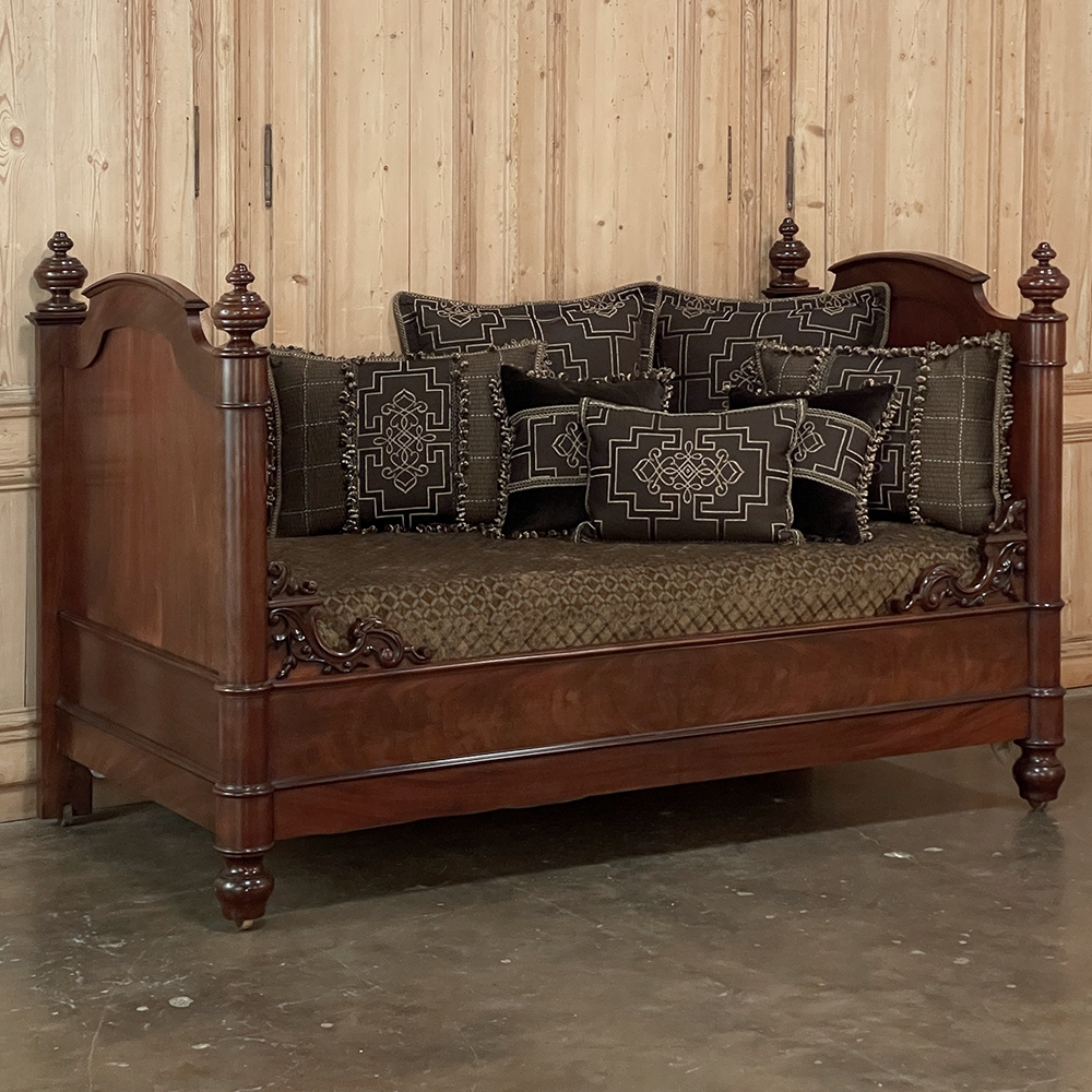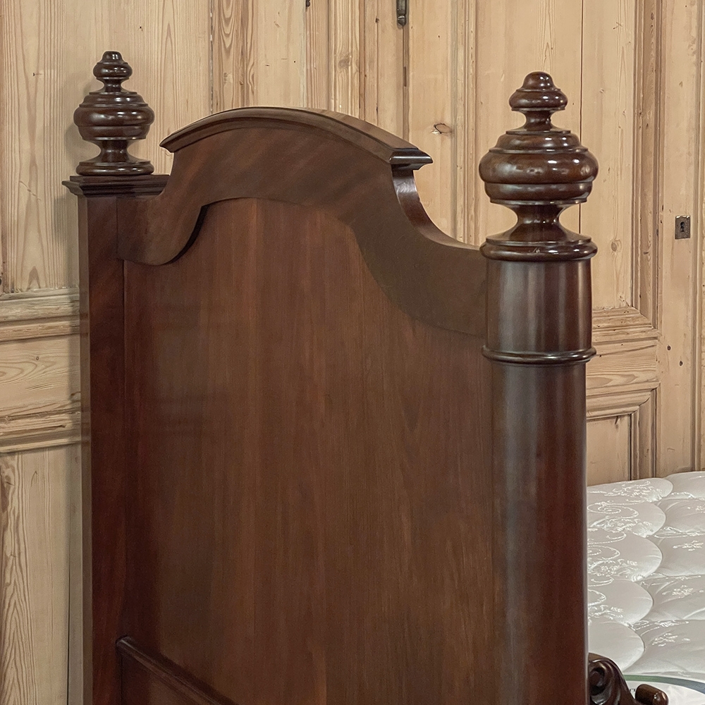 19th Century Napoleon III Period Mahogany Wall Bed is a superbly well-preserved example of French style and ingenuity from the Second Empire! Hand-crafted from exotic imported mahogany, it features a symmetrical design, with mirror image side boards connected with a substantial front rail fitted with carved corbels on top, and finely molded into the design creating an extraordinarily stylish look that is also amazingly sturdy. Turned legs below mirror the turned finials on top of the corner posts, with the finials at the back halved to make it easy to place the bed against the wall. Even the wheels built into the bottom of the legs are unidirectional, allowing one person to easily roll the bed away from the wall for cleaning, then roll it back into place. Such beds were very desirable as a sofa during the day ~ a great place to lounge during leisure time, but at night become a bed suitable for one making it as versatile as it is gorgeous to behold. The tailored yet classic lines remain as popular and in vogue today as they were when originally conceived centuries ago.