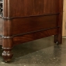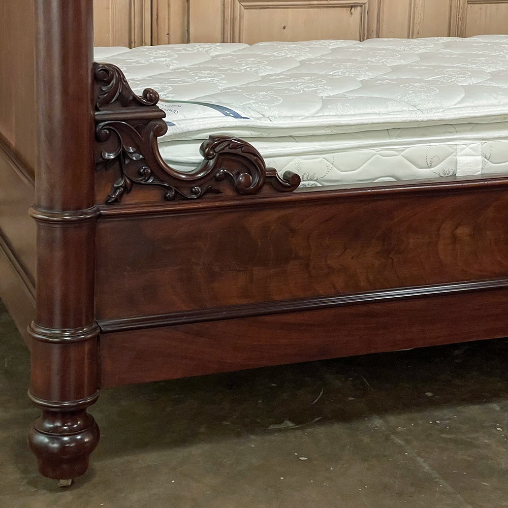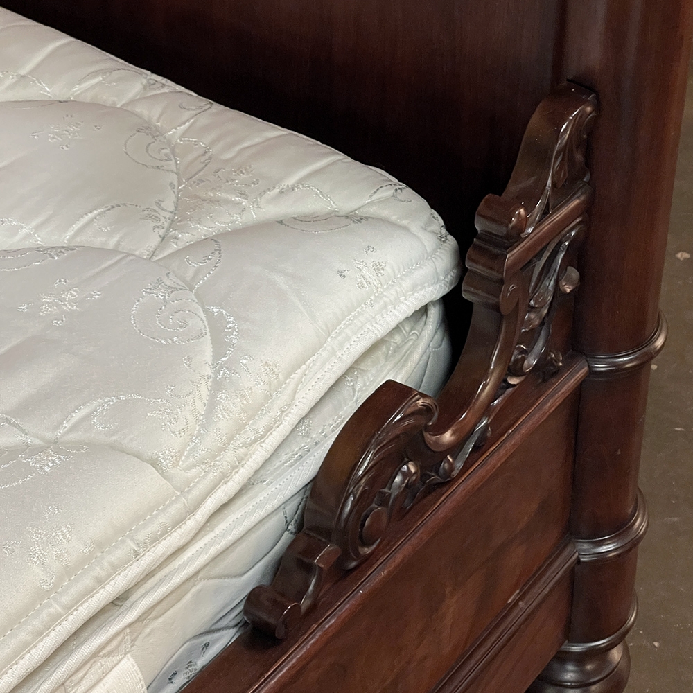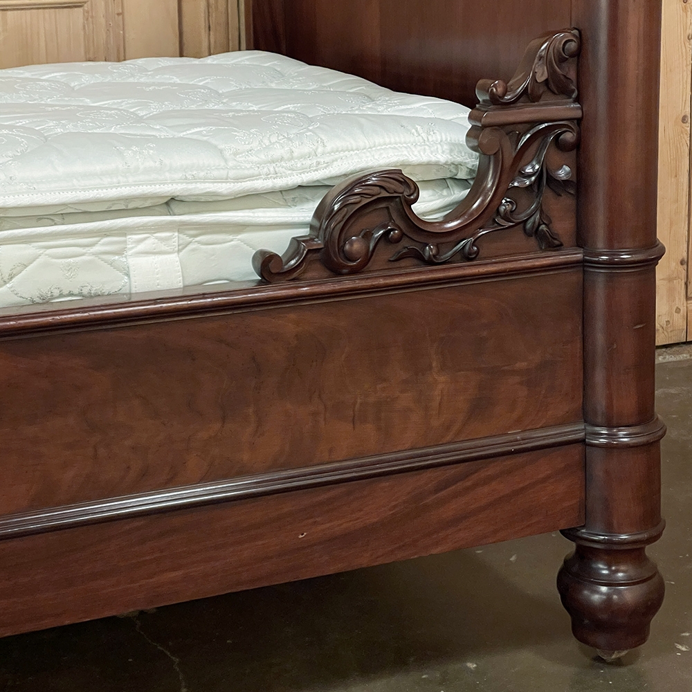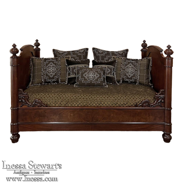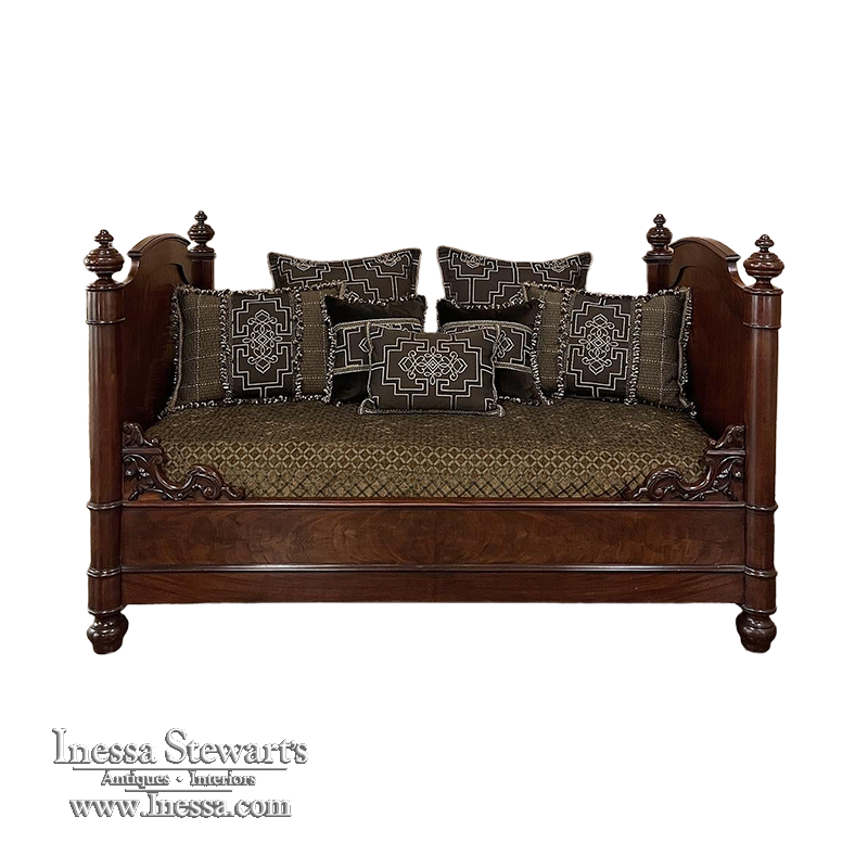 19th Century Napoleon III Period Mahogany Wall Bed is a superbly well-preserved example of French style and ingenuity from the Second Empire! Hand-crafted from exotic imported mahogany, it features a symmetrical design, with mirror image side boards connected with a substantial front rail fitted with carved corbels on top, and finely molded into the design creating an extraordinarily stylish look that is also amazingly sturdy. Turned legs below mirror the turned finials on top of the corner posts, with the finials at the back halved to make it easy to place the bed against the wall. Even the wheels built into the bottom of the legs are unidirectional, allowing one person to easily roll the bed away from the wall for cleaning, then roll it back into place. Such beds were very desirable as a sofa during the day ~ a great place to lounge during leisure time, but at night become a bed suitable for one making it as versatile as it is gorgeous to behold. The tailored yet classic lines remain as popular and in vogue today as they were when originally conceived centuries ago.