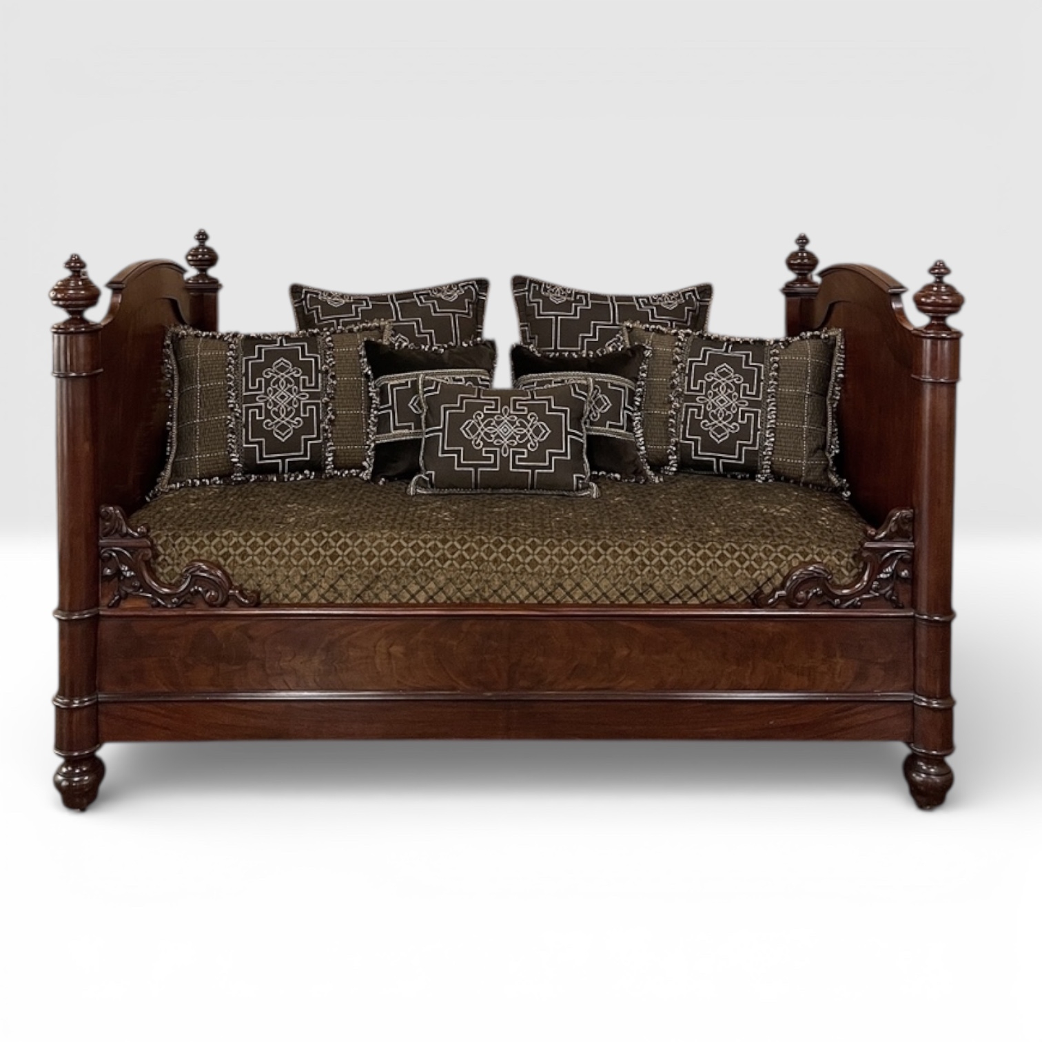 ALSO available are the exquisite linens shown in the photos, which include the bedspread and seven matching pillows as shown, available separately for $1,980. Contact the Dallas showroom for details or questions.
