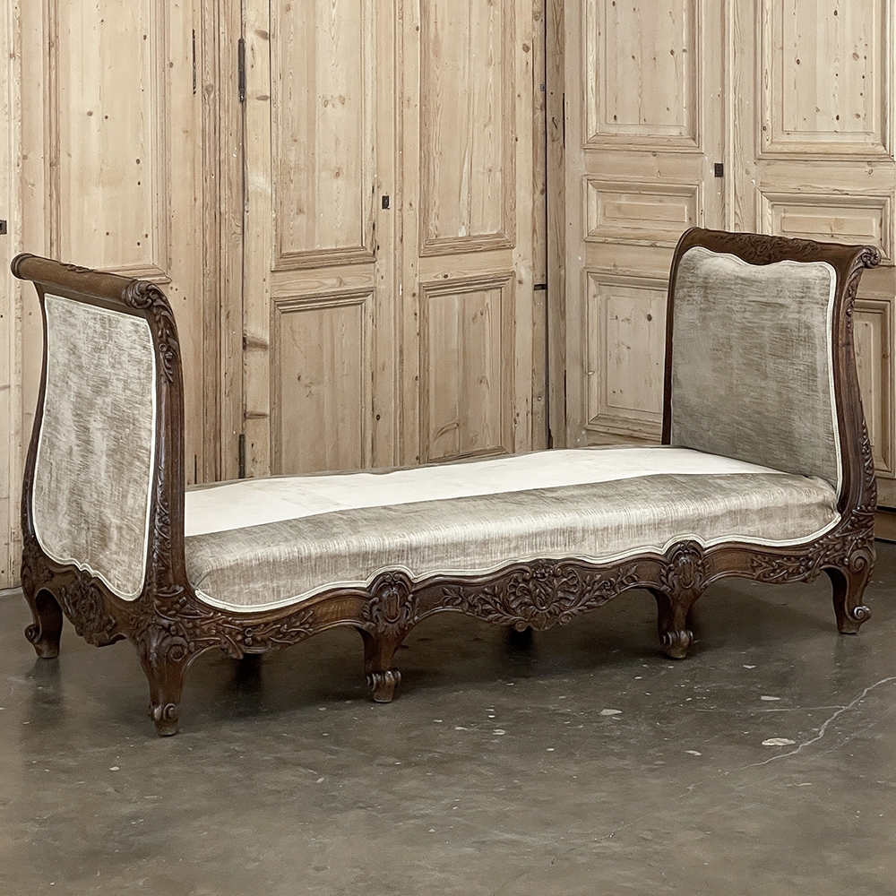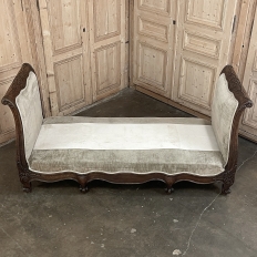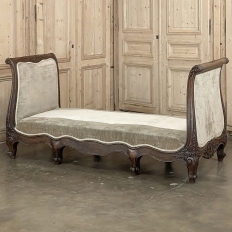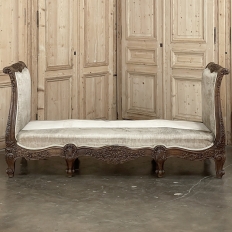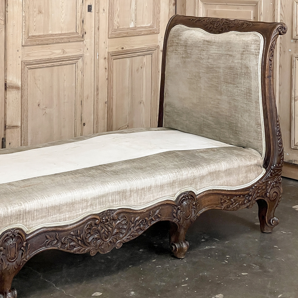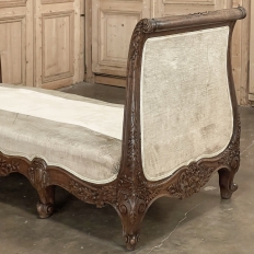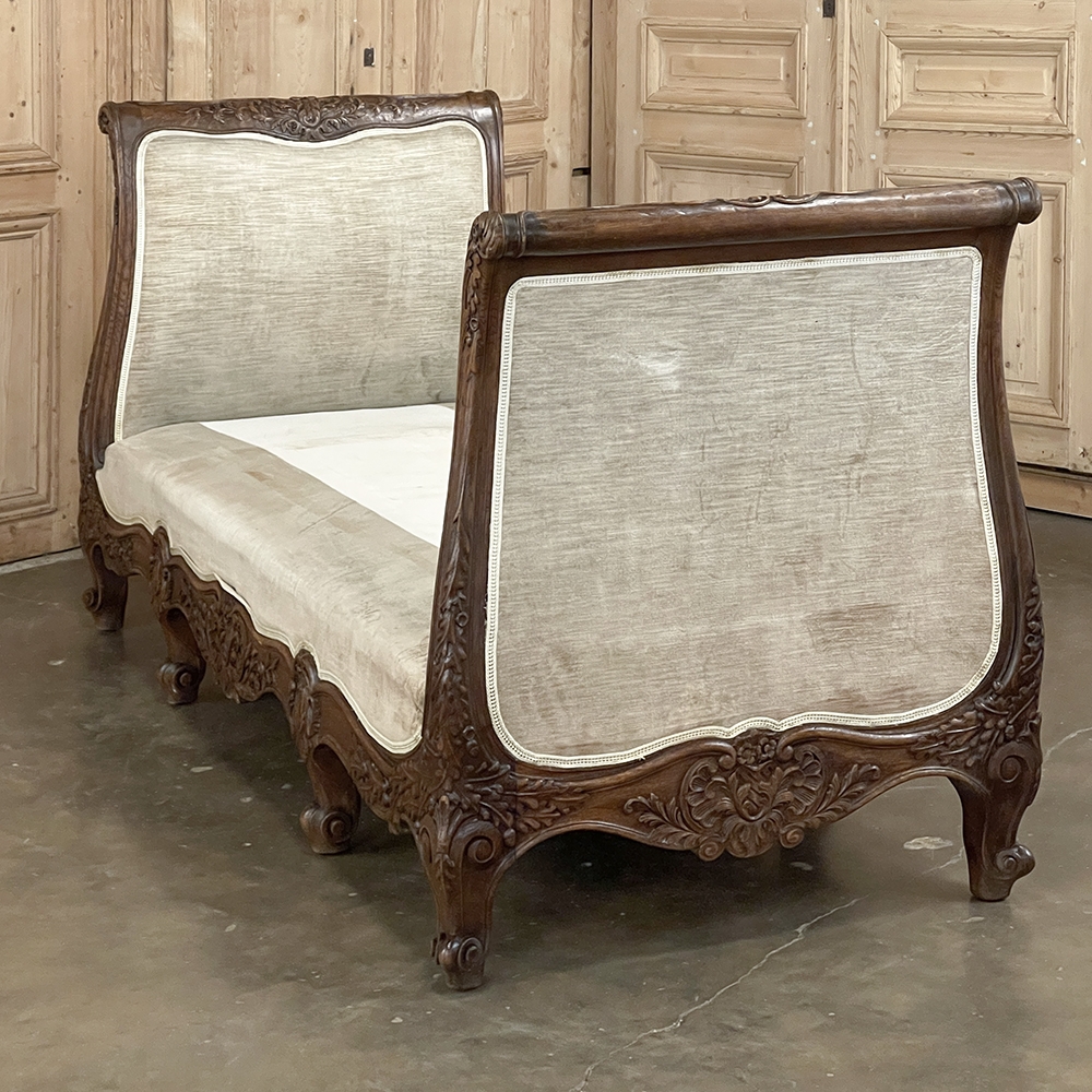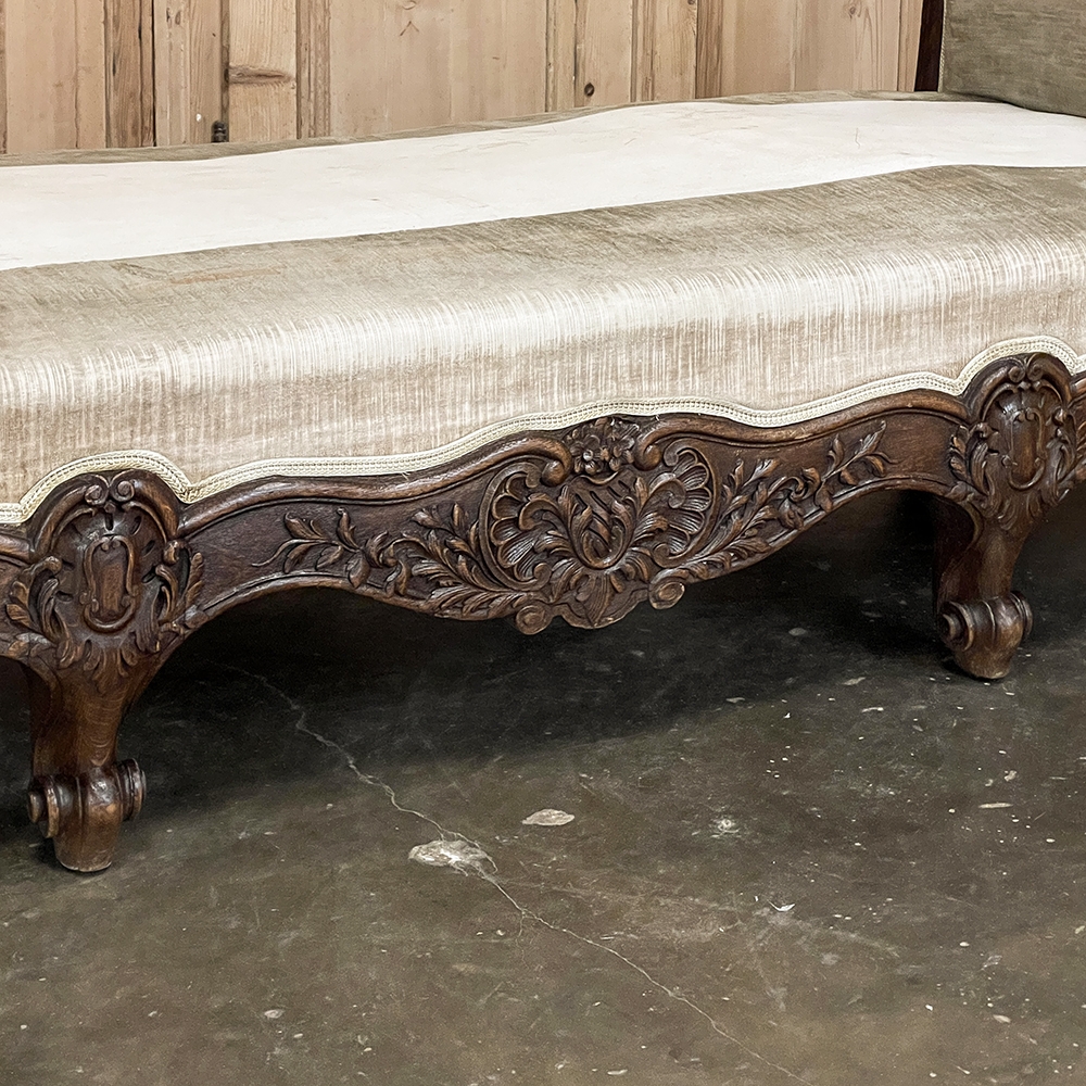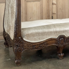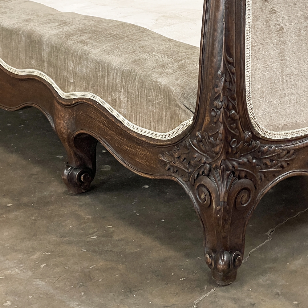 Antique French Louis XV Day Bed ~ Sofa is a truly unusual find! Designed on a larger scale than is typical, it will make the perfect addition to any room, and is ready to customize to your particular tastes! Sculpted from solid old-growth oak which has been given a luxurious walnut stain, it features the sensuous, naturalistic lines that are the hallmark of the style. Each of the four cornerposts are gracefully scrolled, lavishly carved with acanthus leaf, foliates and oak leaves, and designed with a "rolled" top that traverses the span between the posts with curved edges that have no sharp corners. The traverse is richly carved with scrollwork and foliate sprays to complement the rest of the embellishment. The undulating form of the apron that connects the two sides is also lavishly carved on three sides with a display of stylized shell and foliate sprays, with the aforementioned oak leaves emanating out from the corners to tie in the design. No less than eight boldly scrolled, substantially formed legs provide support, with carved embellishment on the six that show towards the room, and all adorned with escargot feet. Luxurious mohair upholstery was applied with expensive gimp to create a backdrop for your own stylistic addition!