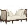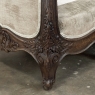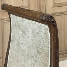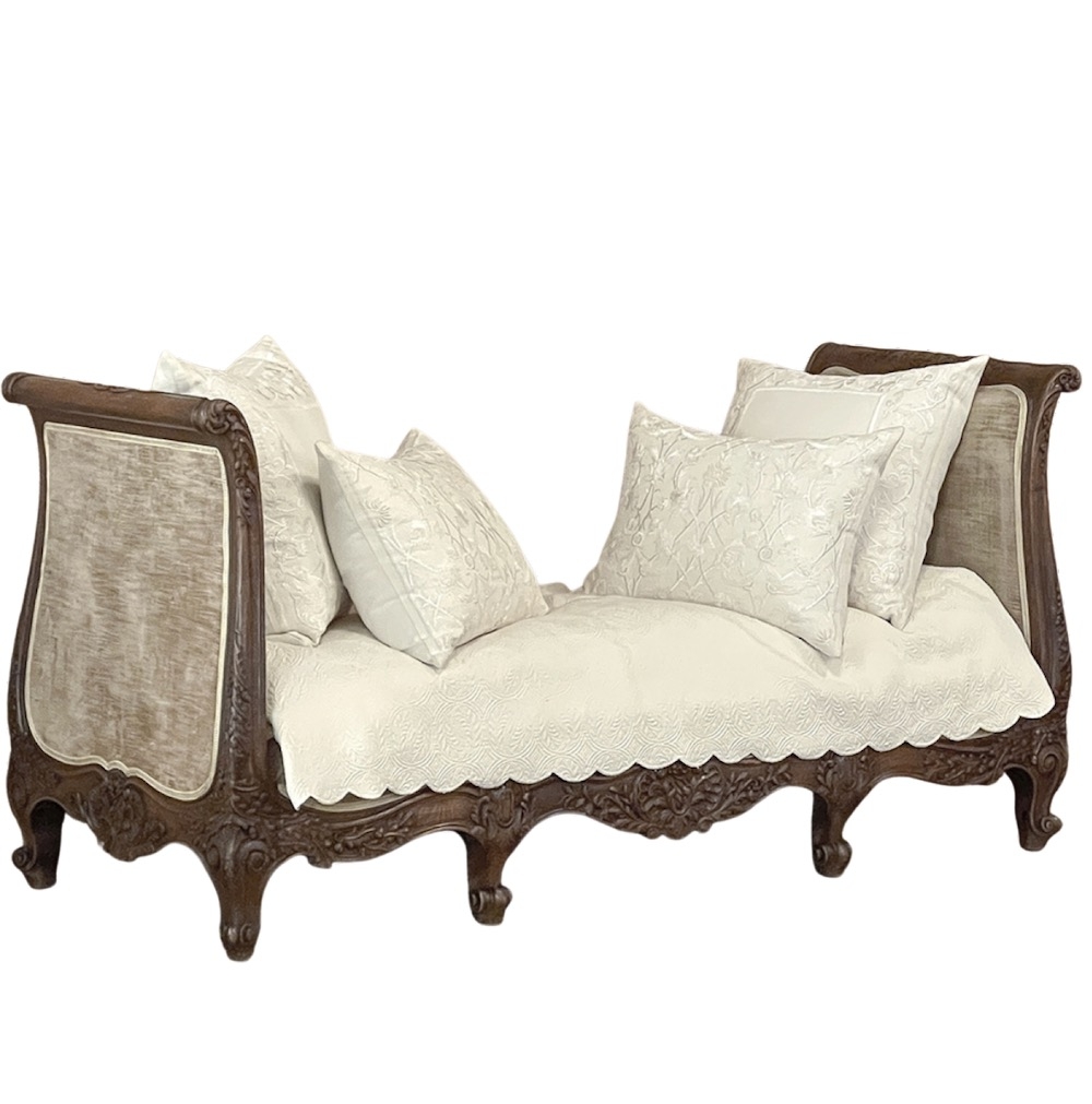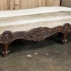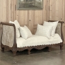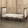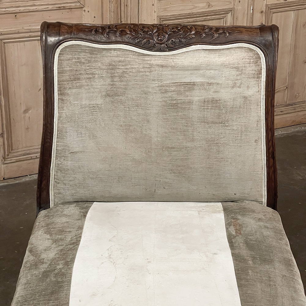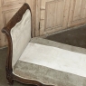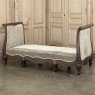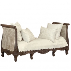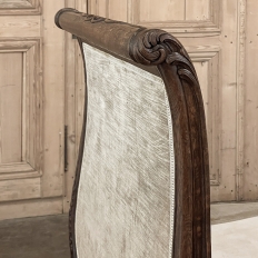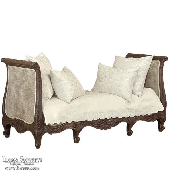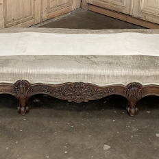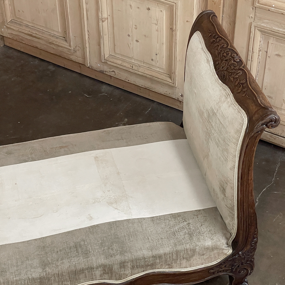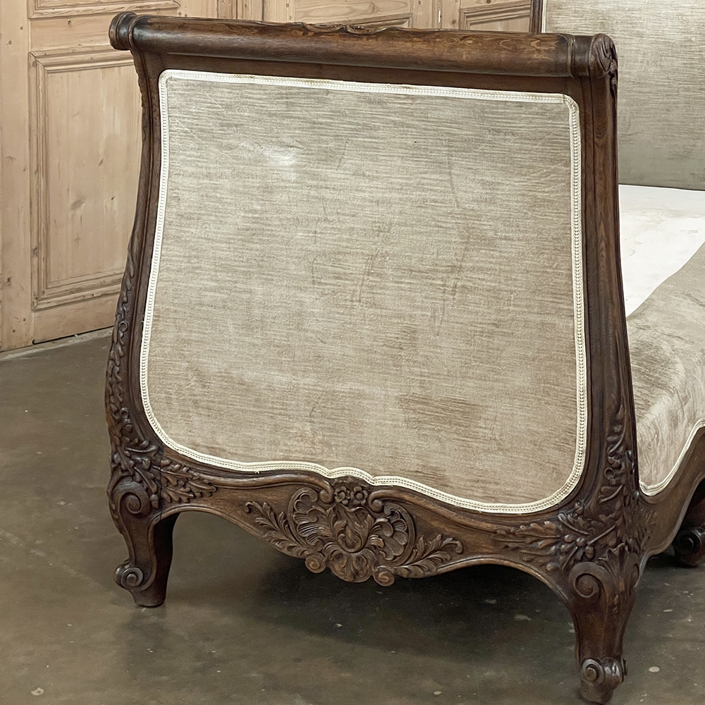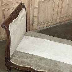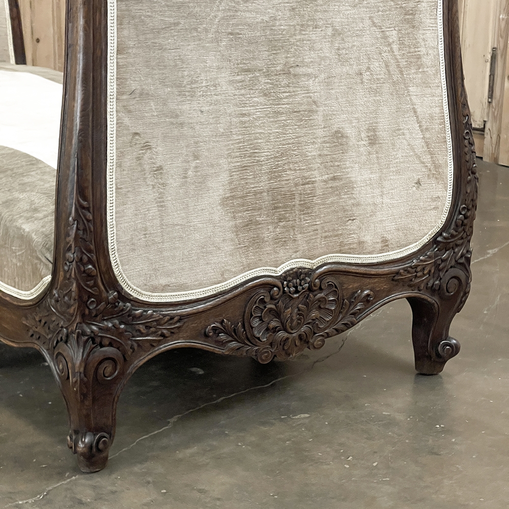 Antique French Louis XV Day Bed ~ Sofa is a truly unusual find! Designed on a larger scale than is typical, it will make the perfect addition to any room, and is ready to customize to your particular tastes! Sculpted from solid old-growth oak which has been given a luxurious walnut stain, it features the sensuous, naturalistic lines that are the hallmark of the style. Each of the four cornerposts are gracefully scrolled, lavishly carved with acanthus leaf, foliates and oak leaves, and designed with a "rolled" top that traverses the span between the posts with curved edges that have no sharp corners. The traverse is richly carved with scrollwork and foliate sprays to complement the rest of the embellishment. The undulating form of the apron that connects the two sides is also lavishly carved on three sides with a display of stylized shell and foliate sprays, with the aforementioned oak leaves emanating out from the corners to tie in the design. No less than eight boldly scrolled, substantially formed legs provide support, with carved embellishment on the six that show towards the room, and all adorned with escargot feet. Luxurious mohair upholstery was applied with expensive gimp to create a backdrop for your own stylistic addition!
