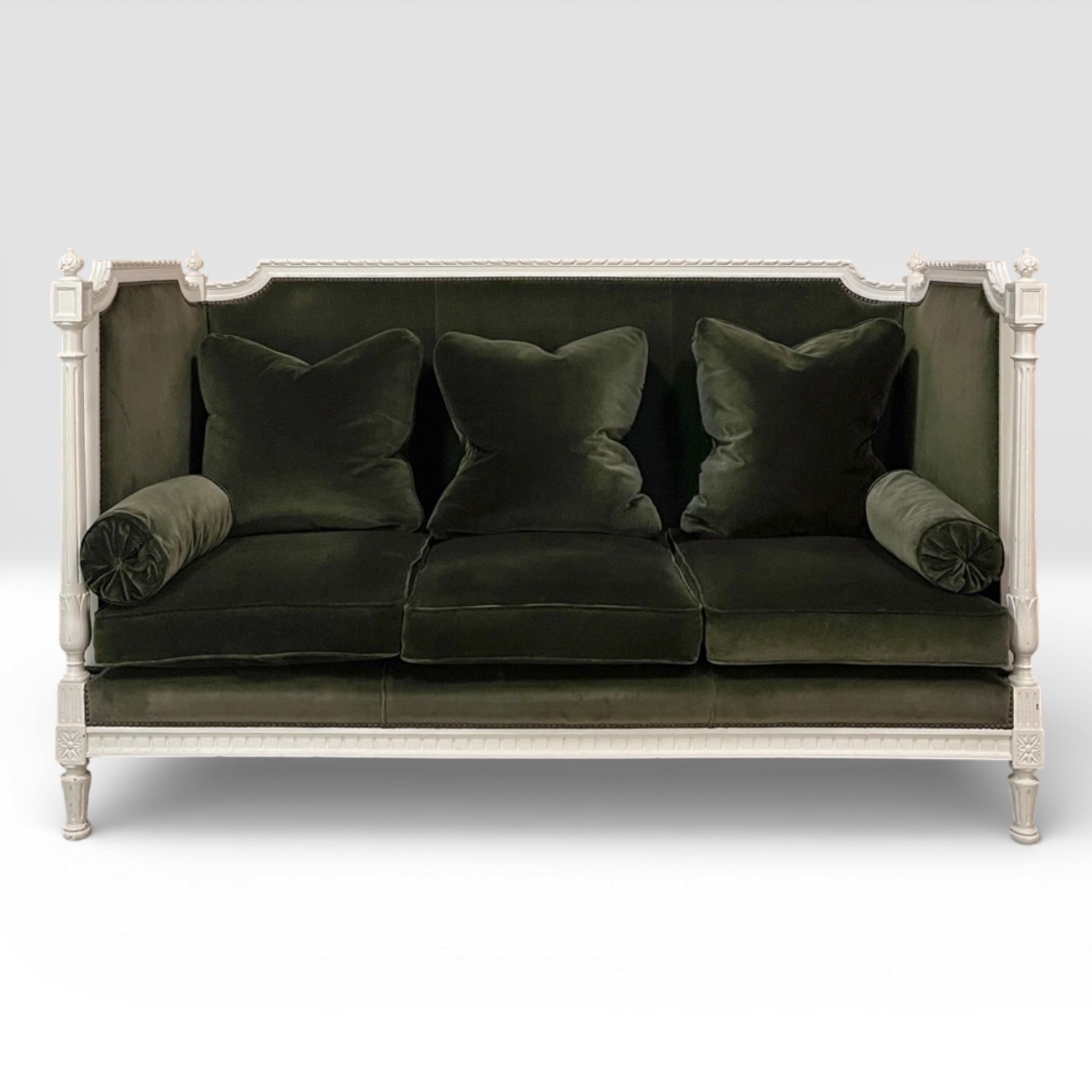 SaleAntique French Louis XVI Painted Day Bed ~ Sofa, crafted in the neoclassical revival style championed by Louis XVI, it features an artistically carved framework with raised side panels equal to the height of the seat back, adorned with concave corners and carved with spiral ribbon motif down the entire length. The same carved motif appears also on the apron below. Four columns provide support, with the front consisting of tapered and fluted designs with upturned foliate bases, rosettes, and tapered and fluted legs all around. Atop each of the four cornerposts also appear ostrich plume finials, all delightfully hand-carved. The painted finish has achieved a subtle patina over the decades, only making the carved detail more alluring. The framework surrounds a plush upholstery padded on the sides and back, fitted with three stuffed cushions, and even includes three original cushions. Sorry, the bolsters shown are NOT included. All are upholstered in luxurious dark green mohair for long lasting comfort!