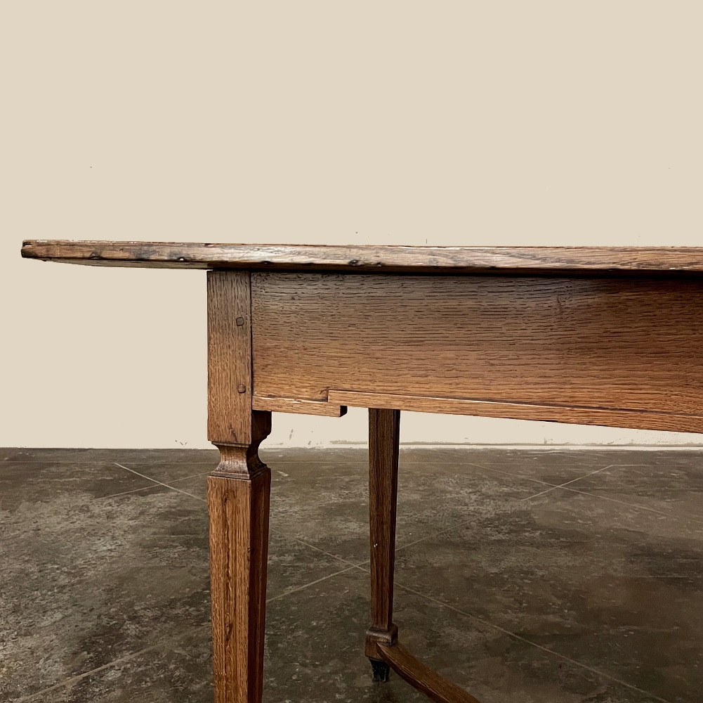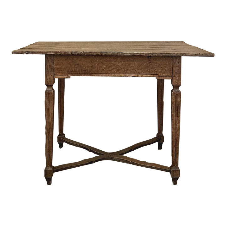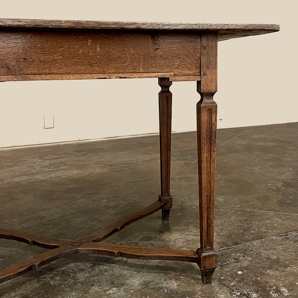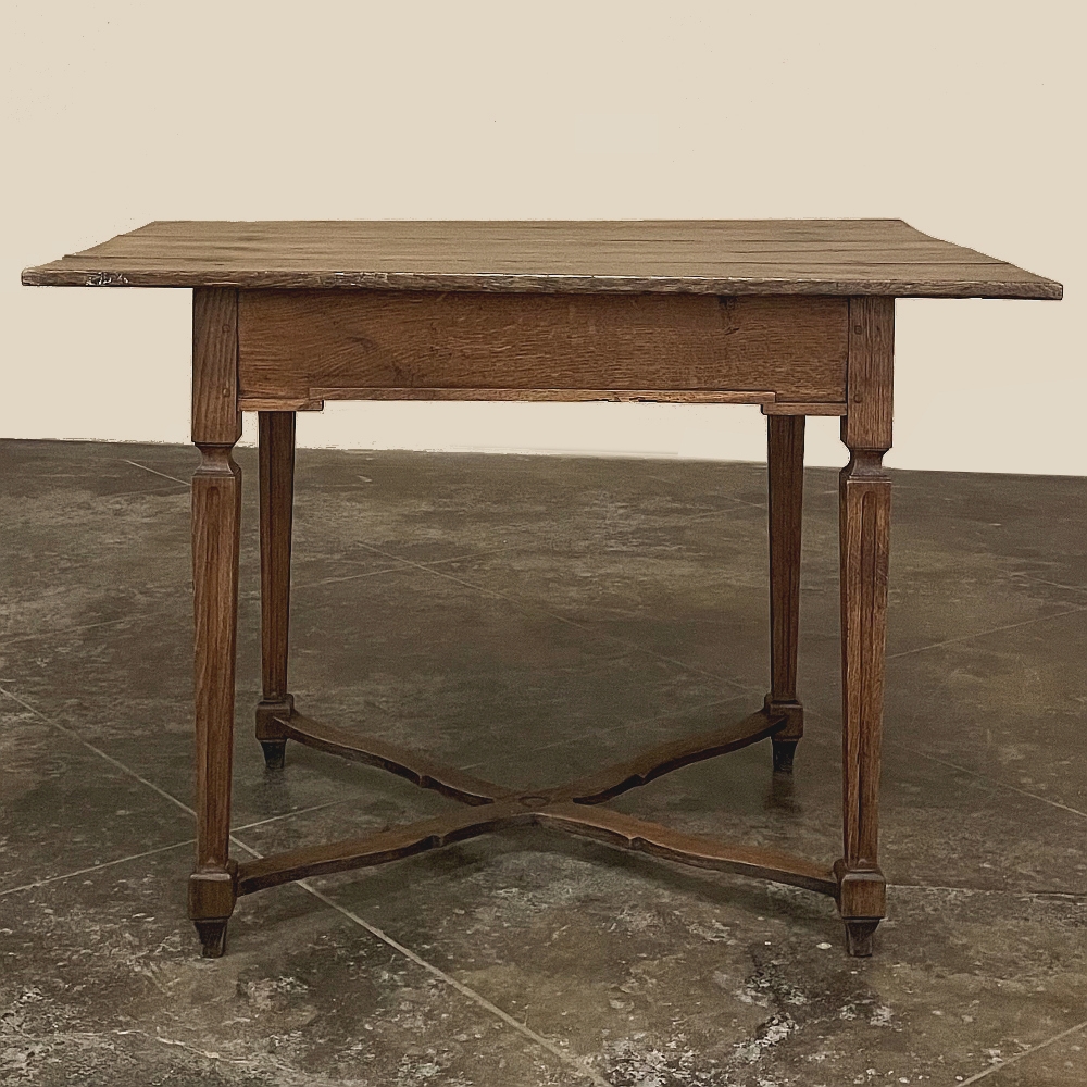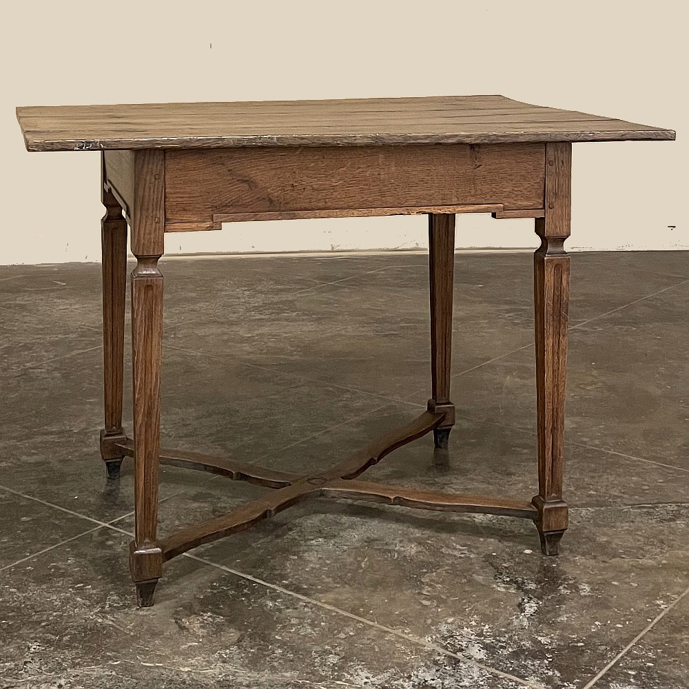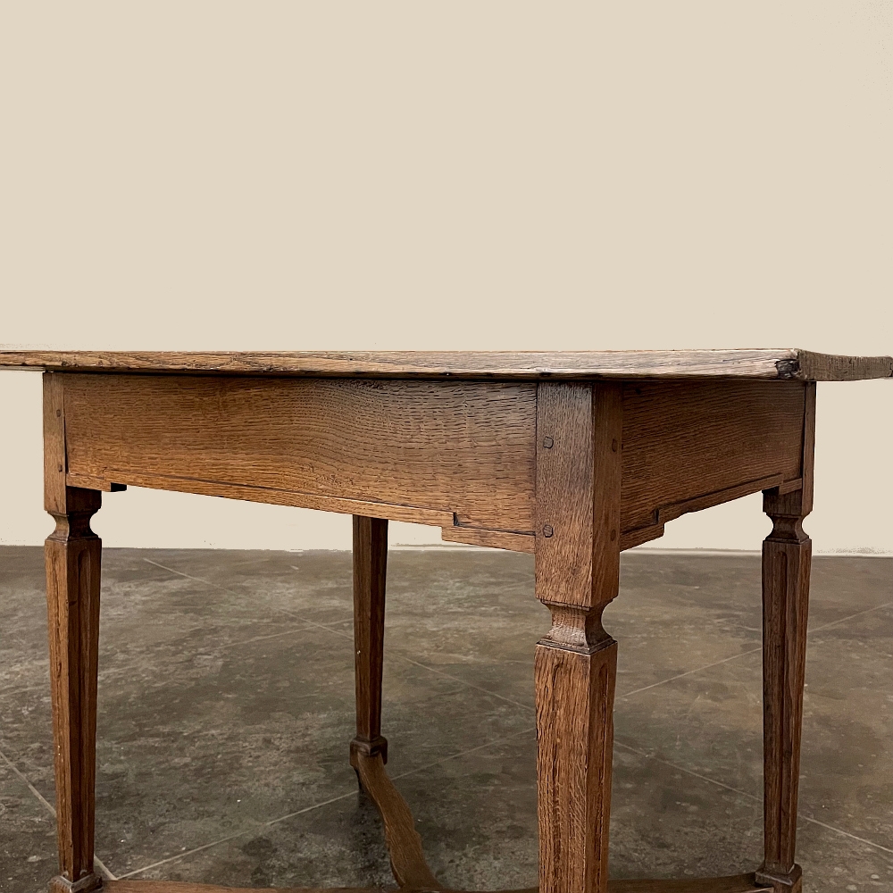 18th Century French Louis XVI Period Rustic Side Table is a dramatic example of the efforts of rural artisans to follow the dictates of the court. The reign of Louis XVI ushered in a return to classical architecture in building and furniture design, with this table a perfect example. Solid oak plank top with nice overhangs rests on a tailored plank apron connected to four legs that extend from the bottom of the top planks to the floor as one piece, with tapered and faceted form. A subtly scrolled "X" stretcher connects all legs together below for longevity and strength in the design. Note the squared pegs in the round holes of the mortise & tenon joinery, a sure sign that hand-craftsmanship was used throughout the build. Designed to last for centuries!