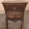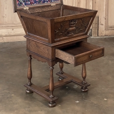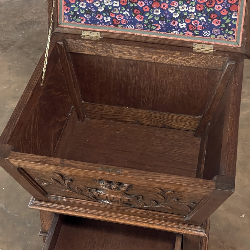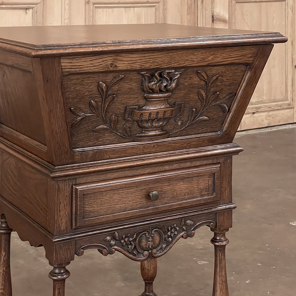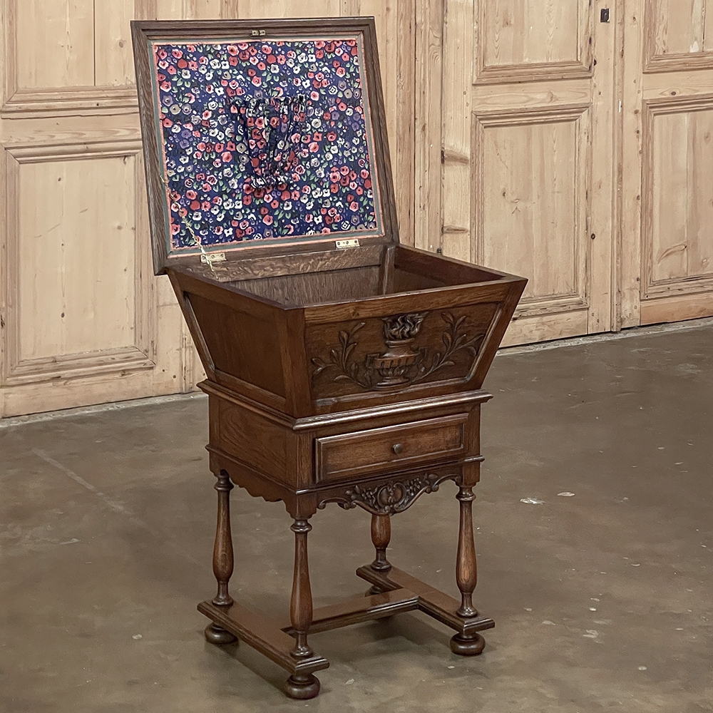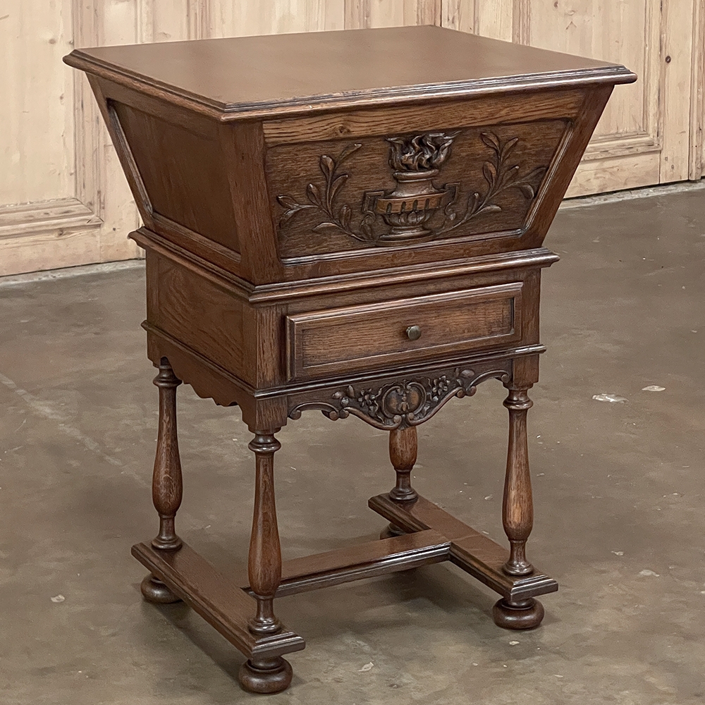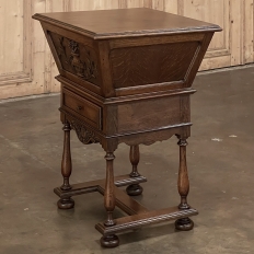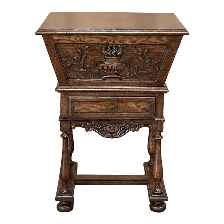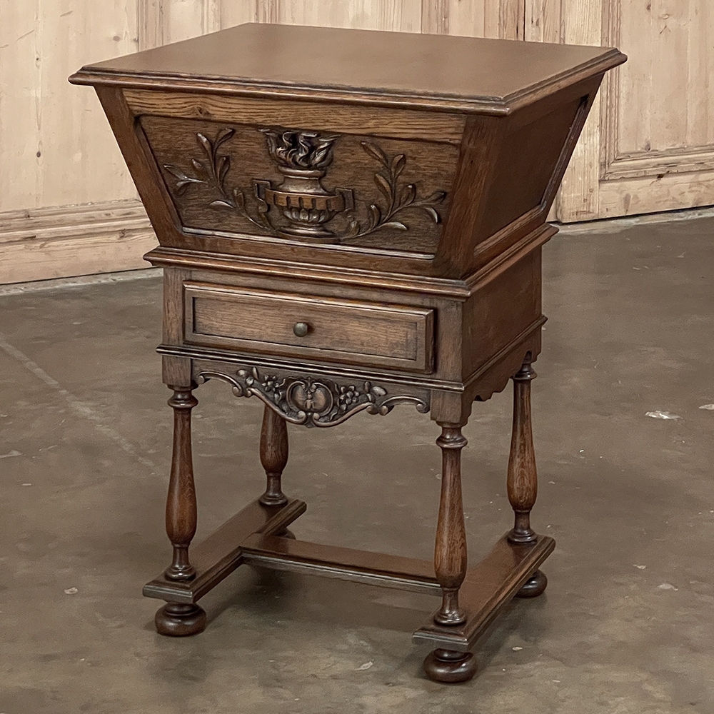 19th Century Country French Mini-Petrin Sewing Cabinet ~ End Table is one of the most charming pieces we've seen in decades! Designed to look like a doughbox, it features the trademark trapezoidal shape of the box on top, mated to a platform that contains a full width drawer, elaborately contoured and hand-carved apron, and support provided by four elongated teardrop shaped legs mated to a classic "H" stretcher fitted with bun feet. The apron motifs feature stylized shell, floral and foliate motifs framed by scrollwork, while the main front panel above boasts a full relief depiction of a flaming urn flanked by laurel sprays. Aside from the drawer providing convenient storage, the top opens up trunk-like to reveal the original intention of the piece, with a fabric mount with pocket inside. An excellent choice as an end table, a platform for displaying lamps, vases, statuary or the like, or even serving as a bedside companion!