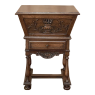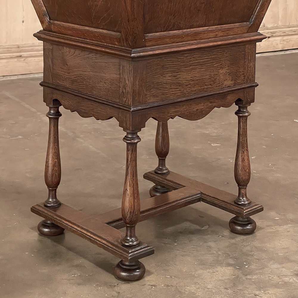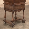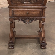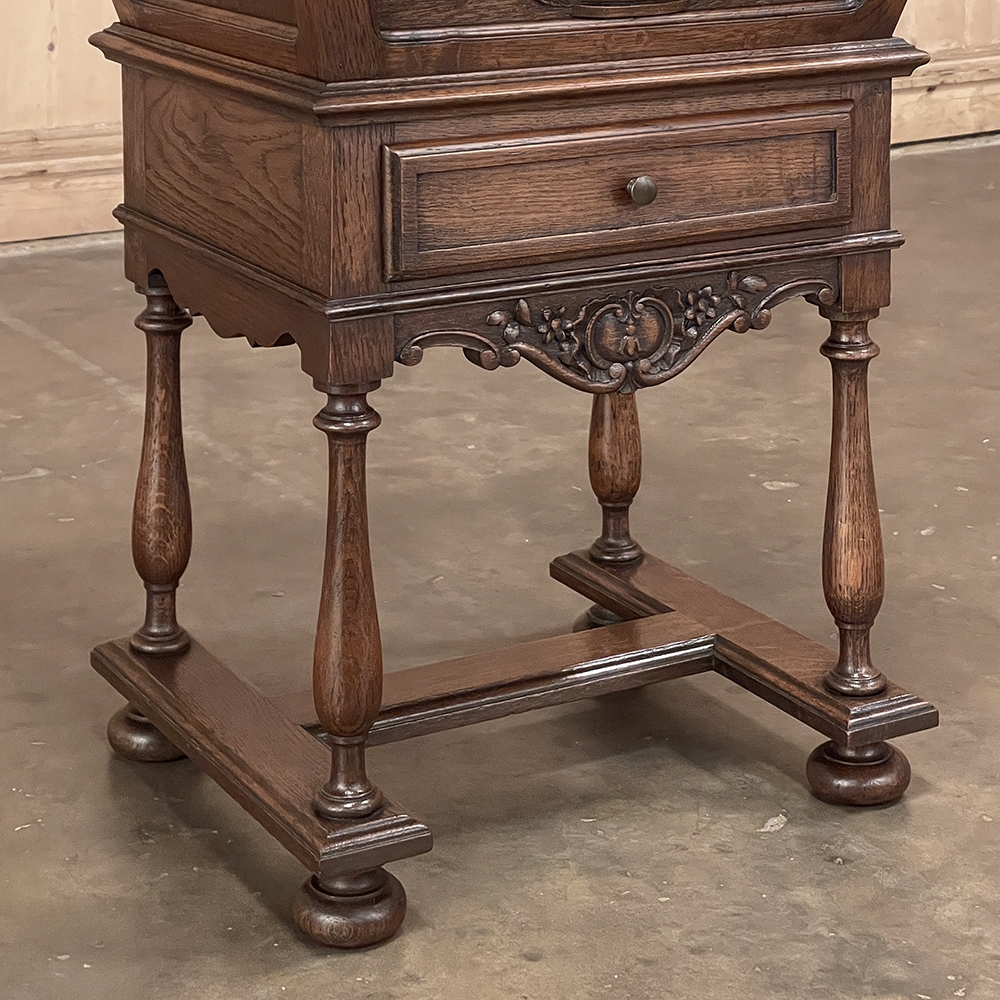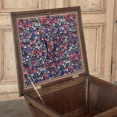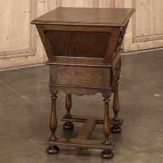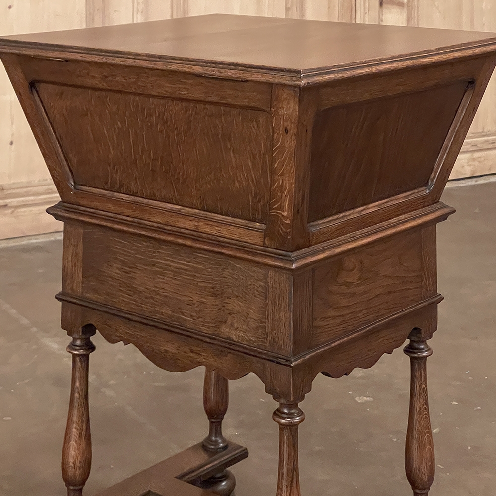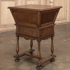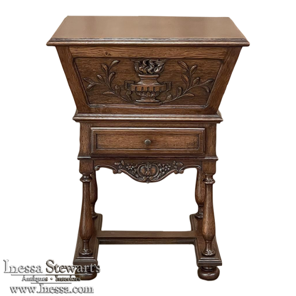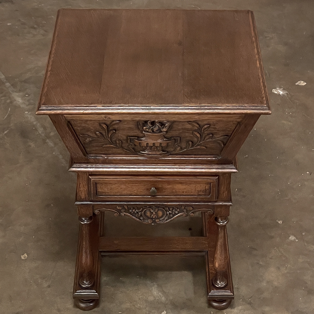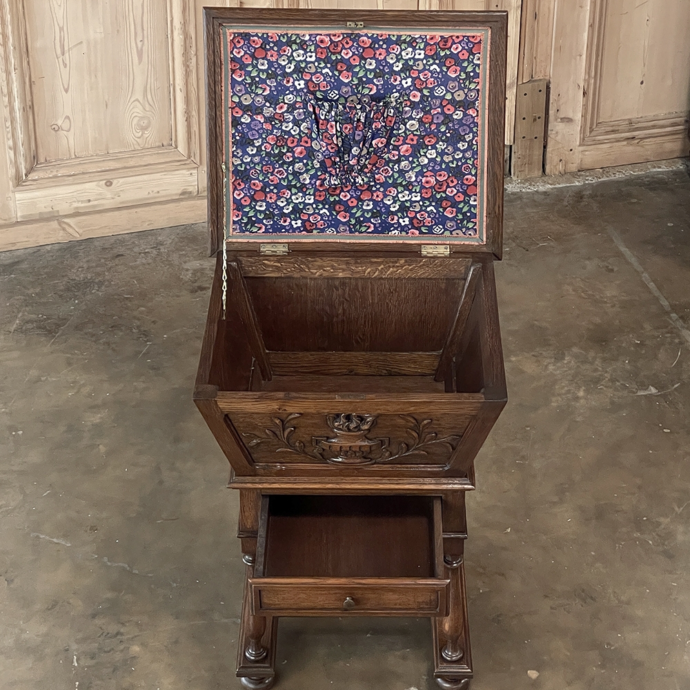19th Century Country French Mini-Petrin Sewing Cabinet ~ End Table is one of the most charming pieces we've seen in decades! Designed to look like a doughbox, it features the trademark trapezoidal shape of the box on top, mated to a platform that contains a full width drawer, elaborately contoured and hand-carved apron, and support provided by four elongated teardrop shaped legs mated to a classic "H" stretcher fitted with bun feet. The apron motifs feature stylized shell, floral and foliate motifs framed by scrollwork, while the main front panel above boasts a full relief depiction of a flaming urn flanked by laurel sprays. Aside from the drawer providing convenient storage, the top opens up trunk-like to reveal the original intention of the piece, with a fabric mount with pocket inside. An excellent choice as an end table, a platform for displaying lamps, vases, statuary or the like, or even serving as a bedside companion!