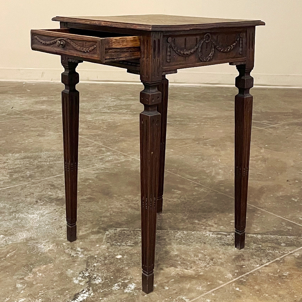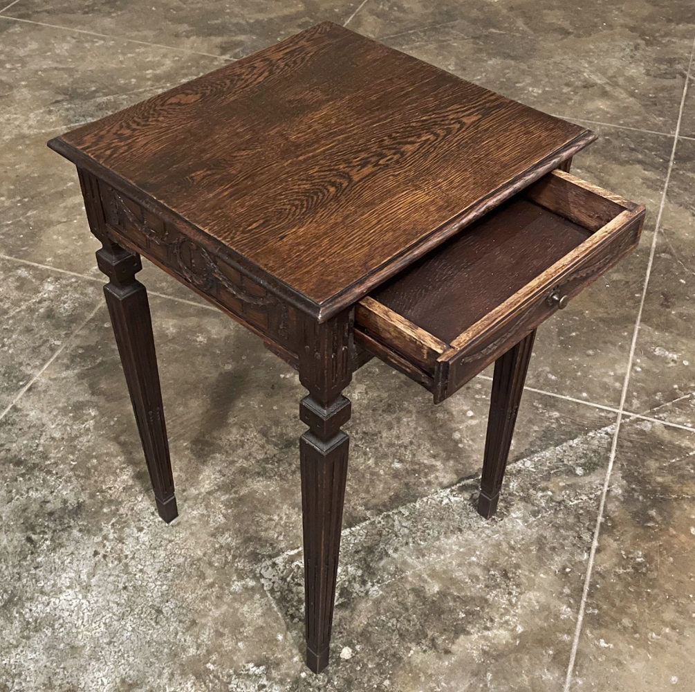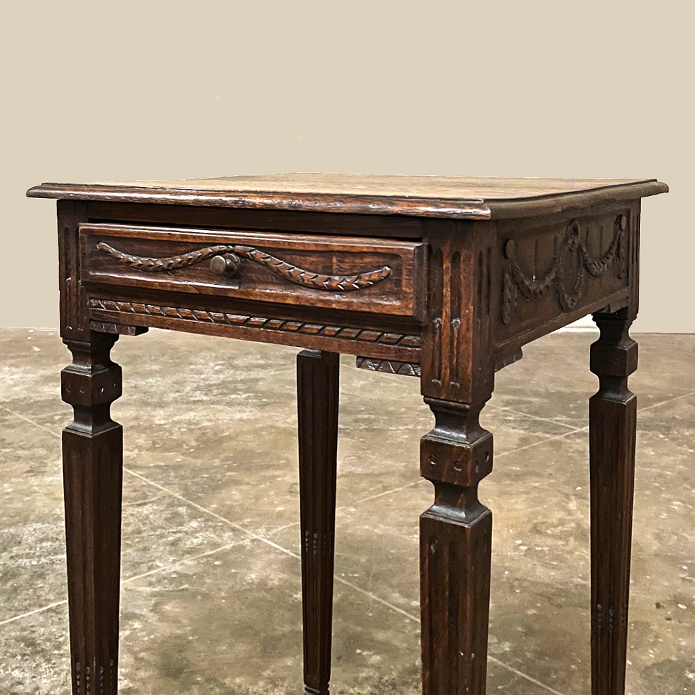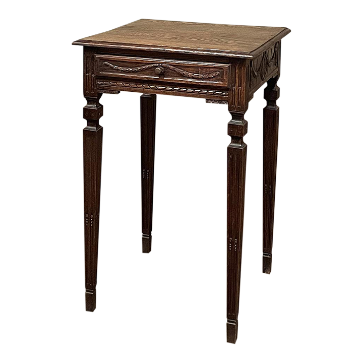 19th Century Country French Neoclassical Louis XVI End Table ~ Lamp Table represents the essence of refined architecture rendered by capable rural artisans! Utilizing indigenous old-growth oak, they fashioned four elegantly tapered legs that join to the table via reeded and fluted corner plinths. The drawer facade is enhanced with carved wheat swags and a brass knob, with the remaining three sides featuring more elaborate wheat swags centered with a wreath. Solid plank top is square and beveled, with all four sides finished so that the table can be placed anywhere in the room one desires!