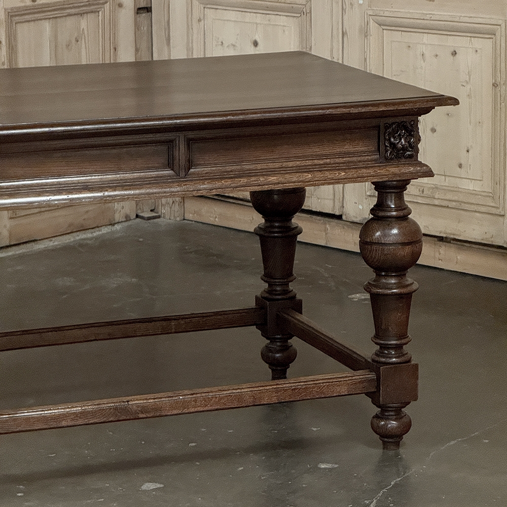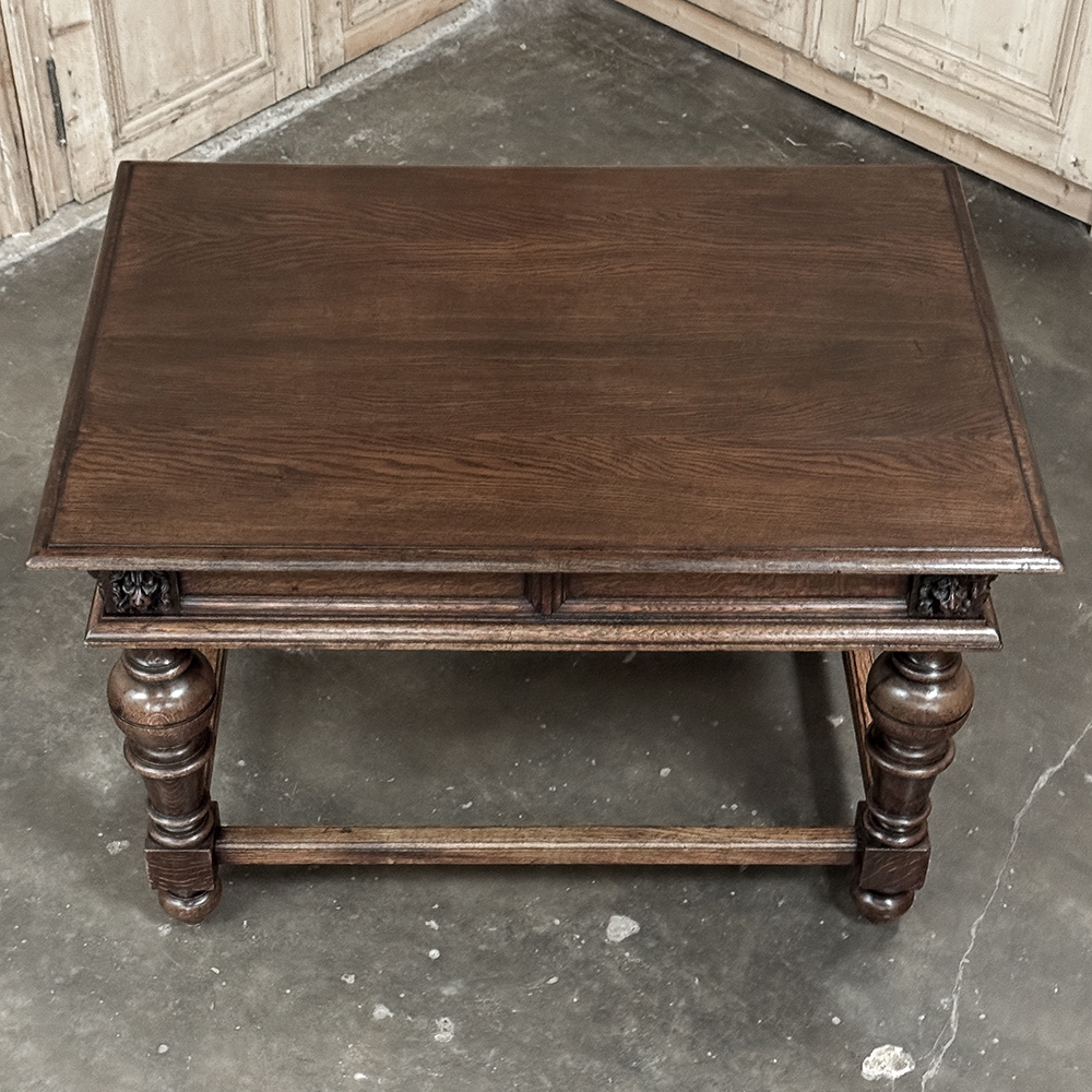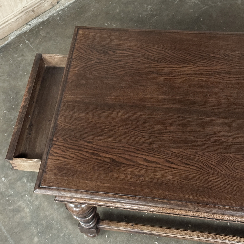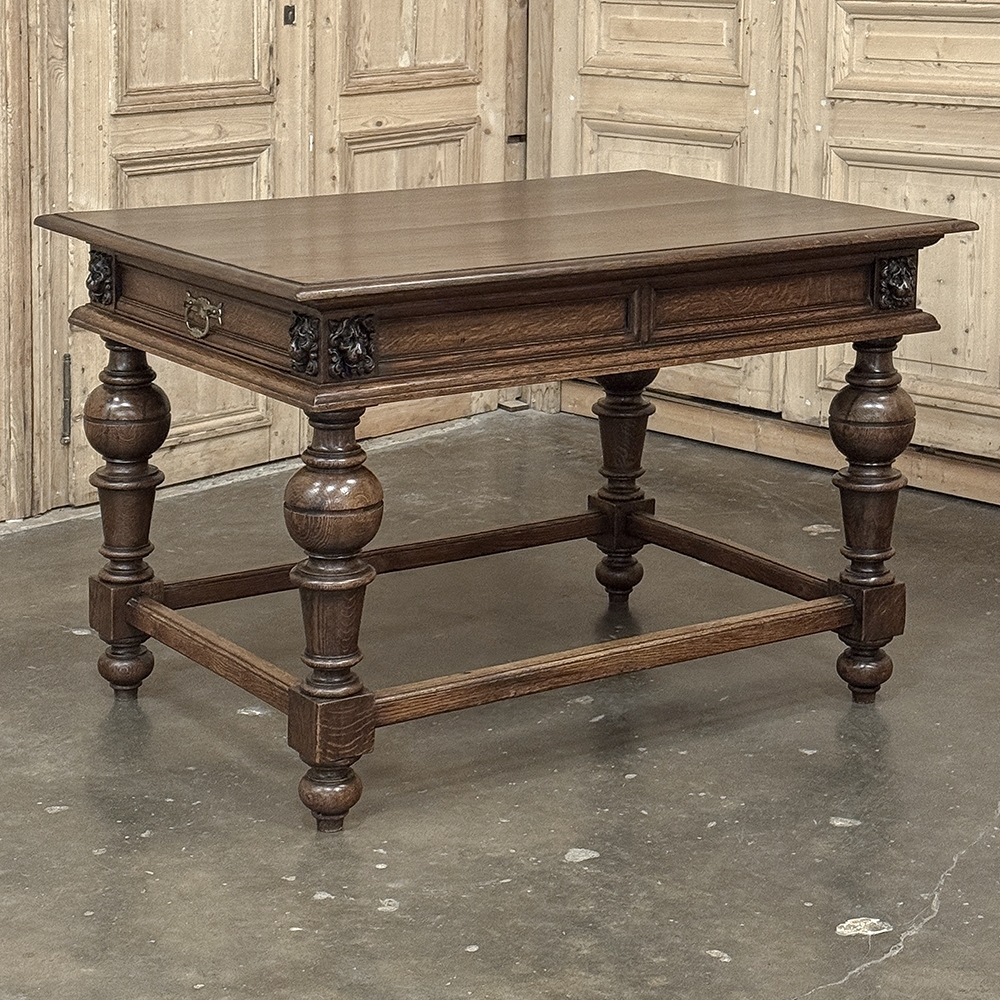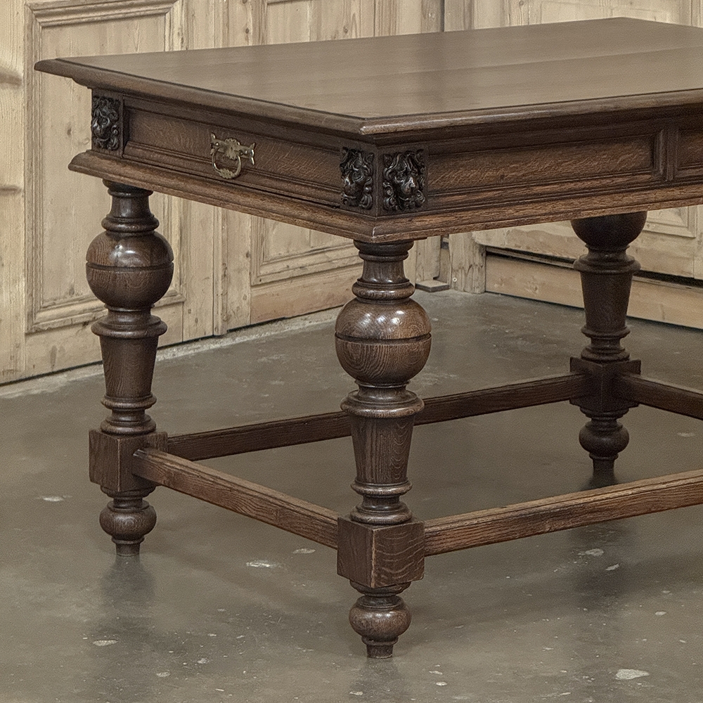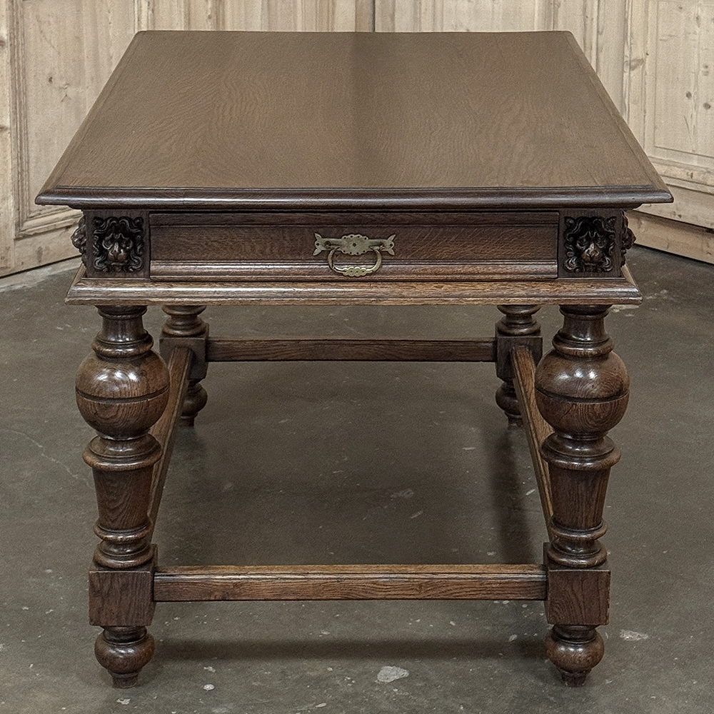 Sale19th Century Dutch Colonial End Table is the perfect choice for adding an Old World touch to any room! Use it in an entryway, library, bedroom, family room or anywhere a nicely sized surface and storage are needed, with the addition of timeless, classical architecture. Rendered from indigenous old-growth oak, it features a solid plank top with a tailored panel apron underneath, on all four sides, with one short side being a full size drawer fitted with an intriguing hand-cast brass bale pull with guard. Flanking each apron atop the legs appear eight lions' heads in full relief. The legs are a marvelous combination of an orb form atop a faceted, tapered pillar set upon square plinth blocks that are connected around the perimeter with stretchers, finishing with turned urn-shaped feet. Literally designed to last for centuries, it is destined to become an instant family heirloom!
