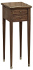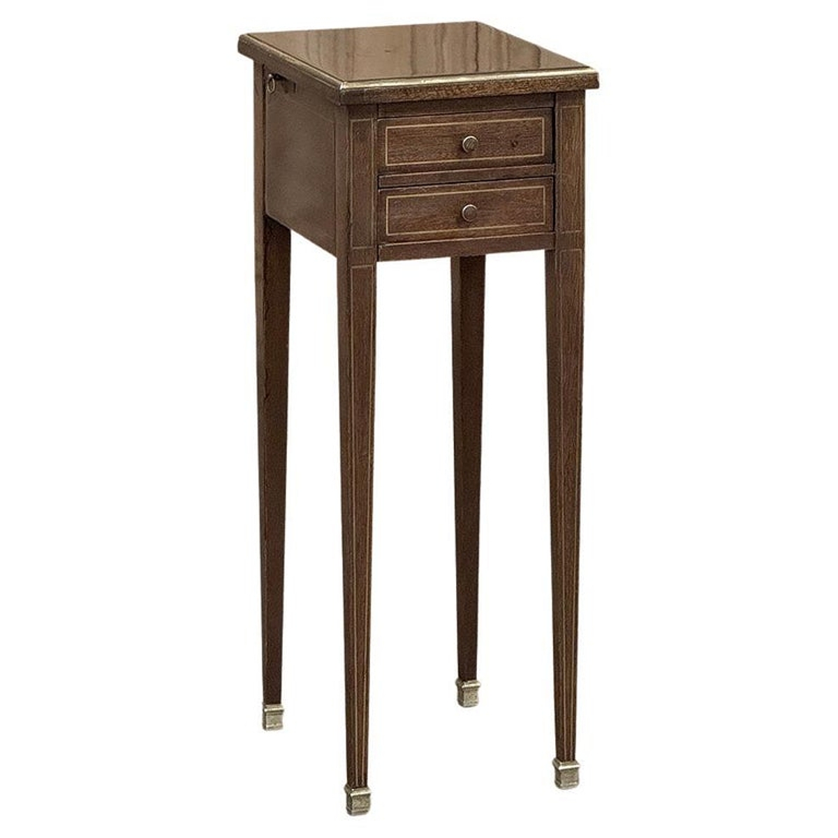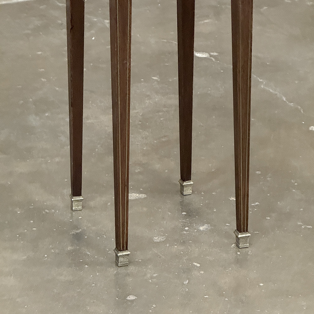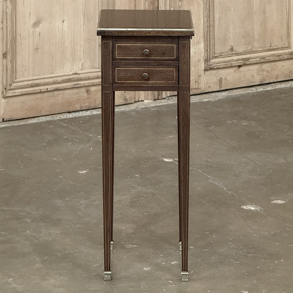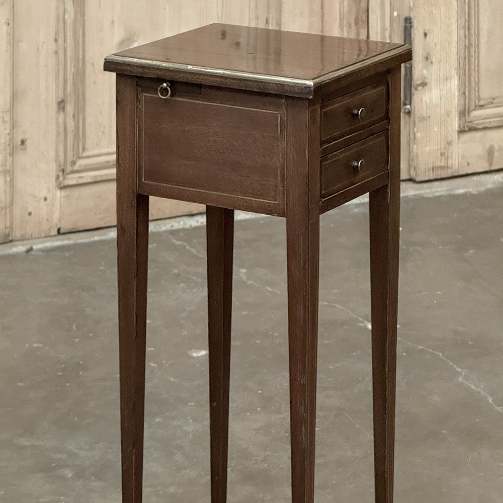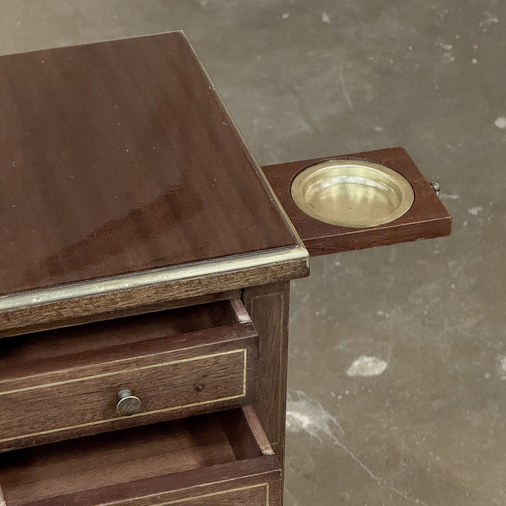 19th Century English Mahogany Gentleman's Side Table is a cleverly designed piece, indeed! Its diminutive size makes it ideal for placement between armchairs or in any seating group. Its tailored, Georgian style makes it work with any classic-oriented decor. The richness of the exotic imported mahogany is plain to see on all four sides, and is enhanced on all four sides by flat brass wire inlay bordering. The same bordering outlines the two little drawers in front, each fitted with brass knobs. Brass rings on the sides access pull-out drink holders, with convenient brass inserts serving as coasters! Even the solid mahogany top is trimmed in brass quarter-round molding. The elegantly tapered legs are also tipped with brass feet to finish off the look.