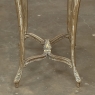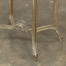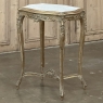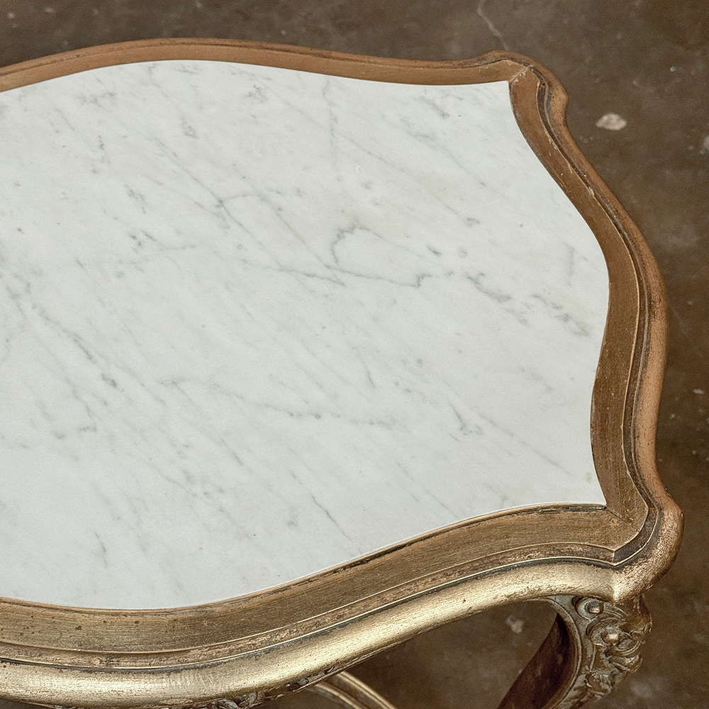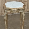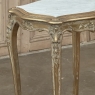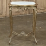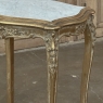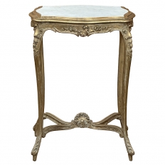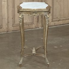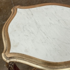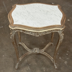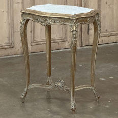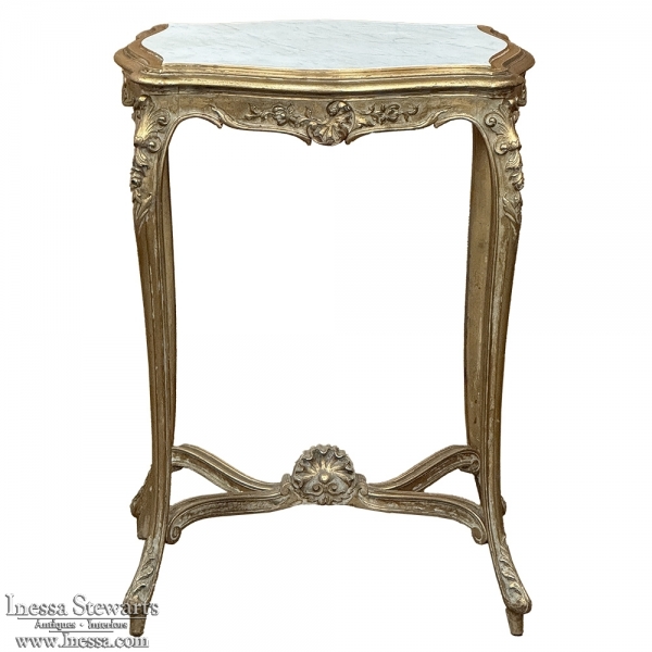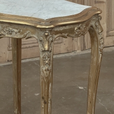 19th Century French Louis XV Marble Top Giltwood End Table is a prime example of fine French furniture craftsmanship!  Sculpted from fine fruitwood, it features the graceful, naturalistic form of the style with the only straight line being the surface of the elegant Carrara marble top.  All other lines are elegantly scrolled, including the violin-shaped top with three tiers of edge molding, the aprons bowed on all sides and contoured at the bottom, the classic cabriole legs that curve and taper down to the leg tips carved with upturned acanthus plumes, all connected with scrolled and bowed stretchers centered with a Rococo-inspired shell motif facing both sides.  The shoulders of the cabriole legs are lavished with acanthus plumes in the form of a fleur de lys, with floral and foliates emanating from below, providing a framework for the aprons carved with asymmetrical shell and floral sprays in bold relief.  The entire piece is enhanced with the gold finish that has achieved a lovely, distressed patina over the decades ~ only adding to the allure!