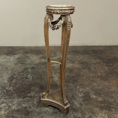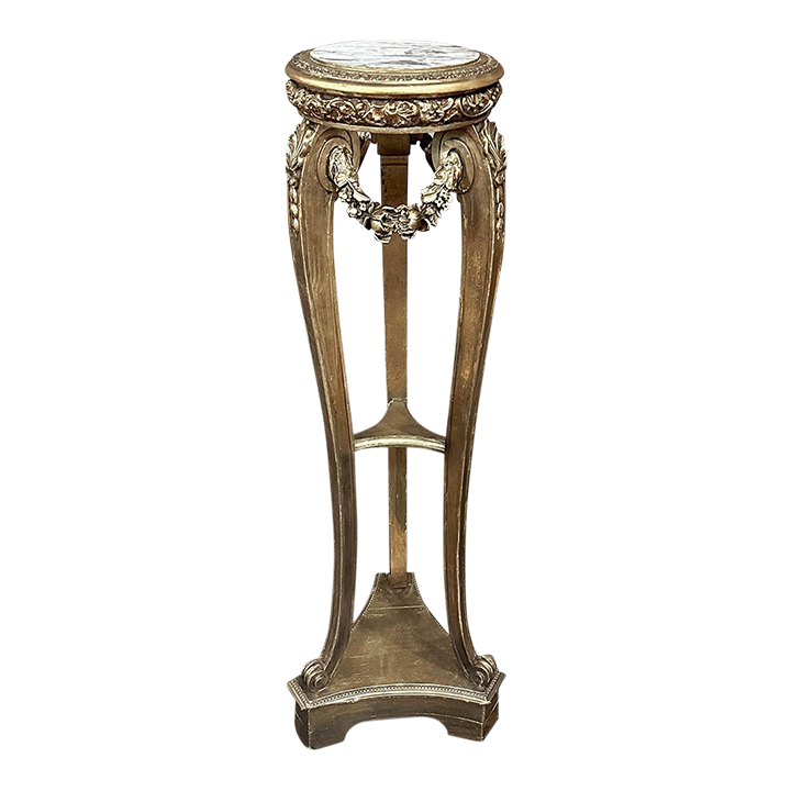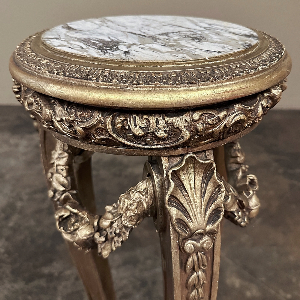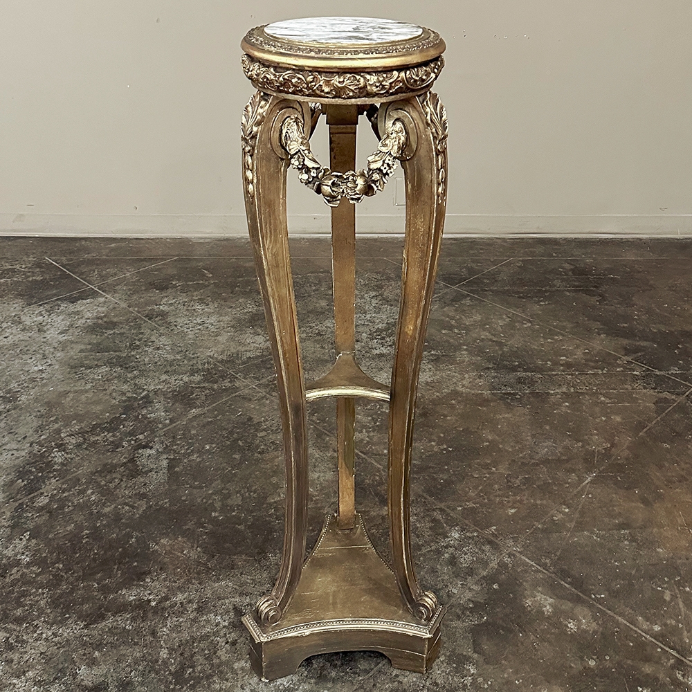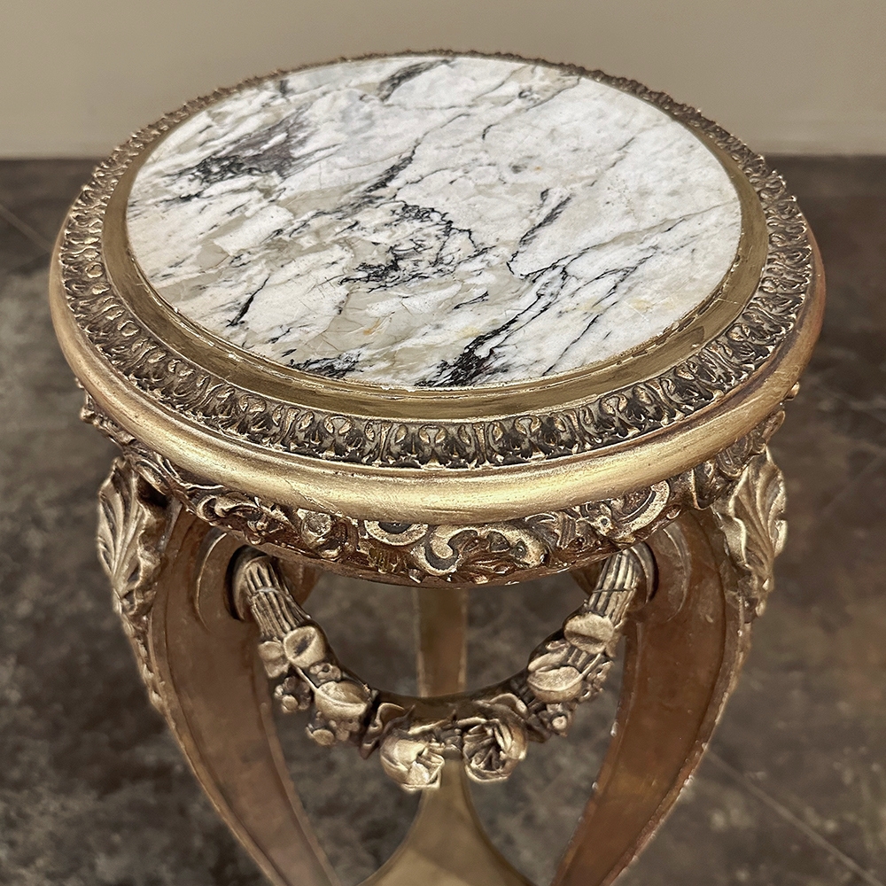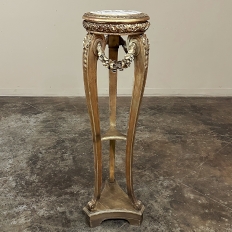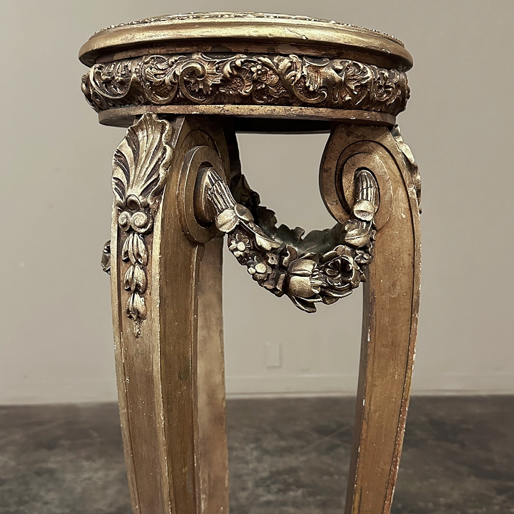 19th Century French Louis XVI Giltwood Marble Top Pedestal is a beautiful work of the furniture crafter's art all unto itself, yet designed to elevate and display your prized sculpture, faience, delft vase, or any keepsake and objet d'art you deem worthy of attention! Exquisite foliate detail abounds in the apron surrounding the marble top framed with acanthus leaf gadrooning. Floral garlands hang between the boldly scrolled legs, which are embellished with bold scallop shell and bell flower carvings. The legs continue down to escargot scrolls and a tripod base below. The surface height is designed to elevate your special piece above the surroundings so it can be noticed from anywhere in the room, regardless of whether the observer is seated or standing. Timeless!