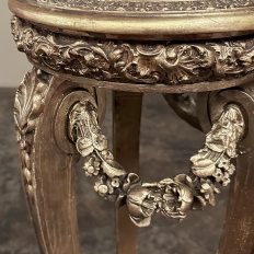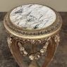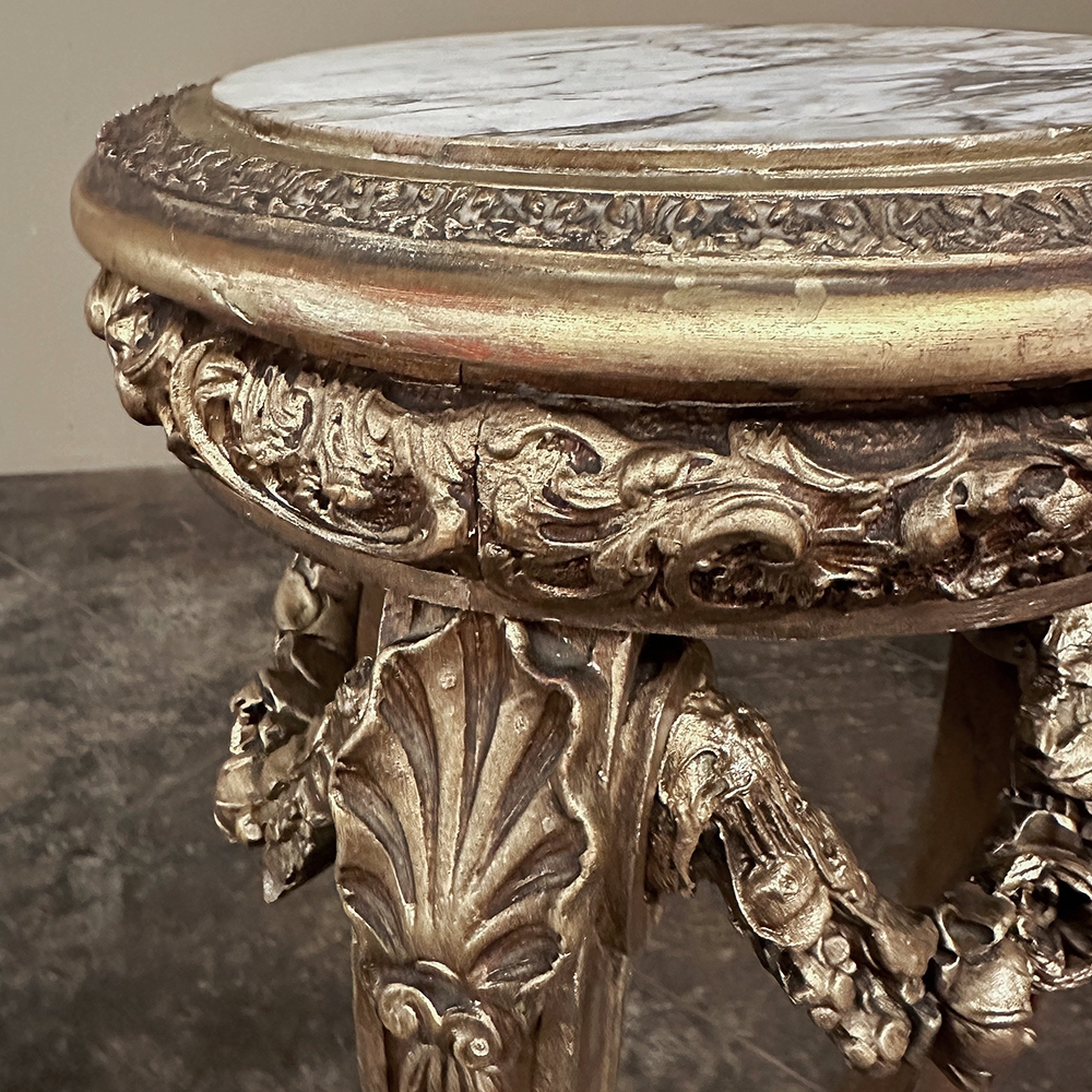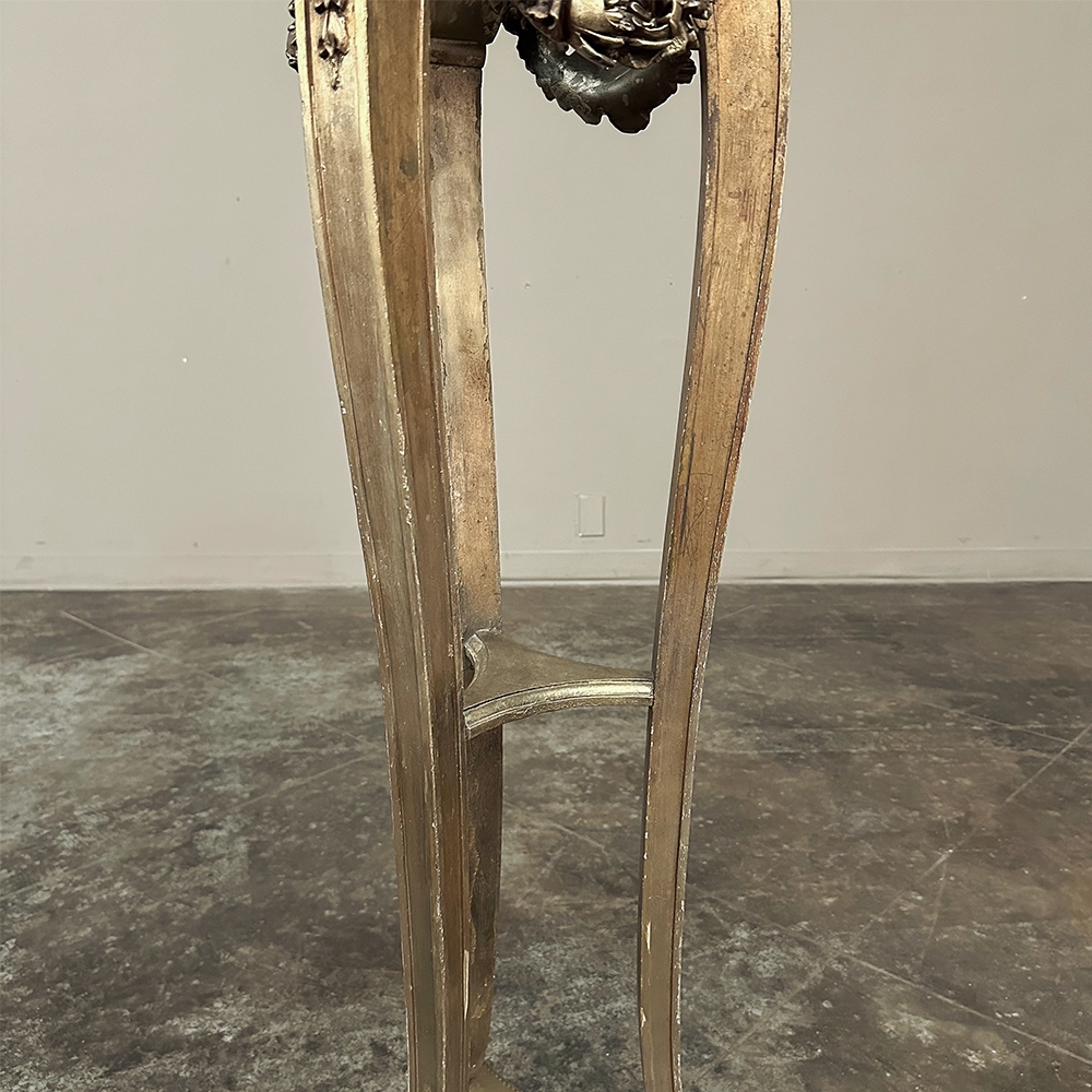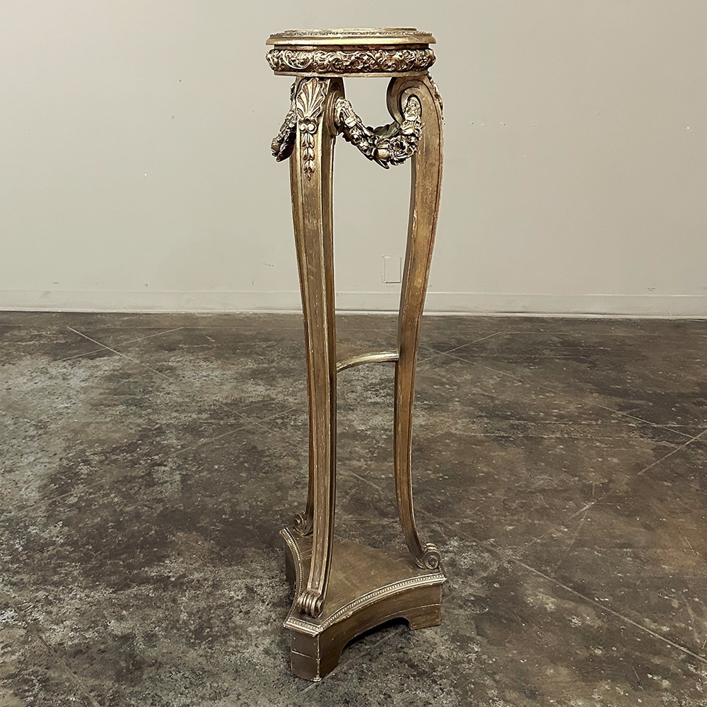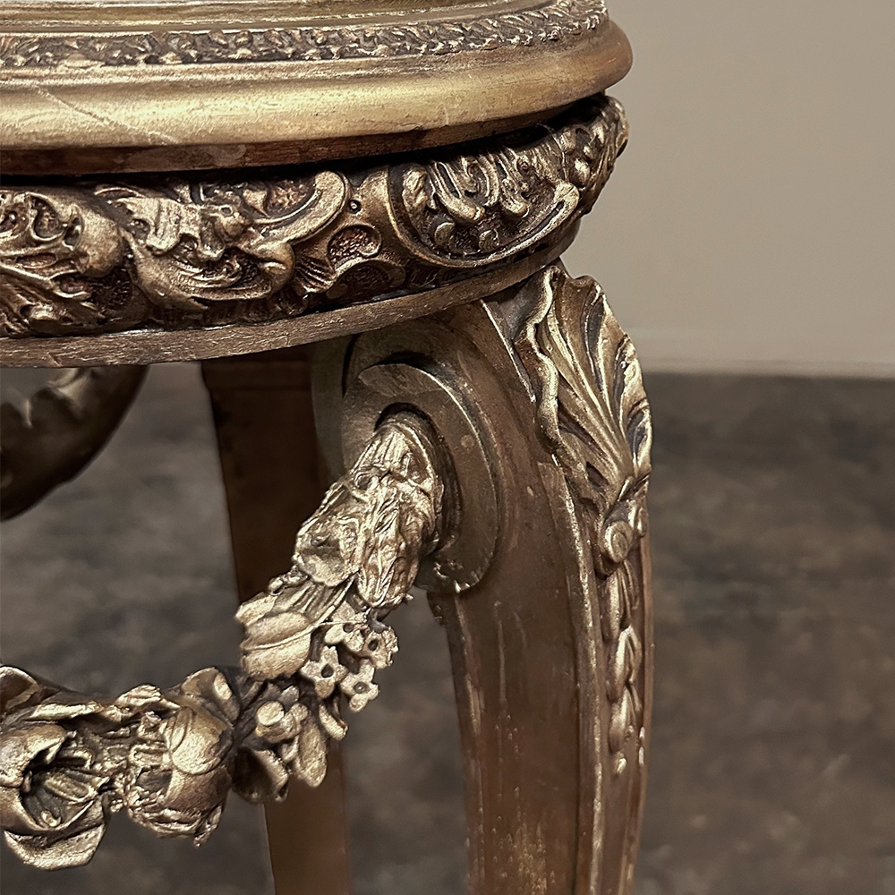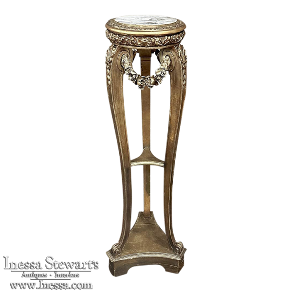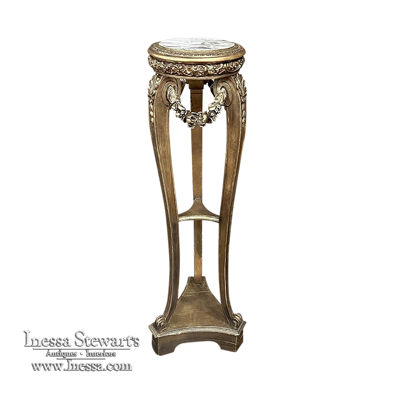 19th Century French Louis XVI Giltwood Marble Top Pedestal is a beautiful work of the furniture crafter's art all unto itself, yet designed to elevate and display your prized sculpture, faience, delft vase, or any keepsake and objet d'art you deem worthy of attention! Exquisite foliate detail abounds in the apron surrounding the marble top framed with acanthus leaf gadrooning. Floral garlands hang between the boldly scrolled legs, which are embellished with bold scallop shell and bell flower carvings. The legs continue down to escargot scrolls and a tripod base below. The surface height is designed to elevate your special piece above the surroundings so it can be noticed from anywhere in the room, regardless of whether the observer is seated or standing. Timeless!