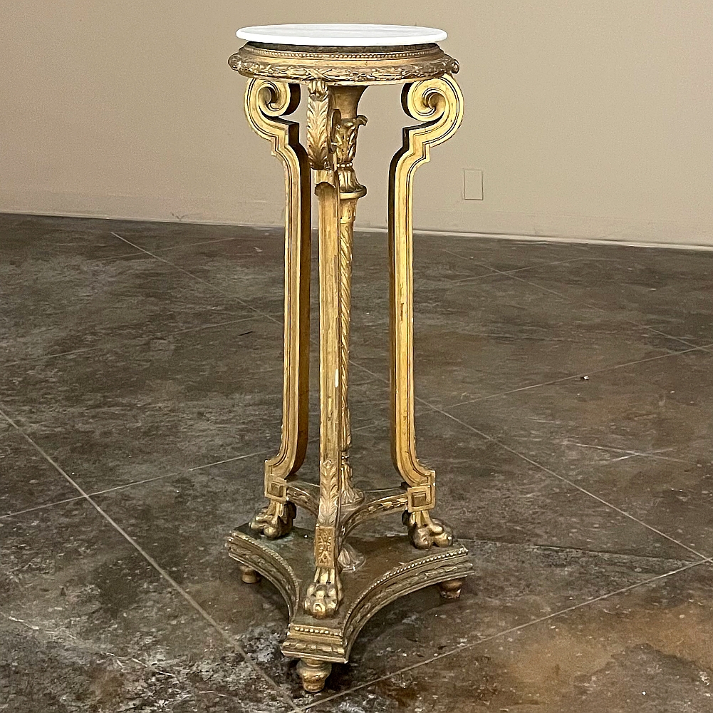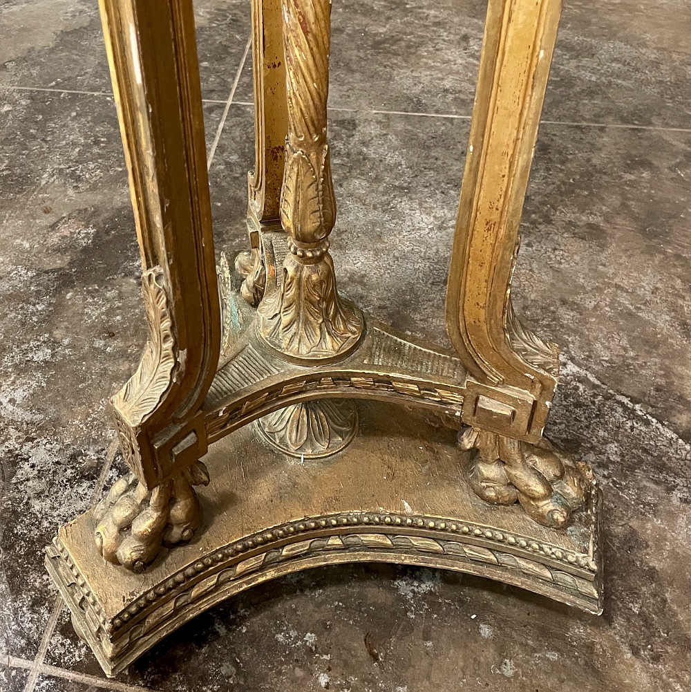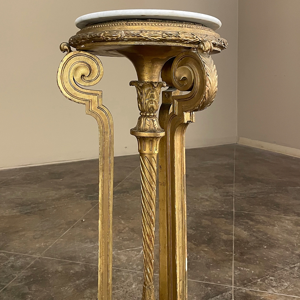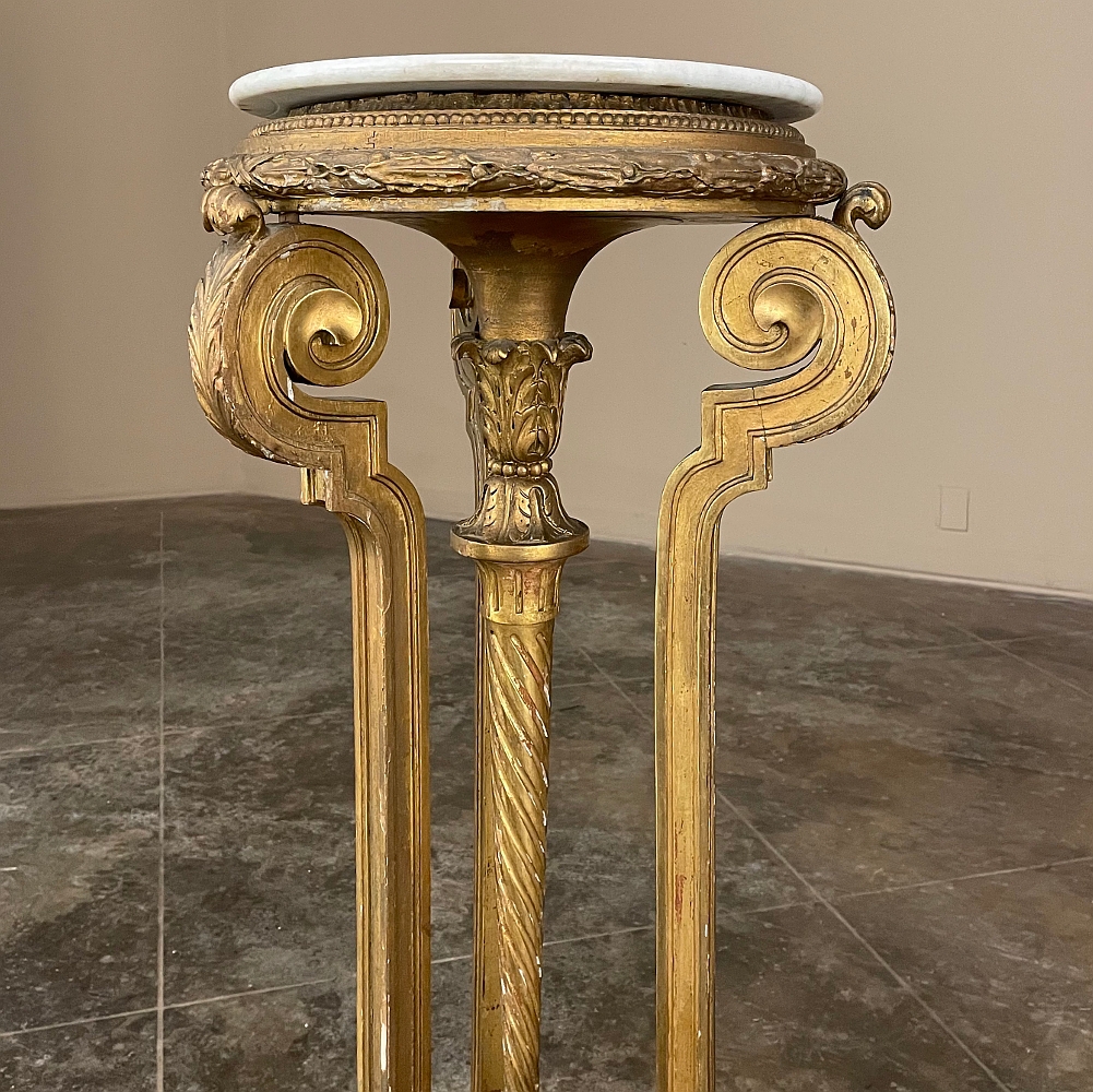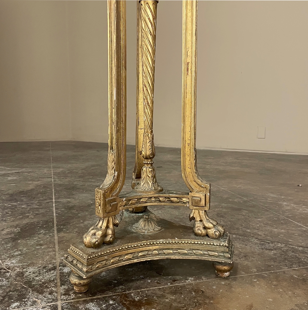 19th Century French Louis XVI Giltwood Pedestal with Carrara Marble Top is the perfect display vehicle to show off your statuary, vase or objet d'art! Neoclassical styling pervades the design, which it topped by white Carrara marble with subtle light gray veining. Underneath, three tiers of molded detail include beading and laurel wreath. Support is provided by a central shaft adorned with acanthus plumes arranged in an urn form above a tapered column with spiral flutes, in combination with three scrolled outboard uprights that are also adorned with acanthus leaf motif in bold relief. At the two tiered base we see a triangular form connecting all four uprights, adorned with more acanthus motifs with the three outboard uprights terminating in lion's paw feet, all resting on a secondary triangular platform adorned with an acanthus finial at the center, and trimmed with beading and spiral ribbon around the entire perimeter. Turned feet finish the effect.