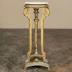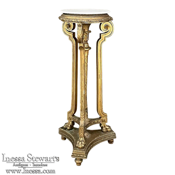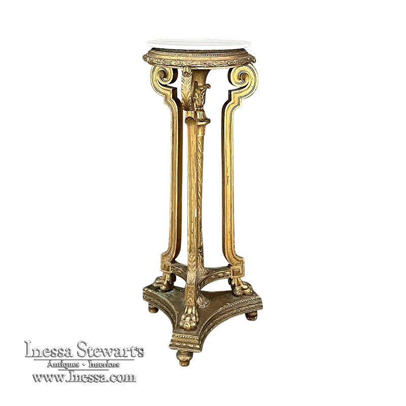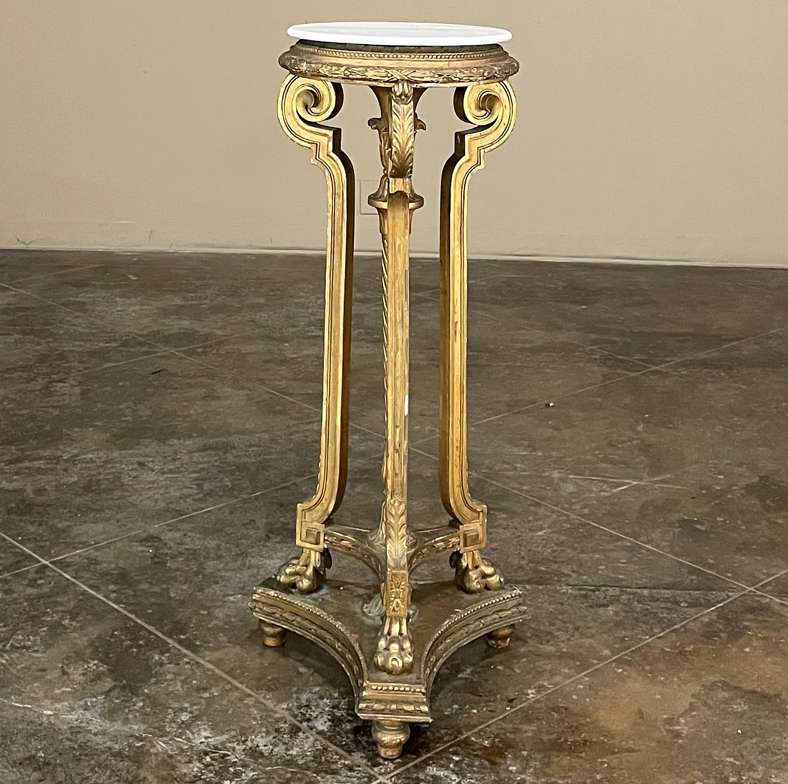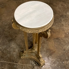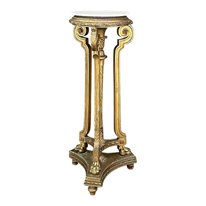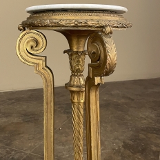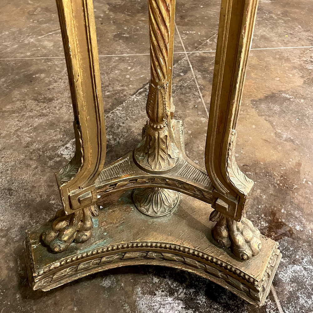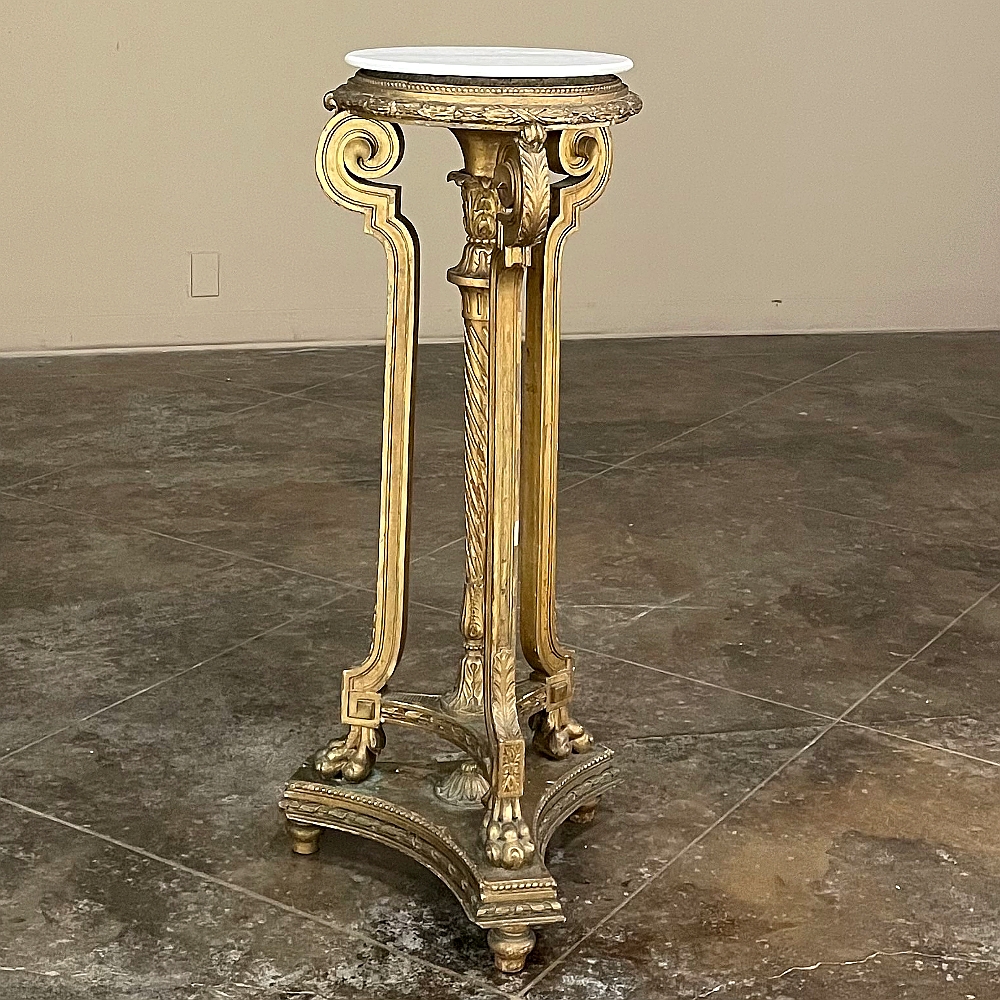 19th Century French Louis XVI Giltwood Pedestal with Carrara Marble Top is the perfect display vehicle to show off your statuary, vase or objet d'art! Neoclassical styling pervades the design, which it topped by white Carrara marble with subtle light gray veining. Underneath, three tiers of molded detail include beading and laurel wreath. Support is provided by a central shaft adorned with acanthus plumes arranged in an urn form above a tapered column with spiral flutes, in combination with three scrolled outboard uprights that are also adorned with acanthus leaf motif in bold relief. At the two tiered base we see a triangular form connecting all four uprights, adorned with more acanthus motifs with the three outboard uprights terminating in lion's paw feet, all resting on a secondary triangular platform adorned with an acanthus finial at the center, and trimmed with beading and spiral ribbon around the entire perimeter. Turned feet finish the effect.