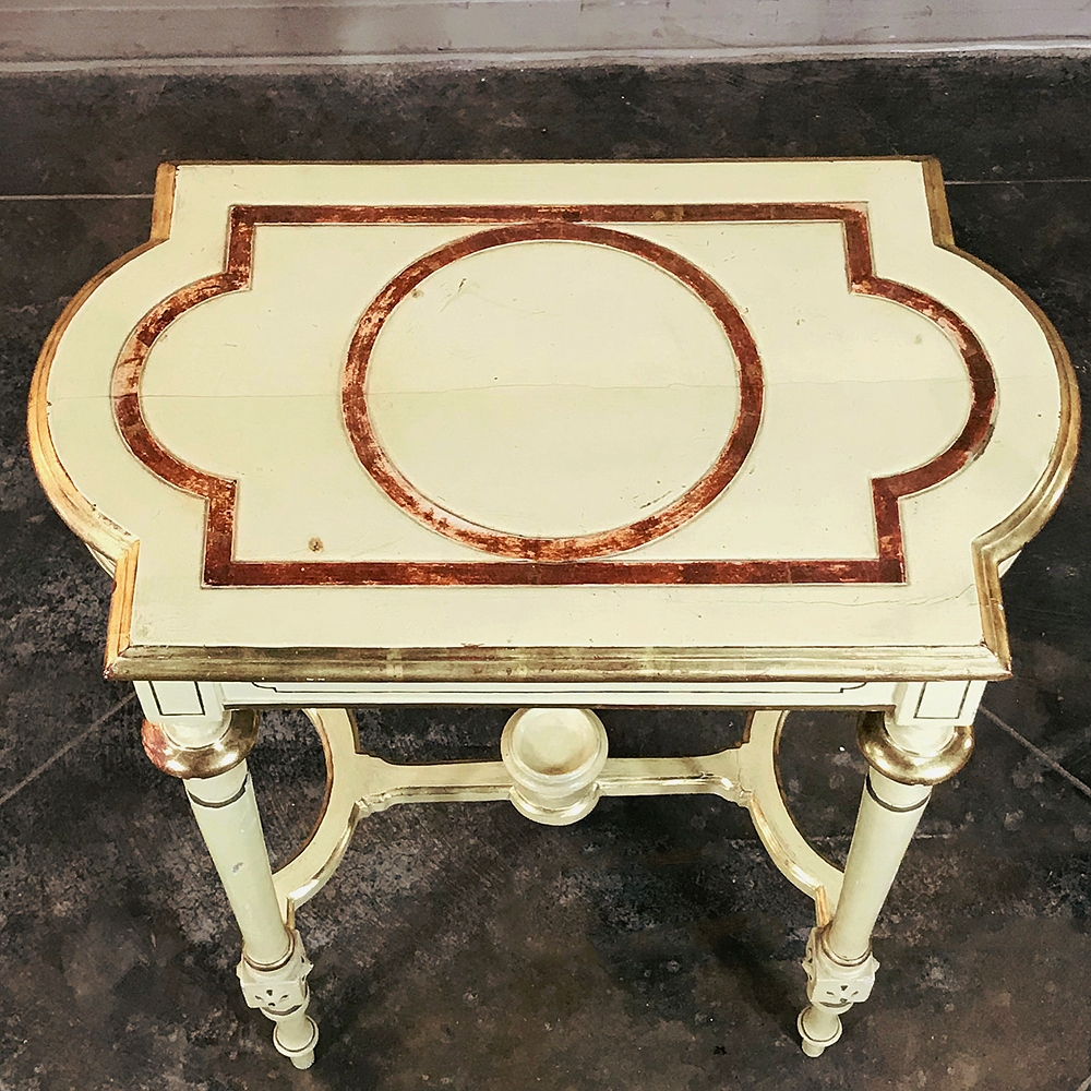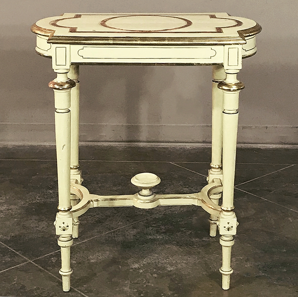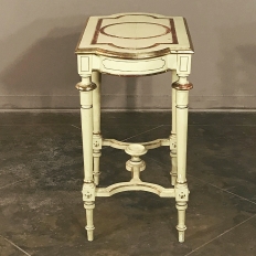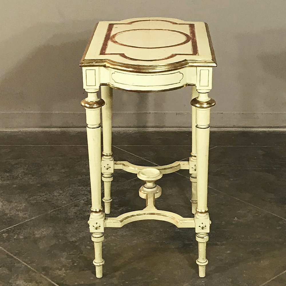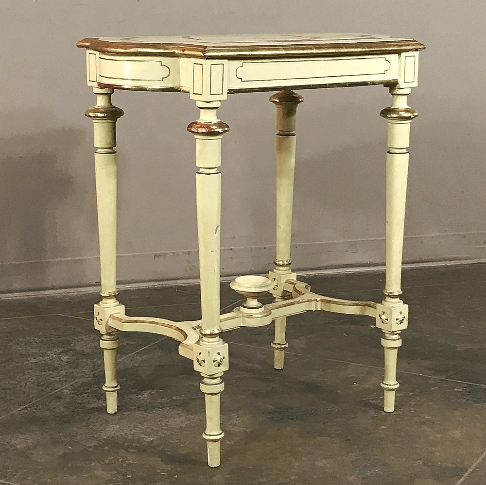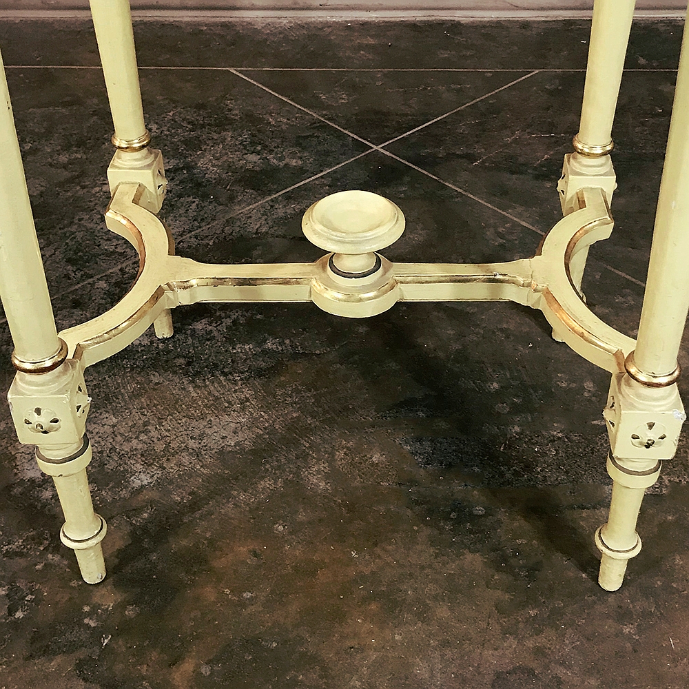19th Century French Louis XVI Painted & Gilded End Table is just the right choice for adding a light and airy yet stylish decorating touch, plus a wonderful surface upon which you can place other decorative items, lamps, etc. Even the legs and stretchers below are finely carved, with the original painted finish highlighted in gold.