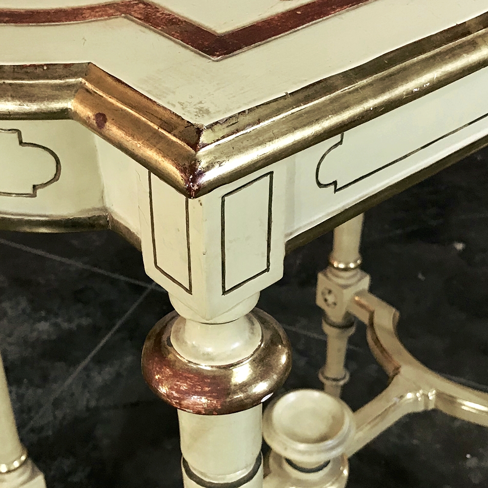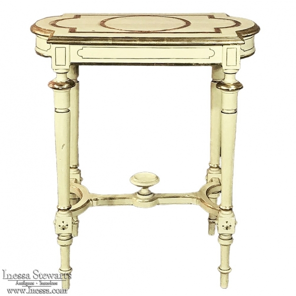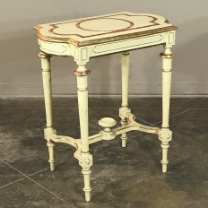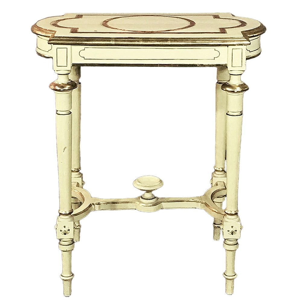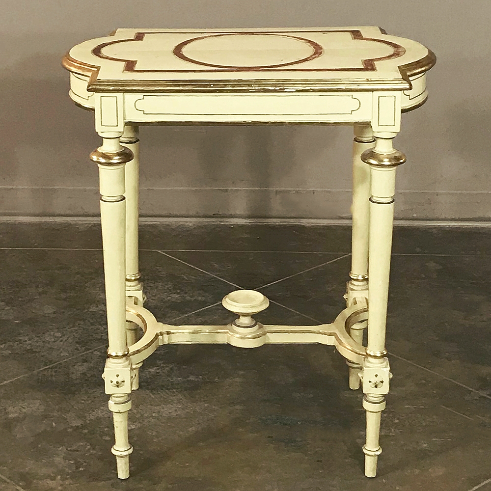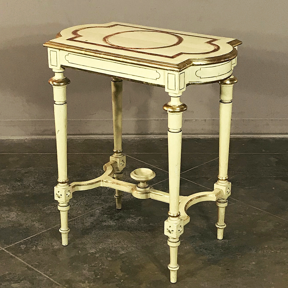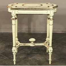 19th Century French Louis XVI Painted & Gilded End Table is just the right choice for adding a light and airy yet stylish decorating touch, plus a wonderful surface upon which you can place other decorative items, lamps, etc. Even the legs and stretchers below are finely carved, with the original painted finish highlighted in gold.